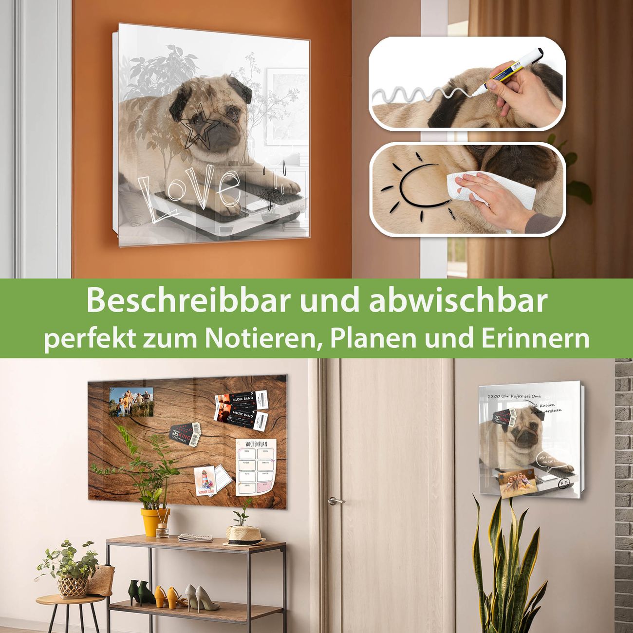 ✅ Magnetisch und mit Kreidestift beschreibbar, gehärtetes Glas, rechts angeschlagene TürOrdnung und Design in einem