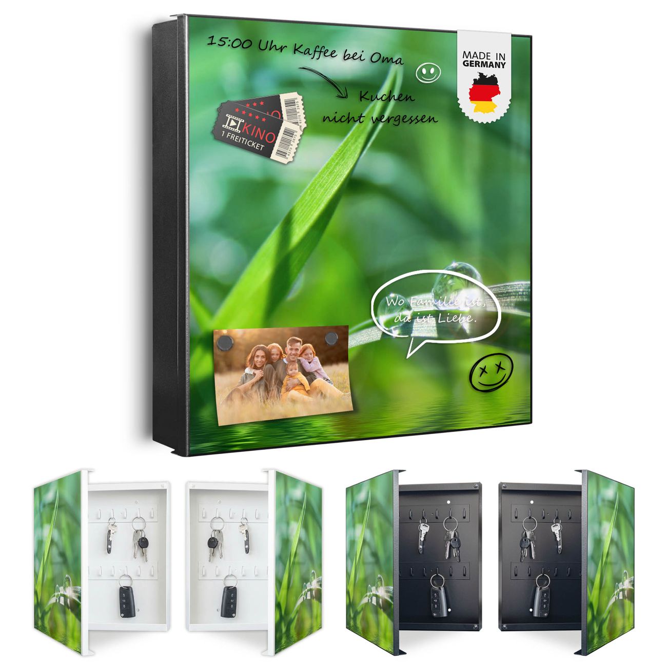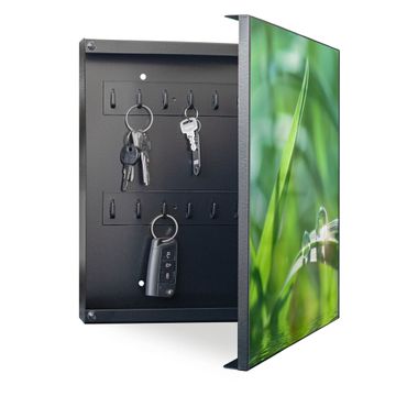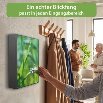 Bringe Ordnung und Eleganz in deinen Eingangsbereich mit dem banjado Schlüsselkasten Motiv Motiv Morgentau. Die moderne Schlüsselbox kombiniert funktionales Design mit hochwertiger Verarbeitung und wird so zu einem echten Hingucker in Flur, Büro oder Ferienwohnung. ✅ Stilvolle Schlüsselaufbewahrung mit Motiv Motiv Morgentau Der Design-Schlüsselkasten Motiv Motiv Morgentau bietet Platz für bis zu 32 Schlüssel, die auf 4 stabilen Reihen mit je 8 Haken übersichtlich verstaut werden. Mit seinen kompakten Maßen von 30 x 30 x 5 cm passt die Schlüsselbox perfekt auch in kleinere Räume. Der schwarz lackierte Stahlkorpus mit rechts angeschlagenem Türscharnier harmoniert mit gedruckten Folie auf der Front und fügt sich nahtlos in jedes Wohnambiente ein. Ob als Schlüsselorganizer für Zuhause oder als praktische Lösung für Büros, Praxen und Gewerbe, der banjado Schlüsselkasten sorgt für Ordnung und Übersicht. Dank der magnetischen, mit Kreidestiften beschreibbaren Folie auf der Front kannst du Notizen anheften oder Termine direkt auf der Oberfläche festhalten. Die Schlüsselbox Motiv Motiv Morgentau zur Wandmontage wird inklusive Befestigungsmaterial geliefert und ist schnell angebracht. So hast du deine Schlüssel jederzeit griffbereit und zugleich stilvoll verstaut. Mit diesem banjado Schlüsselkasten Motiv Motiv Morgentau kombinierst du praktische Aufbewahrung mit stilvollem Wohndesign. Ob privat oder geschäftlich, die Schlüsselbox sorgt für mehr Ordnung, Übersicht und ein wohnliches Ambiente.Vorteile im Überblick