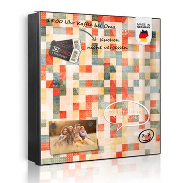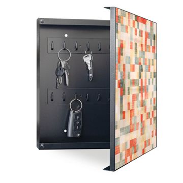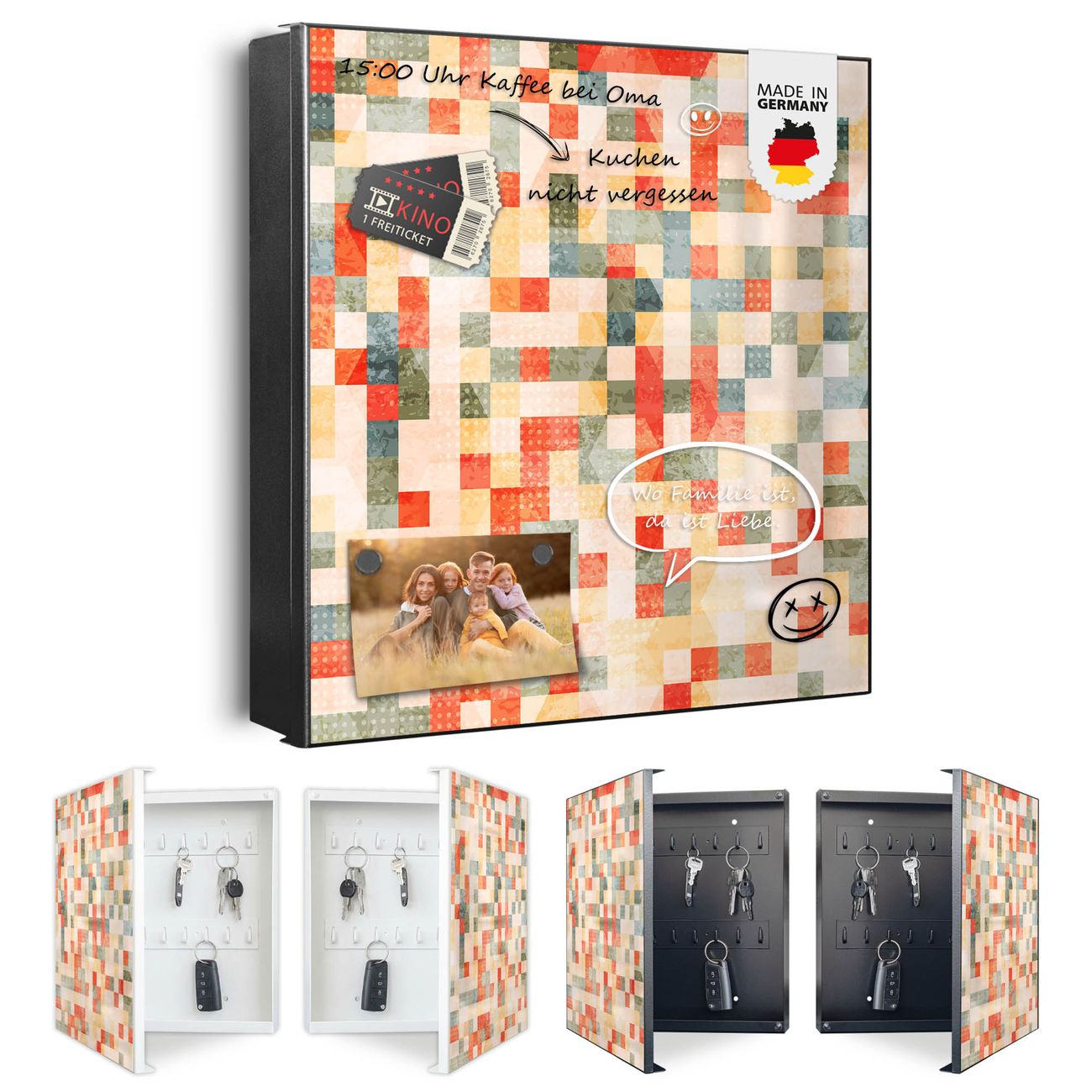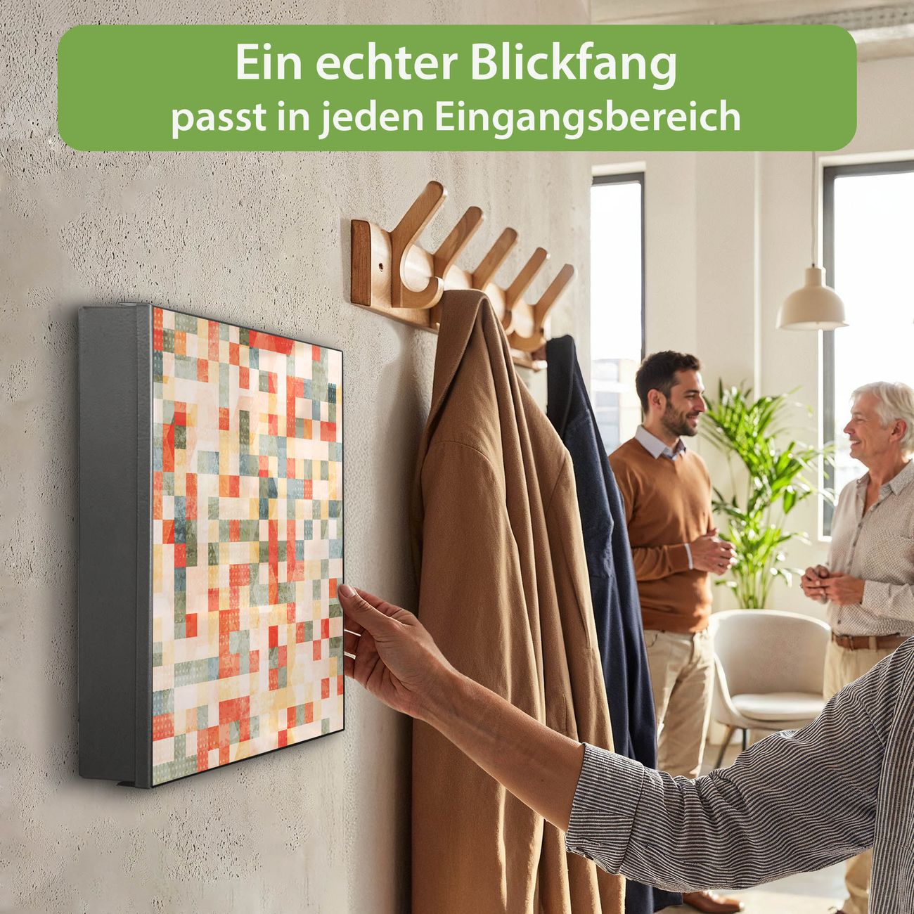 Bringe Ordnung und Eleganz in deinen Eingangsbereich mit dem banjado Schlüsselkasten Motiv Motiv Mosaik Rot. Die moderne Schlüsselbox kombiniert funktionales Design mit hochwertiger Verarbeitung und wird so zu einem echten Hingucker in Flur, Büro oder Ferienwohnung. ✅ Stilvolle Schlüsselaufbewahrung mit Motiv Motiv Mosaik Rot Der Design-Schlüsselkasten Motiv Motiv Mosaik Rot bietet Platz für bis zu 32 Schlüssel, die auf 4 stabilen Reihen mit je 8 Haken übersichtlich verstaut werden. Mit seinen kompakten Maßen von 30 x 30 x 5 cm passt die Schlüsselbox perfekt auch in kleinere Räume. Der schwarz lackierte Stahlkorpus mit rechts angeschlagenem Türscharnier harmoniert mit gedruckten Folie auf der Front und fügt sich nahtlos in jedes Wohnambiente ein. Ob als Schlüsselorganizer für Zuhause oder als praktische Lösung für Büros, Praxen und Gewerbe, der banjado Schlüsselkasten sorgt für Ordnung und Übersicht. Dank der magnetischen, mit Kreidestiften beschreibbaren Folie auf der Front kannst du Notizen anheften oder Termine direkt auf der Oberfläche festhalten. Die Schlüsselbox Motiv Motiv Mosaik Rot zur Wandmontage wird inklusive Befestigungsmaterial geliefert und ist schnell angebracht. So hast du deine Schlüssel jederzeit griffbereit und zugleich stilvoll verstaut. Mit diesem banjado Schlüsselkasten Motiv Motiv Mosaik Rot kombinierst du praktische Aufbewahrung mit stilvollem Wohndesign. Ob privat oder geschäftlich, die Schlüsselbox sorgt für mehr Ordnung, Übersicht und ein wohnliches Ambiente.Vorteile im Überblick