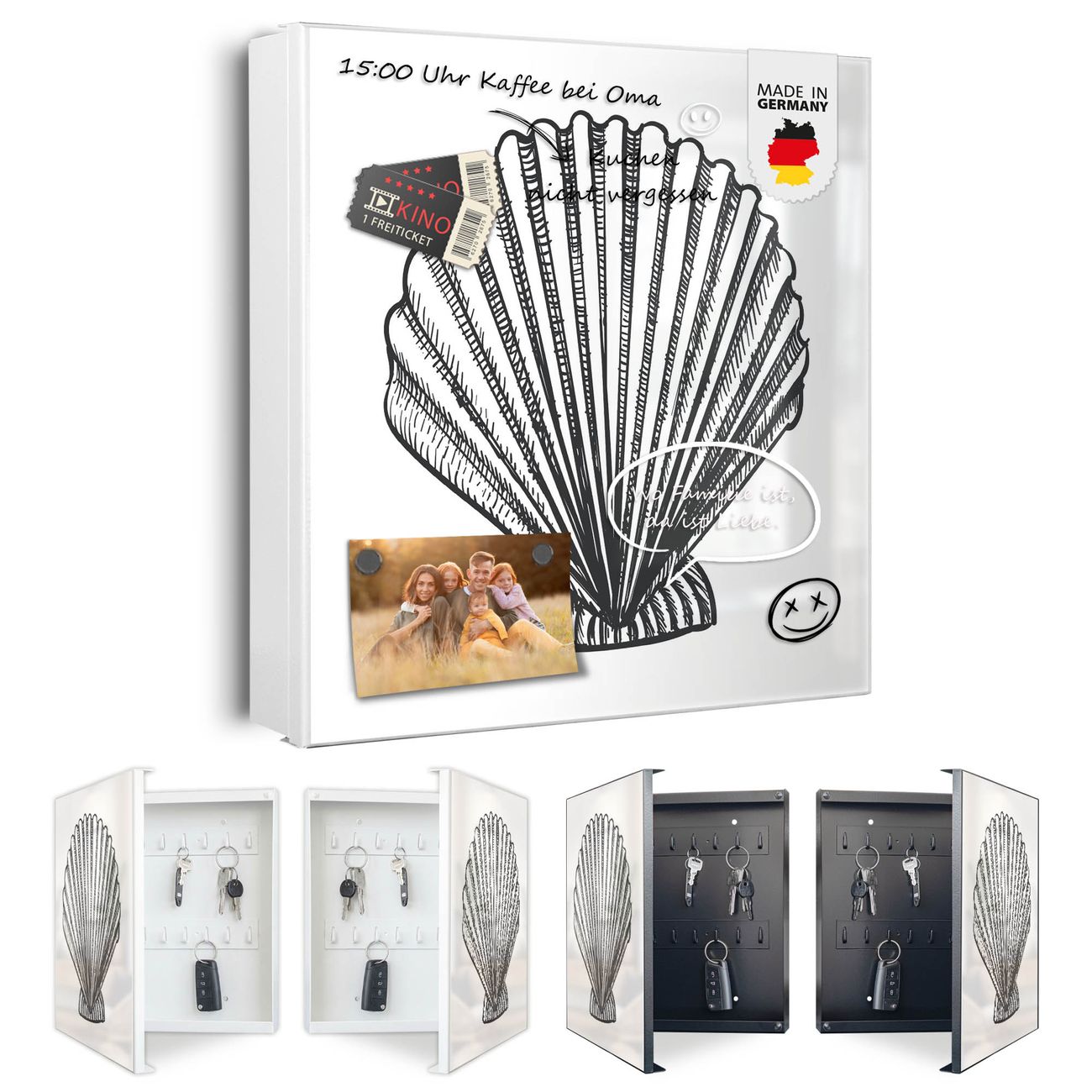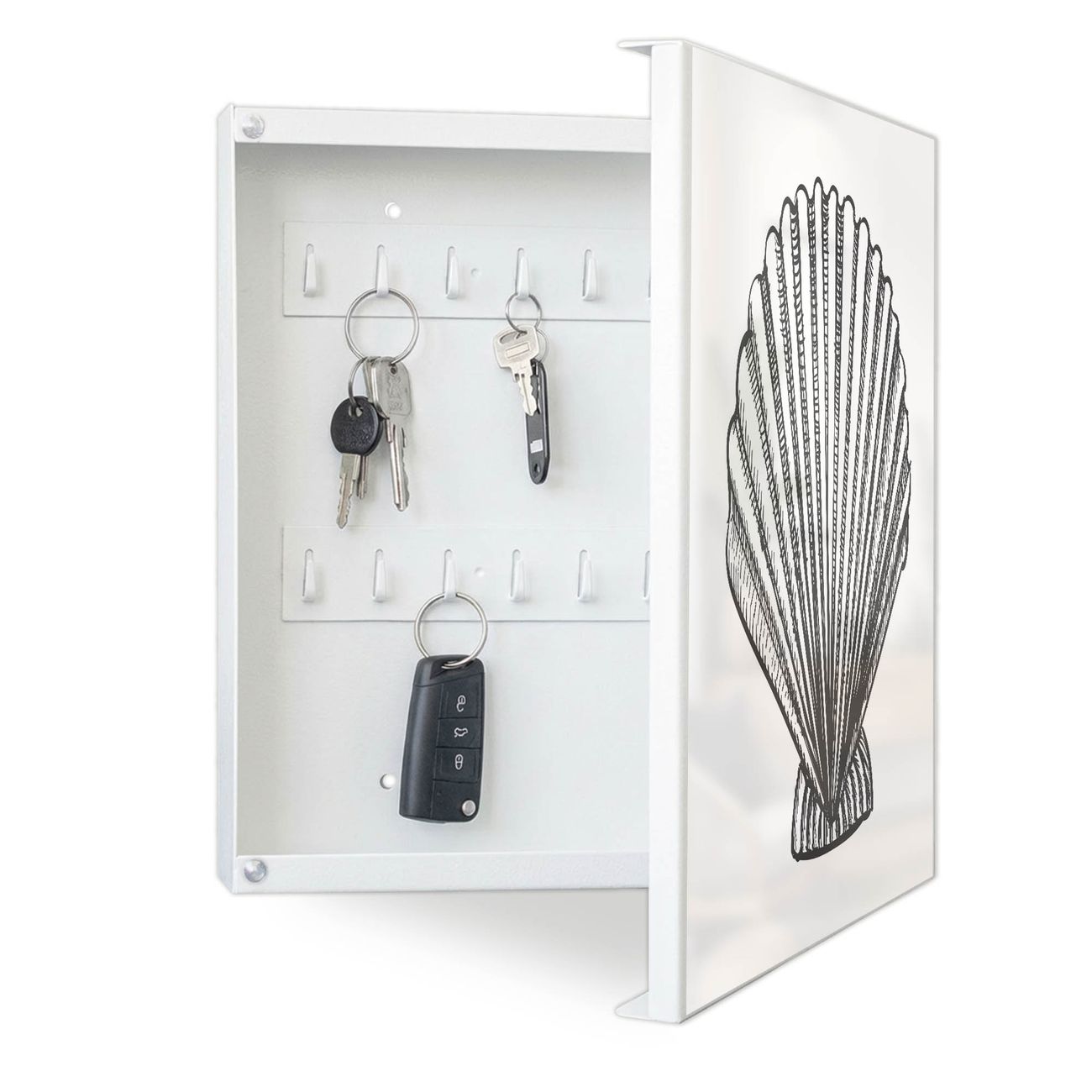 Bringe Ordnung und Eleganz in deinen Eingangsbereich mit dem banjado Schlüsselkasten Motiv Motiv Muschel 6. Die moderne Schlüsselbox kombiniert funktionales Design mit hochwertiger Verarbeitung und wird so zu einem echten Hingucker in Flur, Büro oder Ferienwohnung. ✅ Stilvolle Schlüsselaufbewahrung mit Motiv Motiv Muschel 6 Der Design-Schlüsselkasten Motiv Motiv Muschel 6 bietet Platz für bis zu 32 Schlüssel, die auf 4 stabilen Reihen mit je 8 Haken übersichtlich verstaut werden. Mit seinen kompakten Maßen von 30 x 30 x 5 cm passt die Schlüsselbox perfekt auch in kleinere Räume. Der weiß lackierte Stahlkorpus mit rechts angeschlagenem Türscharnier harmoniert mit gedruckten Folie auf der Front und fügt sich nahtlos in jedes Wohnambiente ein. Ob als Schlüsselorganizer für Zuhause oder als praktische Lösung für Büros, Praxen und Gewerbe, der banjado Schlüsselkasten sorgt für Ordnung und Übersicht. Dank der magnetischen, mit Kreidestiften beschreibbaren Folie auf der Front kannst du Notizen anheften oder Termine direkt auf der Oberfläche festhalten. Die Schlüsselbox Motiv Motiv Muschel 6 zur Wandmontage wird inklusive Befestigungsmaterial geliefert und ist schnell angebracht. So hast du deine Schlüssel jederzeit griffbereit und zugleich stilvoll verstaut. Mit diesem banjado Schlüsselkasten Motiv Motiv Muschel 6 kombinierst du praktische Aufbewahrung mit stilvollem Wohndesign. Ob privat oder geschäftlich, die Schlüsselbox sorgt für mehr Ordnung, Übersicht und ein wohnliches Ambiente.Vorteile im Überblick