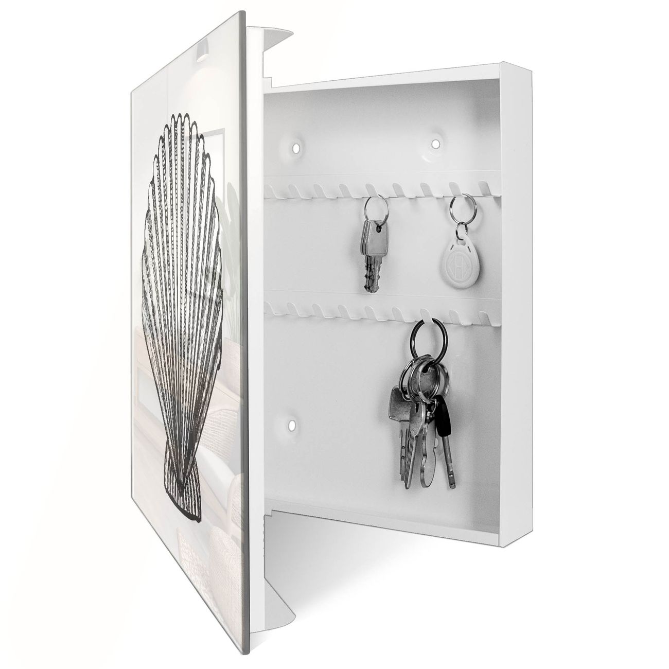 Bringe Ordnung und Eleganz in deinen Eingangsbereich mit dem banjado Schlüsselkasten Motiv Motiv Muschel 6. Die moderne Schlüsselbox kombiniert funktionales Design mit hochwertiger Verarbeitung und wird so zu einem echten Hingucker in Flur, Büro oder Ferienwohnung. ✅ Stilvolle Schlüsselaufbewahrung mit Glasfront im Motiv Motiv Muschel 6 Der Design-Schlüsselkasten Motiv Motiv Muschel 6 bietet Platz für bis zu 50 Schlüssel, die auf 5 stabilen Reihen mit je 10 Haken übersichtlich verstaut werden. Mit seinen kompakten Maßen von 30 x 30 x 5 cm passt die Schlüsselbox perfekt auch in kleinere Räume. Der weiß lackierte Stahlkorpus mit rechts angeschlagenem Türscharnier harmoniert mit der Glasfront und fügt sich nahtlos in jedes Wohnambiente ein. Ob als Schlüsselorganizer für Zuhause oder als praktische Lösung für Büros, Praxen und Gewerbe, der banjado Schlüsselkasten sorgt für Ordnung und Übersicht. Dank der magnetischen, mit Kreidestiften beschreibbaren Glasfront kannst du Notizen anheften oder Termine direkt auf der Oberfläche festhalten. Die Schlüsselbox Motiv Motiv Muschel 6 zur Wandmontage wird inklusive Befestigungsmaterial geliefert und ist schnell angebracht. So hast du deine Schlüssel jederzeit griffbereit und zugleich stilvoll verstaut. Mit diesem banjado Schlüsselkasten Motiv Motiv Muschel 6 kombinierst du praktische Aufbewahrung mit stilvollem Wohndesign. Ob privat oder geschäftlich, die Schlüsselbox sorgt für mehr Ordnung, Übersicht und ein wohnliches Ambiente.Vorteile im Überblick