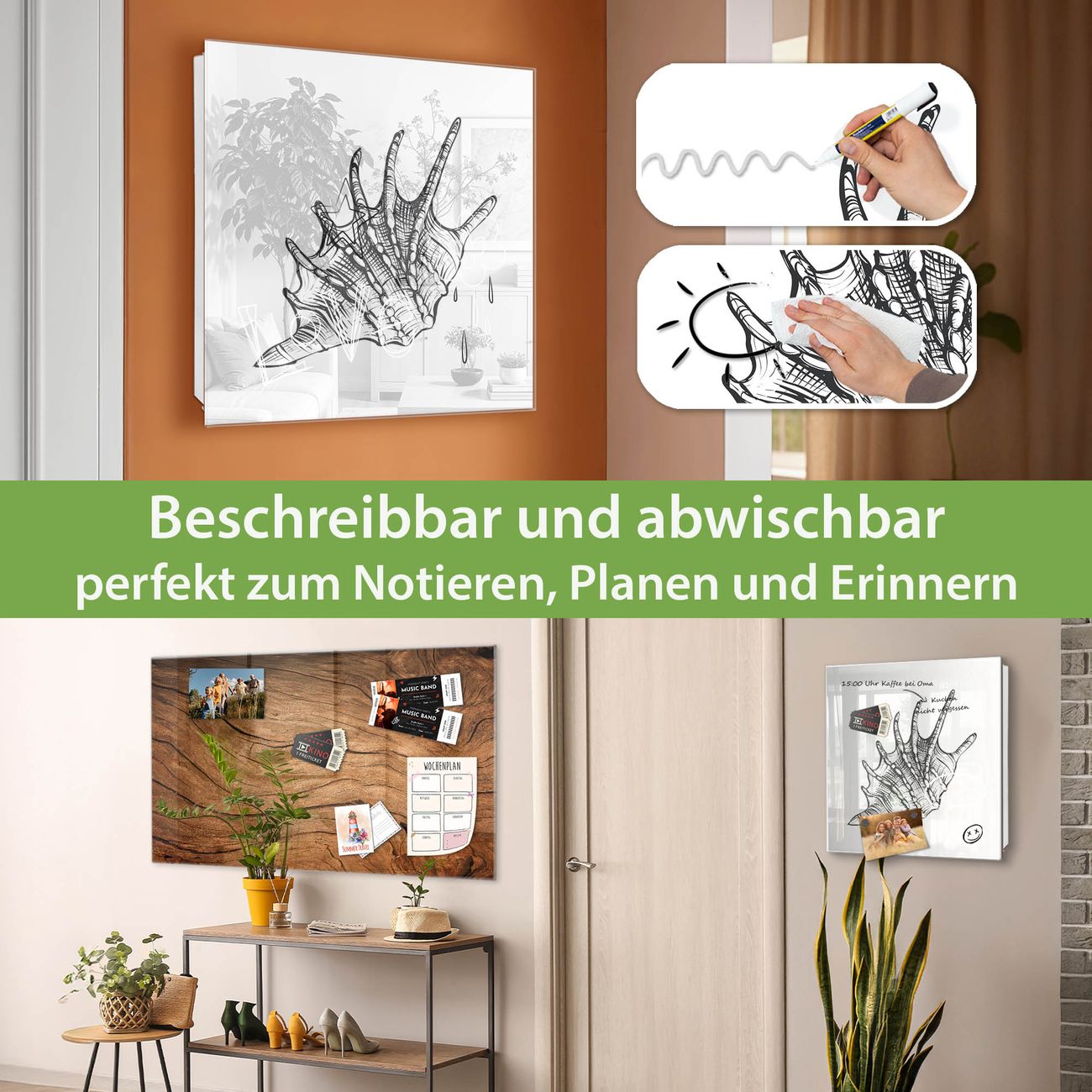 Bringe Ordnung und Eleganz in deinen Eingangsbereich mit dem banjado Schlüsselkasten Motiv Motiv Muschel 9. Die moderne Schlüsselbox kombiniert funktionales Design mit hochwertiger Verarbeitung und wird so zu einem echten Hingucker in Flur, Büro oder Ferienwohnung. ✅ Stilvolle Schlüsselaufbewahrung mit Glasfront im Motiv Motiv Muschel 9 Der Design-Schlüsselkasten Motiv Motiv Muschel 9 bietet Platz für bis zu 50 Schlüssel, die auf 5 stabilen Reihen mit je 10 Haken übersichtlich verstaut werden. Mit seinen kompakten Maßen von 30 x 30 x 5 cm passt die Schlüsselbox perfekt auch in kleinere Räume. Der weiß lackierte Stahlkorpus mit rechts angeschlagenem Türscharnier harmoniert mit der Glasfront und fügt sich nahtlos in jedes Wohnambiente ein. Ob als Schlüsselorganizer für Zuhause oder als praktische Lösung für Büros, Praxen und Gewerbe, der banjado Schlüsselkasten sorgt für Ordnung und Übersicht. Dank der magnetischen, mit Kreidestiften beschreibbaren Glasfront kannst du Notizen anheften oder Termine direkt auf der Oberfläche festhalten. Die Schlüsselbox Motiv Motiv Muschel 9 zur Wandmontage wird inklusive Befestigungsmaterial geliefert und ist schnell angebracht. So hast du deine Schlüssel jederzeit griffbereit und zugleich stilvoll verstaut. Mit diesem banjado Schlüsselkasten Motiv Motiv Muschel 9 kombinierst du praktische Aufbewahrung mit stilvollem Wohndesign. Ob privat oder geschäftlich, die Schlüsselbox sorgt für mehr Ordnung, Übersicht und ein wohnliches Ambiente.Vorteile im Überblick