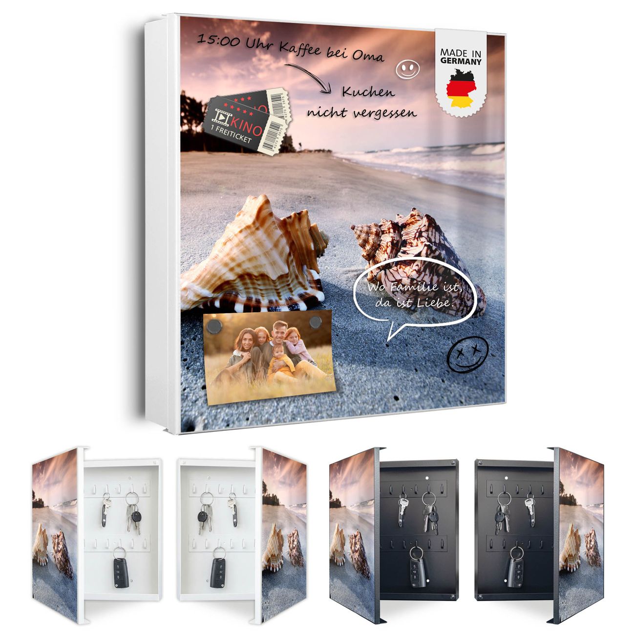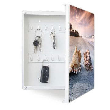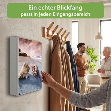 Bringe Ordnung und Eleganz in deinen Eingangsbereich mit dem banjado Schlüsselkasten Motiv Motiv Muscheln. Die moderne Schlüsselbox kombiniert funktionales Design mit hochwertiger Verarbeitung und wird so zu einem echten Hingucker in Flur, Büro oder Ferienwohnung. ✅ Stilvolle Schlüsselaufbewahrung mit Motiv Motiv Muscheln Der Design-Schlüsselkasten Motiv Motiv Muscheln bietet Platz für bis zu 32 Schlüssel, die auf 4 stabilen Reihen mit je 8 Haken übersichtlich verstaut werden. Mit seinen kompakten Maßen von 30 x 30 x 5 cm passt die Schlüsselbox perfekt auch in kleinere Räume. Der weiß lackierte Stahlkorpus mit rechts angeschlagenem Türscharnier harmoniert mit gedruckten Folie auf der Front und fügt sich nahtlos in jedes Wohnambiente ein. Ob als Schlüsselorganizer für Zuhause oder als praktische Lösung für Büros, Praxen und Gewerbe, der banjado Schlüsselkasten sorgt für Ordnung und Übersicht. Dank der magnetischen, mit Kreidestiften beschreibbaren Folie auf der Front kannst du Notizen anheften oder Termine direkt auf der Oberfläche festhalten. Die Schlüsselbox Motiv Motiv Muscheln zur Wandmontage wird inklusive Befestigungsmaterial geliefert und ist schnell angebracht. So hast du deine Schlüssel jederzeit griffbereit und zugleich stilvoll verstaut. Mit diesem banjado Schlüsselkasten Motiv Motiv Muscheln kombinierst du praktische Aufbewahrung mit stilvollem Wohndesign. Ob privat oder geschäftlich, die Schlüsselbox sorgt für mehr Ordnung, Übersicht und ein wohnliches Ambiente.Vorteile im Überblick
