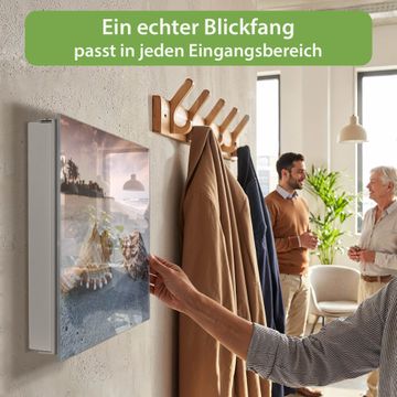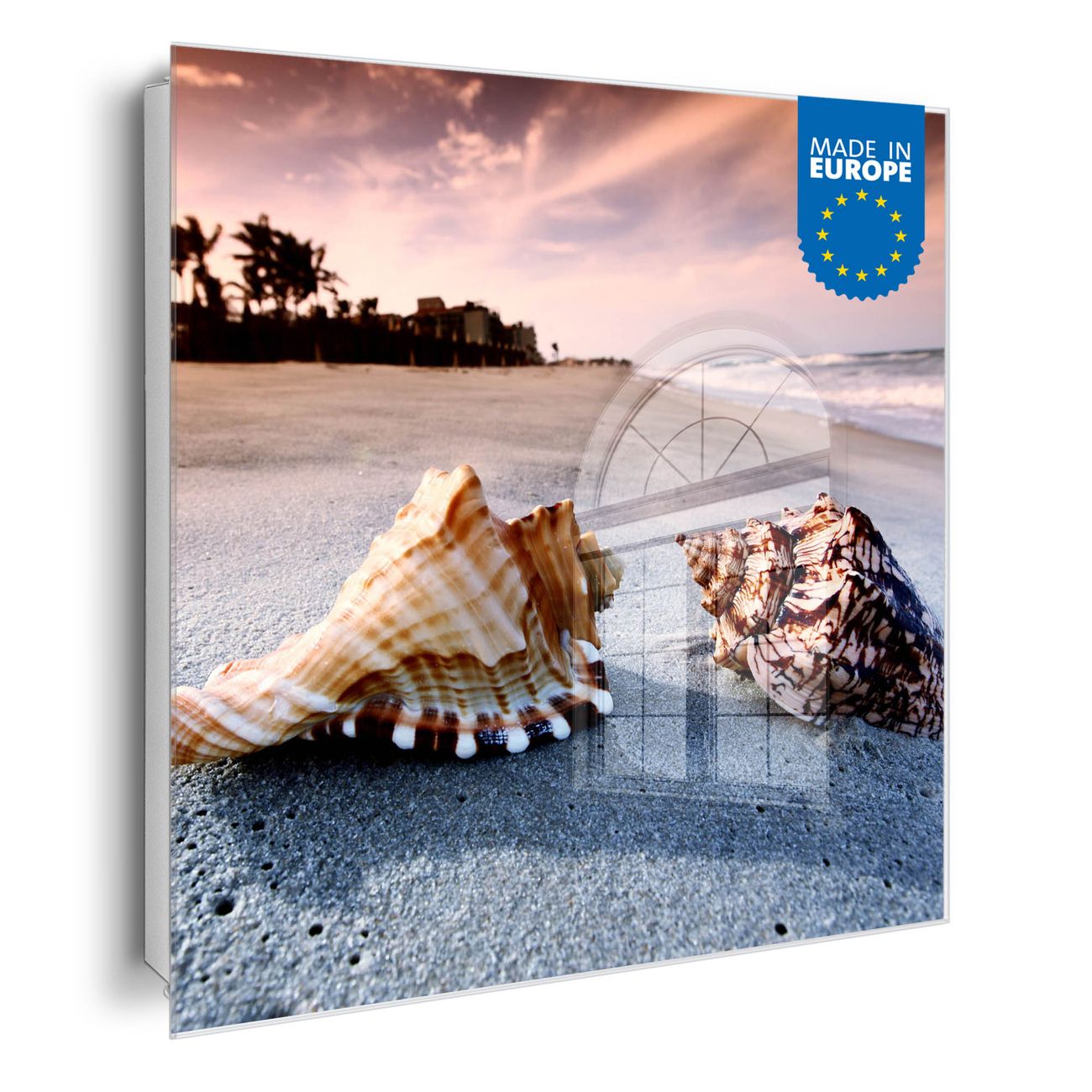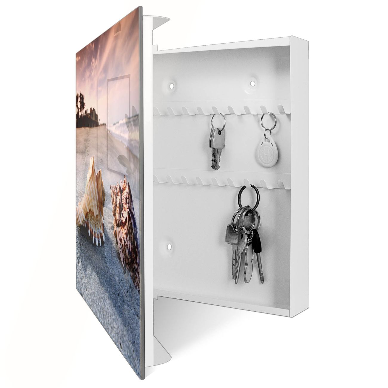 Bringe Ordnung und Eleganz in deinen Eingangsbereich mit dem banjado Schlüsselkasten Motiv Motiv Muscheln. Die moderne Schlüsselbox kombiniert funktionales Design mit hochwertiger Verarbeitung und wird so zu einem echten Hingucker in Flur, Büro oder Ferienwohnung. ✅ Stilvolle Schlüsselaufbewahrung mit Glasfront im Motiv Motiv Muscheln Der Design-Schlüsselkasten Motiv Motiv Muscheln bietet Platz für bis zu 50 Schlüssel, die auf 5 stabilen Reihen mit je 10 Haken übersichtlich verstaut werden. Mit seinen kompakten Maßen von 30 x 30 x 5 cm passt die Schlüsselbox perfekt auch in kleinere Räume. Der weiß lackierte Stahlkorpus mit rechts angeschlagenem Türscharnier harmoniert mit der Glasfront und fügt sich nahtlos in jedes Wohnambiente ein. Ob als Schlüsselorganizer für Zuhause oder als praktische Lösung für Büros, Praxen und Gewerbe, der banjado Schlüsselkasten sorgt für Ordnung und Übersicht. Dank der magnetischen, mit Kreidestiften beschreibbaren Glasfront kannst du Notizen anheften oder Termine direkt auf der Oberfläche festhalten. Die Schlüsselbox Motiv Motiv Muscheln zur Wandmontage wird inklusive Befestigungsmaterial geliefert und ist schnell angebracht. So hast du deine Schlüssel jederzeit griffbereit und zugleich stilvoll verstaut. Mit diesem banjado Schlüsselkasten Motiv Motiv Muscheln kombinierst du praktische Aufbewahrung mit stilvollem Wohndesign. Ob privat oder geschäftlich, die Schlüsselbox sorgt für mehr Ordnung, Übersicht und ein wohnliches Ambiente.Vorteile im Überblick