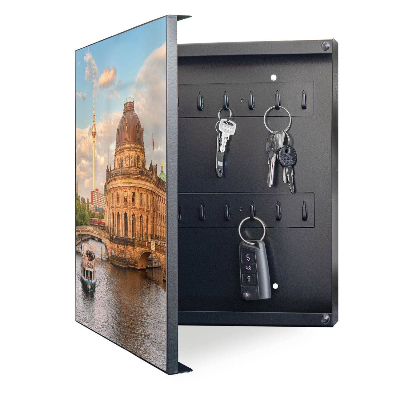 Bringe Ordnung und Eleganz in deinen Eingangsbereich mit dem banjado Schlüsselkasten Motiv Motiv Museumsinsel . Die moderne Schlüsselbox kombiniert funktionales Design mit hochwertiger Verarbeitung und wird so zu einem echten Hingucker in Flur, Büro oder Ferienwohnung. ✅ Stilvolle Schlüsselaufbewahrung mit Motiv Motiv Museumsinsel Der Design-Schlüsselkasten Motiv Motiv Museumsinsel bietet Platz für bis zu 32 Schlüssel, die auf 4 stabilen Reihen mit je 8 Haken übersichtlich verstaut werden. Mit seinen kompakten Maßen von 30 x 30 x 5 cm passt die Schlüsselbox perfekt auch in kleinere Räume. Der schwarz lackierte Stahlkorpus mit links angeschlagenem Türscharnier harmoniert mit gedruckten Folie auf der Front und fügt sich nahtlos in jedes Wohnambiente ein. Ob als Schlüsselorganizer für Zuhause oder als praktische Lösung für Büros, Praxen und Gewerbe, der banjado Schlüsselkasten sorgt für Ordnung und Übersicht. Dank der magnetischen, mit Kreidestiften beschreibbaren Folie auf der Front kannst du Notizen anheften oder Termine direkt auf der Oberfläche festhalten. Die Schlüsselbox Motiv Motiv Museumsinsel zur Wandmontage wird inklusive Befestigungsmaterial geliefert und ist schnell angebracht. So hast du deine Schlüssel jederzeit griffbereit und zugleich stilvoll verstaut. Mit diesem banjado Schlüsselkasten Motiv Motiv Museumsinsel kombinierst du praktische Aufbewahrung mit stilvollem Wohndesign. Ob privat oder geschäftlich, die Schlüsselbox sorgt für mehr Ordnung, Übersicht und ein wohnliches Ambiente.Vorteile im Überblick