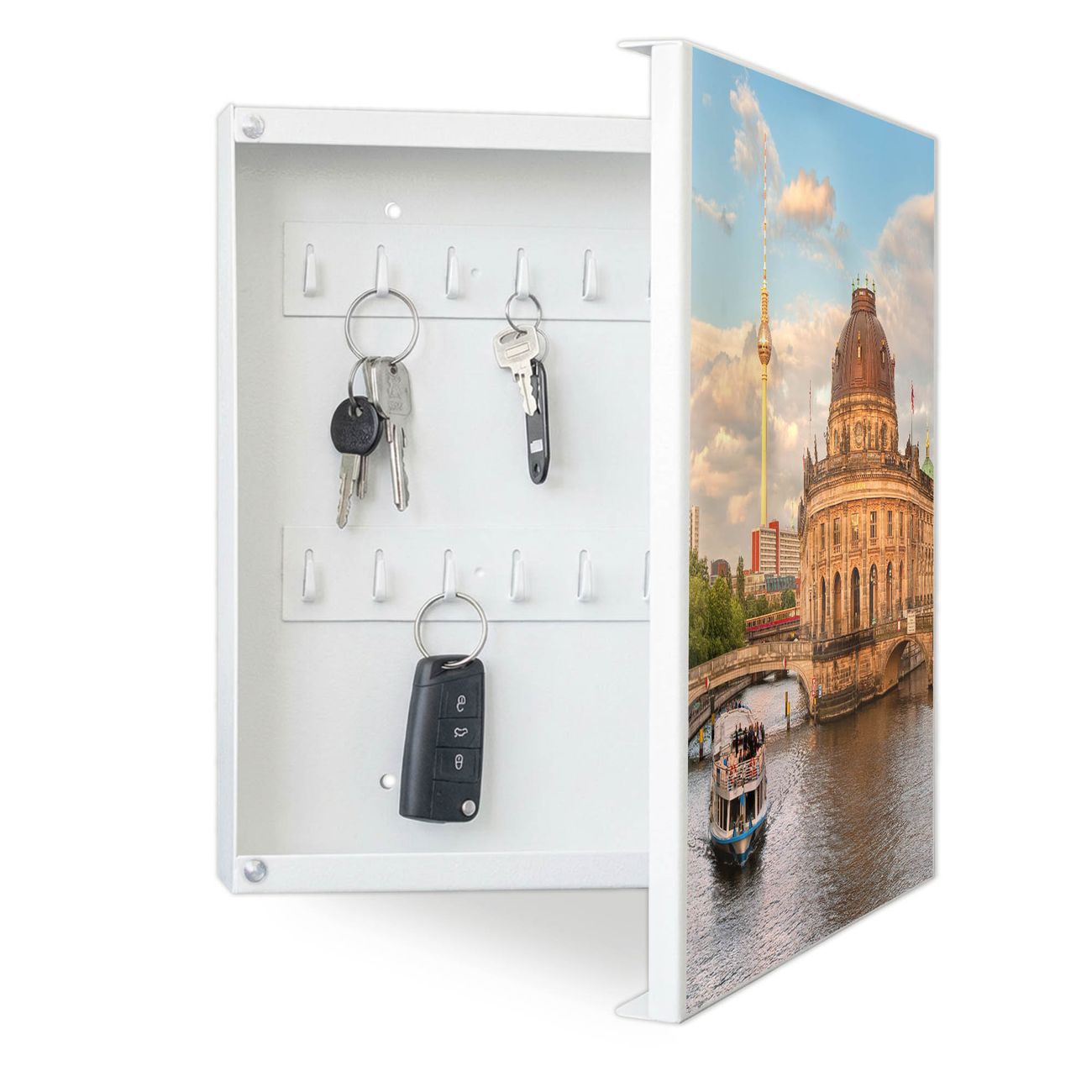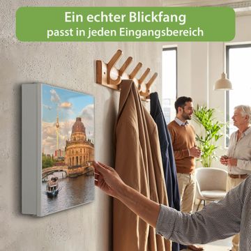 Bringe Ordnung und Eleganz in deinen Eingangsbereich mit dem banjado Schlüsselkasten Motiv Motiv Museumsinsel . Die moderne Schlüsselbox kombiniert funktionales Design mit hochwertiger Verarbeitung und wird so zu einem echten Hingucker in Flur, Büro oder Ferienwohnung. ✅ Stilvolle Schlüsselaufbewahrung mit Motiv Motiv Museumsinsel Der Design-Schlüsselkasten Motiv Motiv Museumsinsel bietet Platz für bis zu 32 Schlüssel, die auf 4 stabilen Reihen mit je 8 Haken übersichtlich verstaut werden. Mit seinen kompakten Maßen von 30 x 30 x 5 cm passt die Schlüsselbox perfekt auch in kleinere Räume. Der weiß lackierte Stahlkorpus mit rechts angeschlagenem Türscharnier harmoniert mit gedruckten Folie auf der Front und fügt sich nahtlos in jedes Wohnambiente ein. Ob als Schlüsselorganizer für Zuhause oder als praktische Lösung für Büros, Praxen und Gewerbe, der banjado Schlüsselkasten sorgt für Ordnung und Übersicht. Dank der magnetischen, mit Kreidestiften beschreibbaren Folie auf der Front kannst du Notizen anheften oder Termine direkt auf der Oberfläche festhalten. Die Schlüsselbox Motiv Motiv Museumsinsel zur Wandmontage wird inklusive Befestigungsmaterial geliefert und ist schnell angebracht. So hast du deine Schlüssel jederzeit griffbereit und zugleich stilvoll verstaut. Mit diesem banjado Schlüsselkasten Motiv Motiv Museumsinsel kombinierst du praktische Aufbewahrung mit stilvollem Wohndesign. Ob privat oder geschäftlich, die Schlüsselbox sorgt für mehr Ordnung, Übersicht und ein wohnliches Ambiente.Vorteile im Überblick