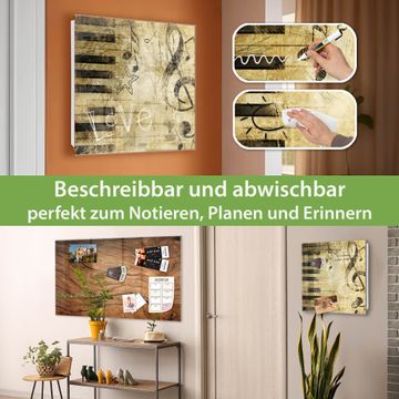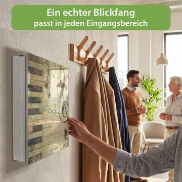 Bringe Ordnung und Eleganz in deinen Eingangsbereich mit dem banjado Schlüsselkasten Motiv Motiv Music. Die moderne Schlüsselbox kombiniert funktionales Design mit hochwertiger Verarbeitung und wird so zu einem echten Hingucker in Flur, Büro oder Ferienwohnung. ✅ Stilvolle Schlüsselaufbewahrung mit Glasfront im Motiv Motiv Music Der Design-Schlüsselkasten Motiv Motiv Music bietet Platz für bis zu 50 Schlüssel, die auf 5 stabilen Reihen mit je 10 Haken übersichtlich verstaut werden. Mit seinen kompakten Maßen von 30 x 30 x 5 cm passt die Schlüsselbox perfekt auch in kleinere Räume. Der weiß lackierte Stahlkorpus mit rechts angeschlagenem Türscharnier harmoniert mit der Glasfront und fügt sich nahtlos in jedes Wohnambiente ein. Ob als Schlüsselorganizer für Zuhause oder als praktische Lösung für Büros, Praxen und Gewerbe, der banjado Schlüsselkasten sorgt für Ordnung und Übersicht. Dank der magnetischen, mit Kreidestiften beschreibbaren Glasfront kannst du Notizen anheften oder Termine direkt auf der Oberfläche festhalten. Die Schlüsselbox Motiv Motiv Music zur Wandmontage wird inklusive Befestigungsmaterial geliefert und ist schnell angebracht. So hast du deine Schlüssel jederzeit griffbereit und zugleich stilvoll verstaut. Mit diesem banjado Schlüsselkasten Motiv Motiv Music kombinierst du praktische Aufbewahrung mit stilvollem Wohndesign. Ob privat oder geschäftlich, die Schlüsselbox sorgt für mehr Ordnung, Übersicht und ein wohnliches Ambiente.Vorteile im Überblick