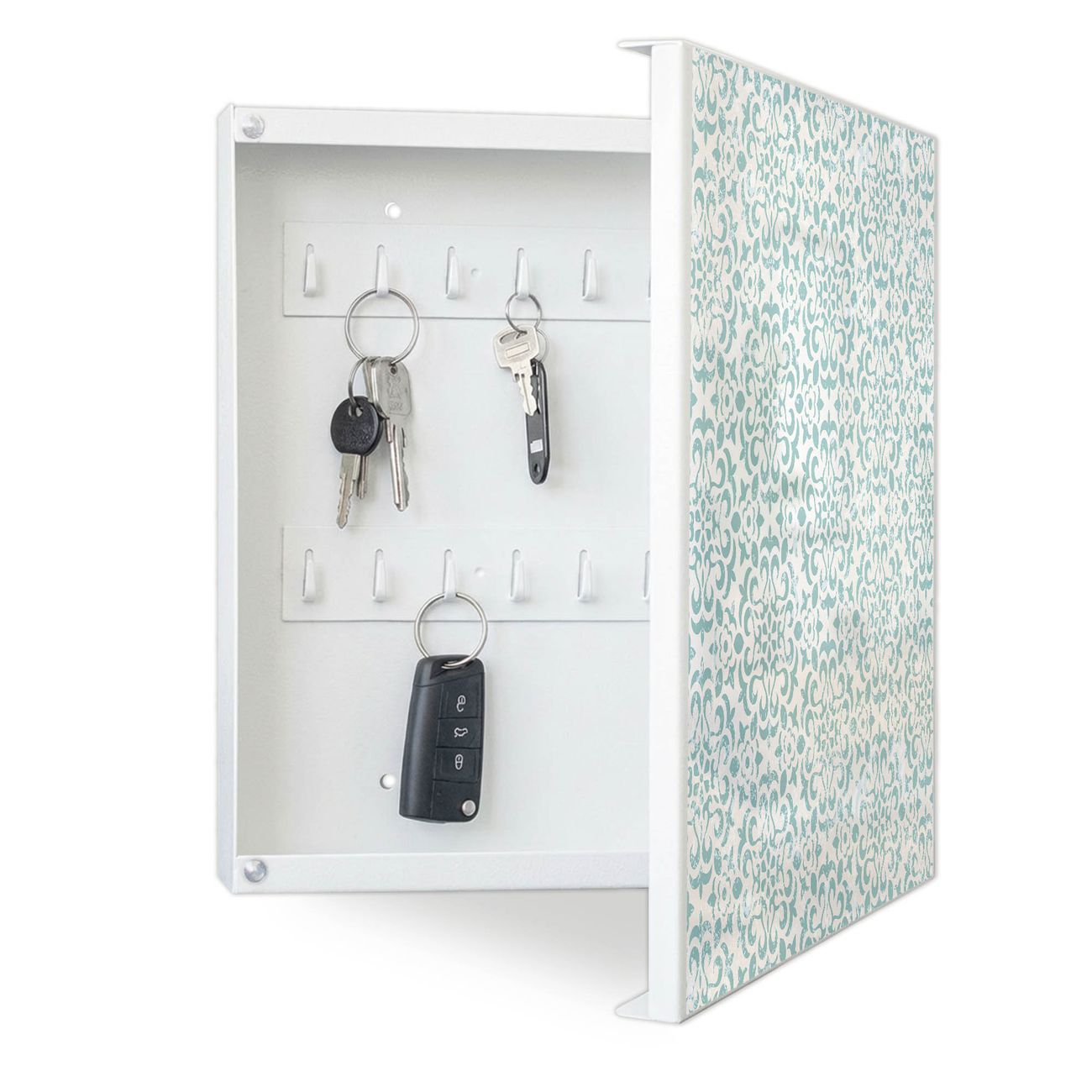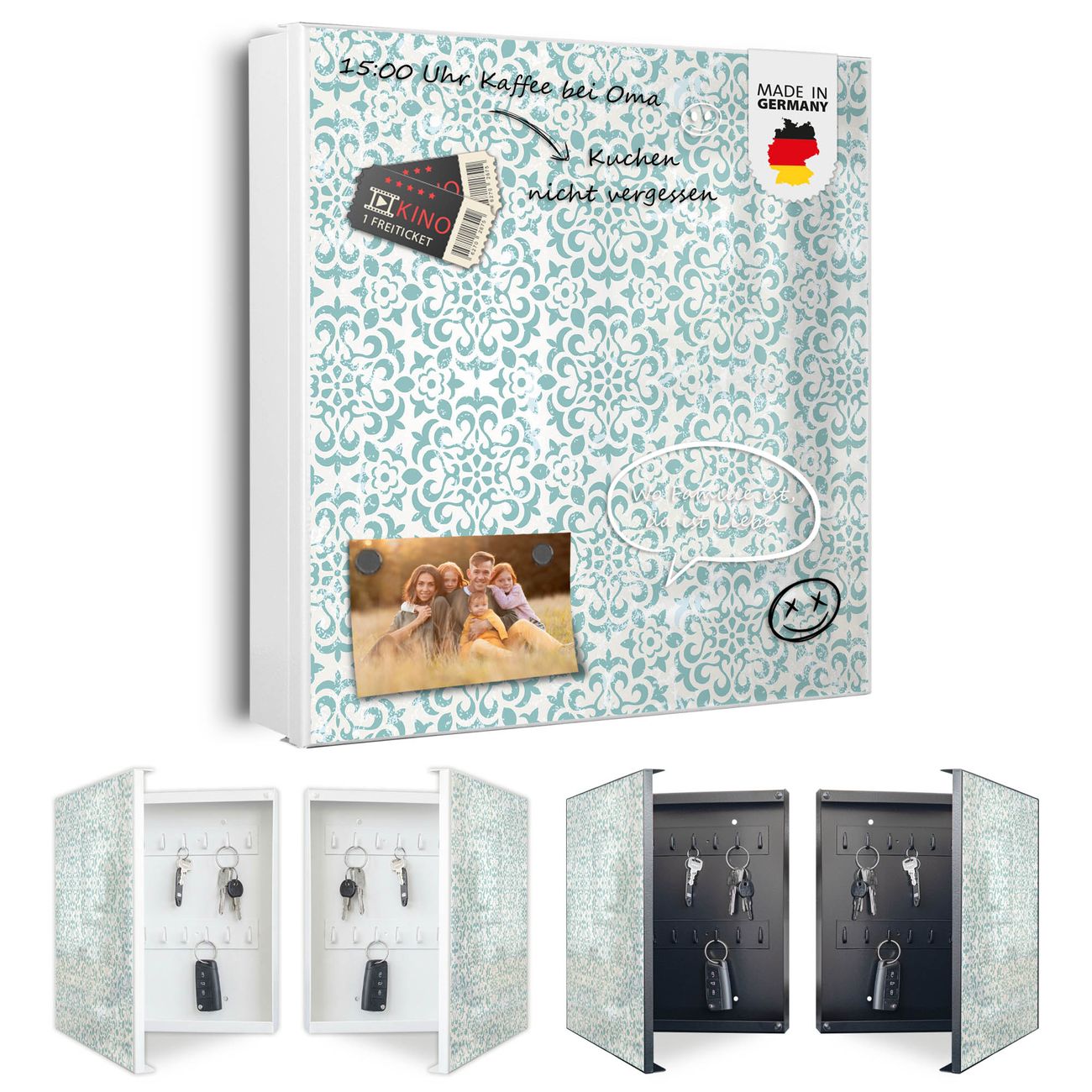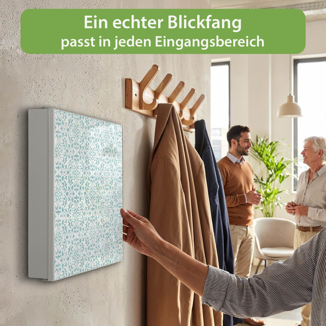 Bringe Ordnung und Eleganz in deinen Eingangsbereich mit dem banjado Schlüsselkasten Motiv Motiv Muster Getupft Blau. Die moderne Schlüsselbox kombiniert funktionales Design mit hochwertiger Verarbeitung und wird so zu einem echten Hingucker in Flur, Büro oder Ferienwohnung. ✅ Stilvolle Schlüsselaufbewahrung mit Motiv Motiv Muster Getupft Blau Der Design-Schlüsselkasten Motiv Motiv Muster Getupft Blau bietet Platz für bis zu 32 Schlüssel, die auf 4 stabilen Reihen mit je 8 Haken übersichtlich verstaut werden. Mit seinen kompakten Maßen von 30 x 30 x 5 cm passt die Schlüsselbox perfekt auch in kleinere Räume. Der weiß lackierte Stahlkorpus mit rechts angeschlagenem Türscharnier harmoniert mit gedruckten Folie auf der Front und fügt sich nahtlos in jedes Wohnambiente ein. Ob als Schlüsselorganizer für Zuhause oder als praktische Lösung für Büros, Praxen und Gewerbe, der banjado Schlüsselkasten sorgt für Ordnung und Übersicht. Dank der magnetischen, mit Kreidestiften beschreibbaren Folie auf der Front kannst du Notizen anheften oder Termine direkt auf der Oberfläche festhalten. Die Schlüsselbox Motiv Motiv Muster Getupft Blau zur Wandmontage wird inklusive Befestigungsmaterial geliefert und ist schnell angebracht. So hast du deine Schlüssel jederzeit griffbereit und zugleich stilvoll verstaut. Mit diesem banjado Schlüsselkasten Motiv Motiv Muster Getupft Blau kombinierst du praktische Aufbewahrung mit stilvollem Wohndesign. Ob privat oder geschäftlich, die Schlüsselbox sorgt für mehr Ordnung, Übersicht und ein wohnliches Ambiente.Vorteile im Überblick