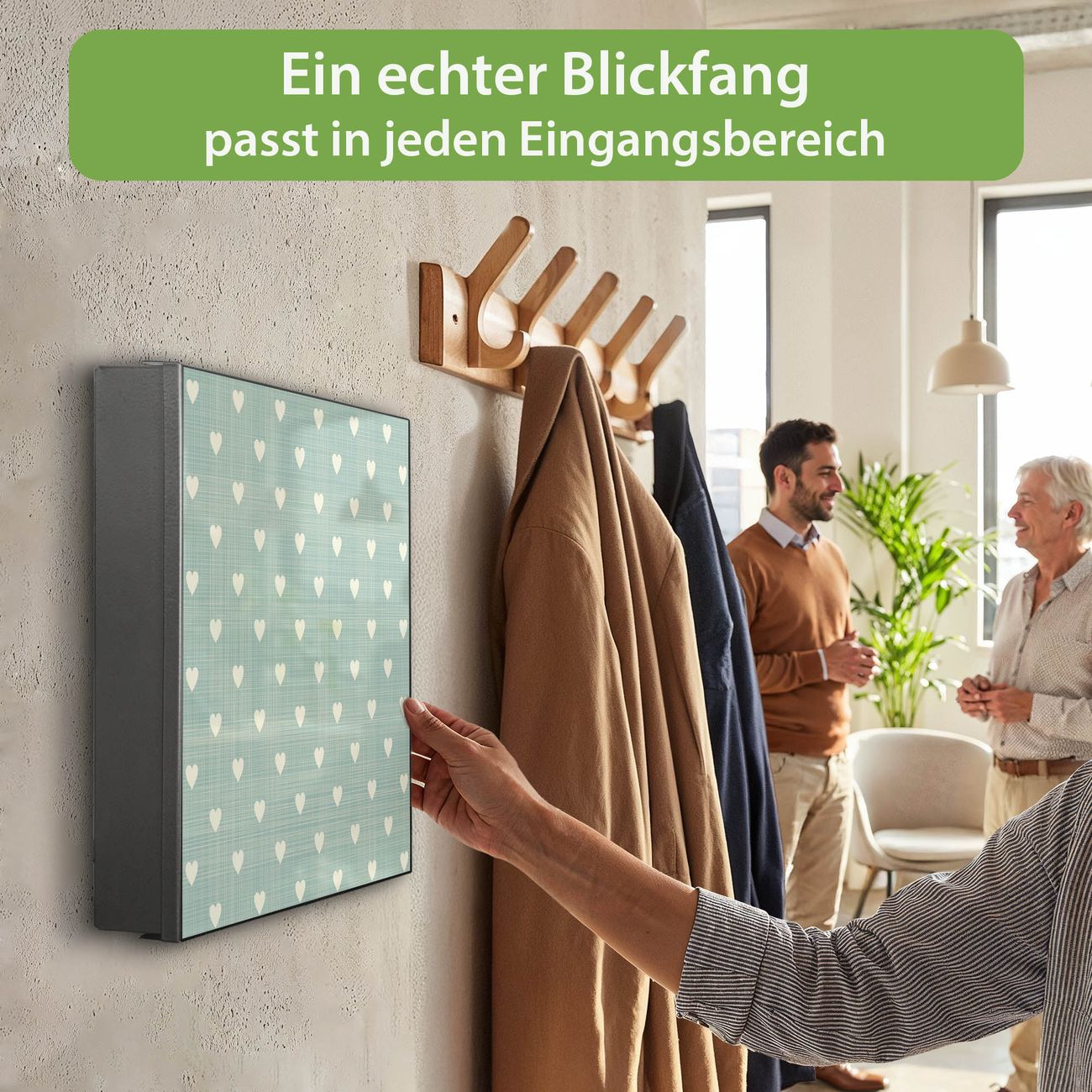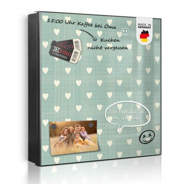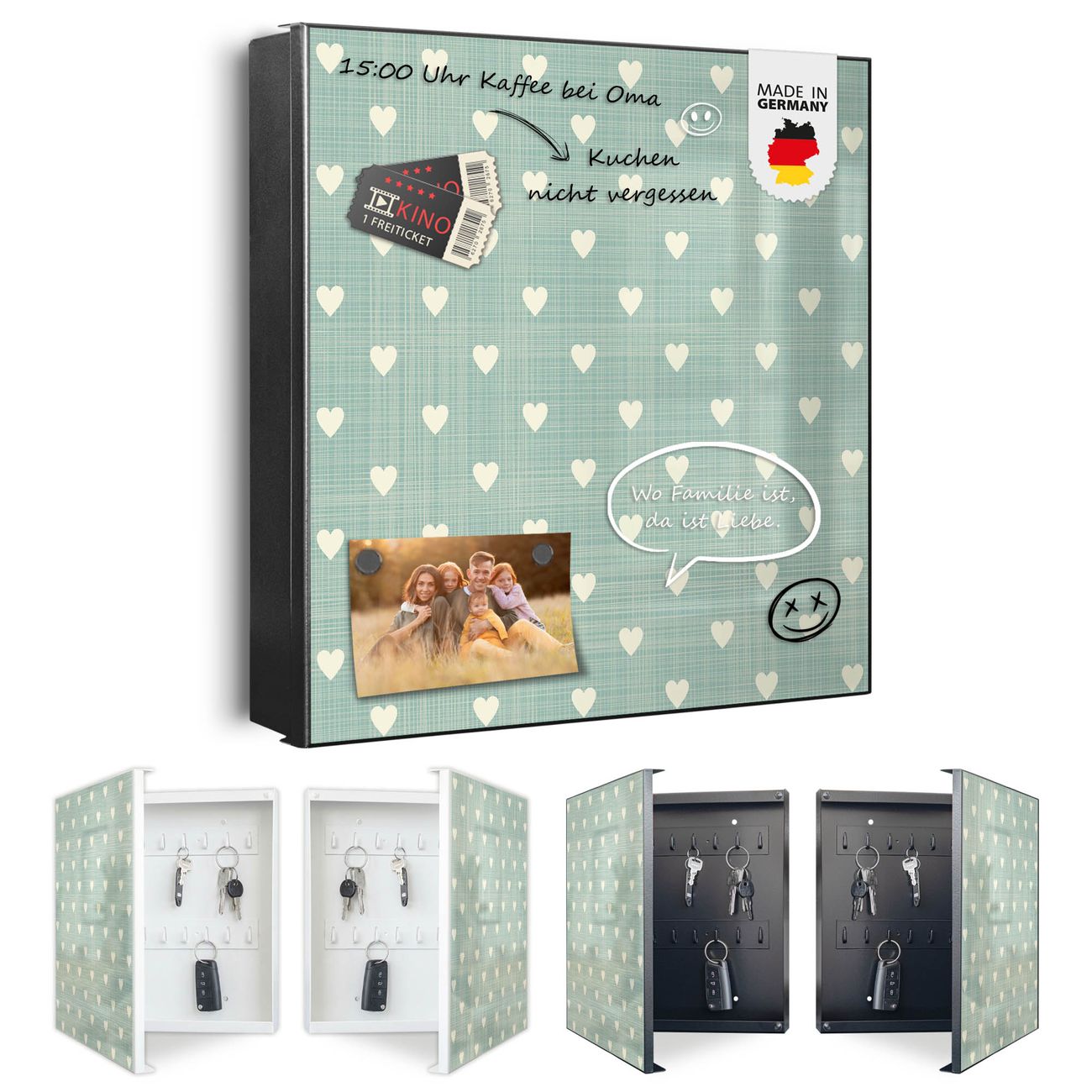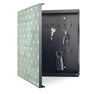 Bringe Ordnung und Eleganz in deinen Eingangsbereich mit dem banjado Schlüsselkasten Motiv Motiv Muster Herzen. Die moderne Schlüsselbox kombiniert funktionales Design mit hochwertiger Verarbeitung und wird so zu einem echten Hingucker in Flur, Büro oder Ferienwohnung. ✅ Stilvolle Schlüsselaufbewahrung mit Motiv Motiv Muster Herzen Der Design-Schlüsselkasten Motiv Motiv Muster Herzen bietet Platz für bis zu 32 Schlüssel, die auf 4 stabilen Reihen mit je 8 Haken übersichtlich verstaut werden. Mit seinen kompakten Maßen von 30 x 30 x 5 cm passt die Schlüsselbox perfekt auch in kleinere Räume. Der schwarz lackierte Stahlkorpus mit links angeschlagenem Türscharnier harmoniert mit gedruckten Folie auf der Front und fügt sich nahtlos in jedes Wohnambiente ein. Ob als Schlüsselorganizer für Zuhause oder als praktische Lösung für Büros, Praxen und Gewerbe, der banjado Schlüsselkasten sorgt für Ordnung und Übersicht. Dank der magnetischen, mit Kreidestiften beschreibbaren Folie auf der Front kannst du Notizen anheften oder Termine direkt auf der Oberfläche festhalten. Die Schlüsselbox Motiv Motiv Muster Herzen zur Wandmontage wird inklusive Befestigungsmaterial geliefert und ist schnell angebracht. So hast du deine Schlüssel jederzeit griffbereit und zugleich stilvoll verstaut. Mit diesem banjado Schlüsselkasten Motiv Motiv Muster Herzen kombinierst du praktische Aufbewahrung mit stilvollem Wohndesign. Ob privat oder geschäftlich, die Schlüsselbox sorgt für mehr Ordnung, Übersicht und ein wohnliches Ambiente.Vorteile im Überblick