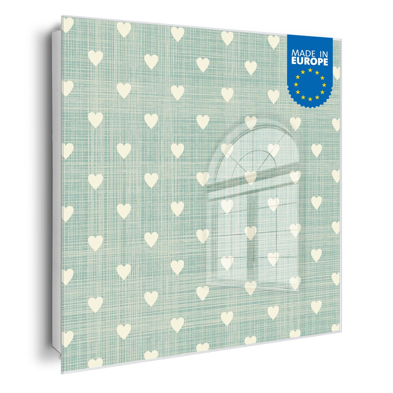 Bringe Ordnung und Eleganz in deinen Eingangsbereich mit dem banjado Schlüsselkasten Motiv Motiv Muster Herzen. Die moderne Schlüsselbox kombiniert funktionales Design mit hochwertiger Verarbeitung und wird so zu einem echten Hingucker in Flur, Büro oder Ferienwohnung. ✅ Stilvolle Schlüsselaufbewahrung mit Glasfront im Motiv Motiv Muster Herzen Der Design-Schlüsselkasten Motiv Motiv Muster Herzen bietet Platz für bis zu 50 Schlüssel, die auf 5 stabilen Reihen mit je 10 Haken übersichtlich verstaut werden. Mit seinen kompakten Maßen von 30 x 30 x 5 cm passt die Schlüsselbox perfekt auch in kleinere Räume. Der weiß lackierte Stahlkorpus mit rechts angeschlagenem Türscharnier harmoniert mit der Glasfront und fügt sich nahtlos in jedes Wohnambiente ein. Ob als Schlüsselorganizer für Zuhause oder als praktische Lösung für Büros, Praxen und Gewerbe, der banjado Schlüsselkasten sorgt für Ordnung und Übersicht. Dank der magnetischen, mit Kreidestiften beschreibbaren Glasfront kannst du Notizen anheften oder Termine direkt auf der Oberfläche festhalten. Die Schlüsselbox Motiv Motiv Muster Herzen zur Wandmontage wird inklusive Befestigungsmaterial geliefert und ist schnell angebracht. So hast du deine Schlüssel jederzeit griffbereit und zugleich stilvoll verstaut. Mit diesem banjado Schlüsselkasten Motiv Motiv Muster Herzen kombinierst du praktische Aufbewahrung mit stilvollem Wohndesign. Ob privat oder geschäftlich, die Schlüsselbox sorgt für mehr Ordnung, Übersicht und ein wohnliches Ambiente.Vorteile im Überblick