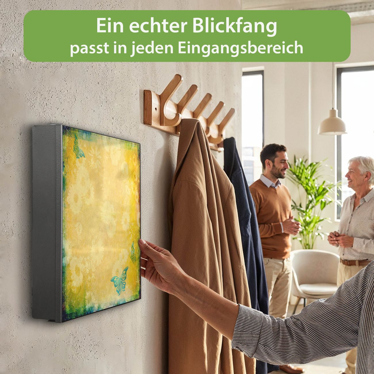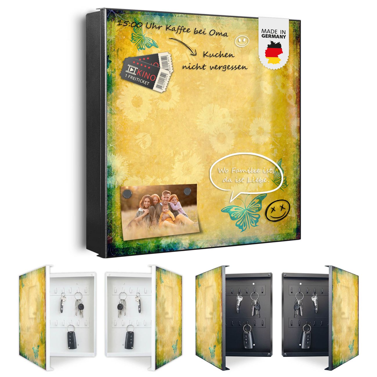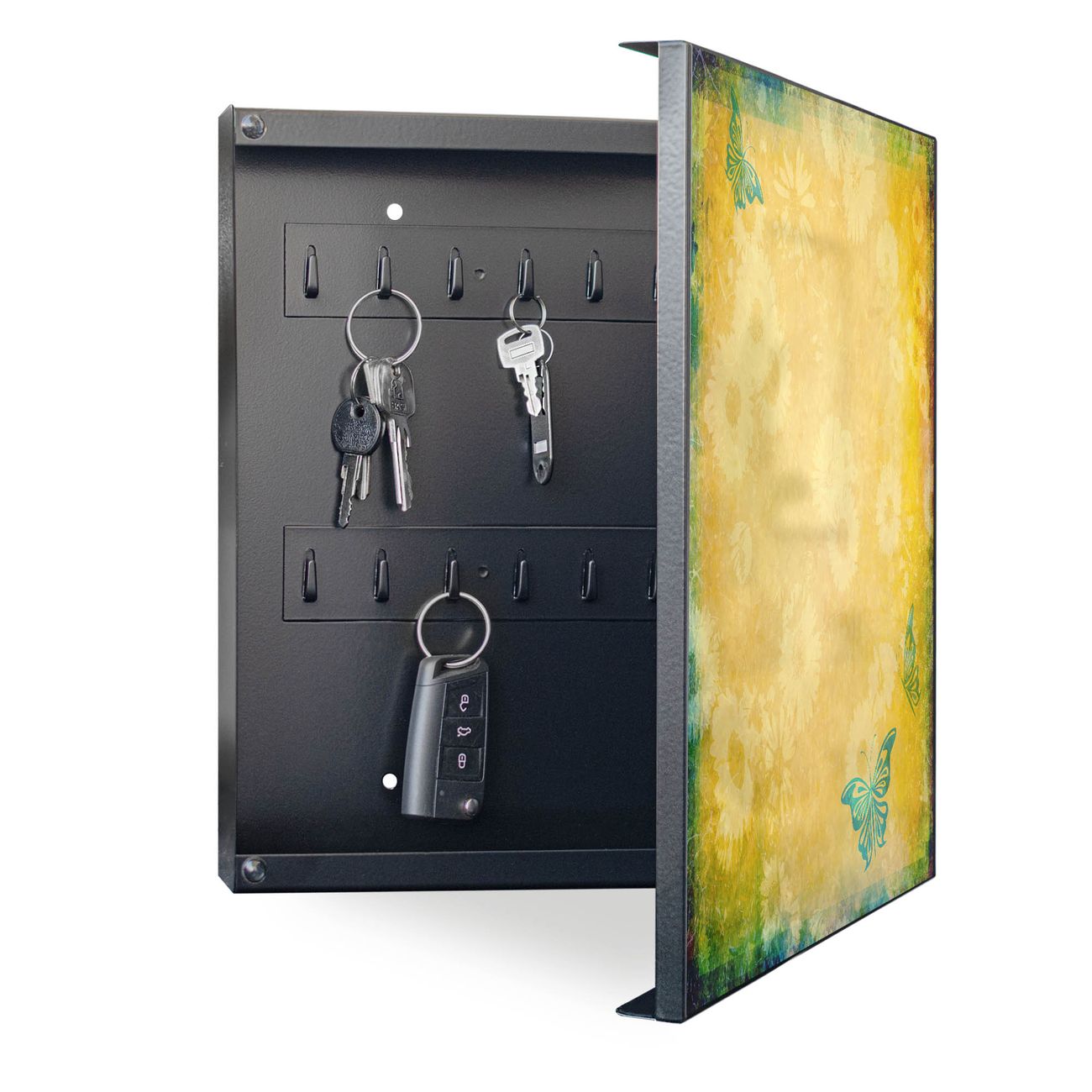 Bringe Ordnung und Eleganz in deinen Eingangsbereich mit dem banjado Schlüsselkasten Motiv Motiv Muster Sommer. Die moderne Schlüsselbox kombiniert funktionales Design mit hochwertiger Verarbeitung und wird so zu einem echten Hingucker in Flur, Büro oder Ferienwohnung. ✅ Stilvolle Schlüsselaufbewahrung mit Motiv Motiv Muster Sommer Der Design-Schlüsselkasten Motiv Motiv Muster Sommer bietet Platz für bis zu 32 Schlüssel, die auf 4 stabilen Reihen mit je 8 Haken übersichtlich verstaut werden. Mit seinen kompakten Maßen von 30 x 30 x 5 cm passt die Schlüsselbox perfekt auch in kleinere Räume. Der schwarz lackierte Stahlkorpus mit rechts angeschlagenem Türscharnier harmoniert mit gedruckten Folie auf der Front und fügt sich nahtlos in jedes Wohnambiente ein. Ob als Schlüsselorganizer für Zuhause oder als praktische Lösung für Büros, Praxen und Gewerbe, der banjado Schlüsselkasten sorgt für Ordnung und Übersicht. Dank der magnetischen, mit Kreidestiften beschreibbaren Folie auf der Front kannst du Notizen anheften oder Termine direkt auf der Oberfläche festhalten. Die Schlüsselbox Motiv Motiv Muster Sommer zur Wandmontage wird inklusive Befestigungsmaterial geliefert und ist schnell angebracht. So hast du deine Schlüssel jederzeit griffbereit und zugleich stilvoll verstaut. Mit diesem banjado Schlüsselkasten Motiv Motiv Muster Sommer kombinierst du praktische Aufbewahrung mit stilvollem Wohndesign. Ob privat oder geschäftlich, die Schlüsselbox sorgt für mehr Ordnung, Übersicht und ein wohnliches Ambiente.Vorteile im Überblick