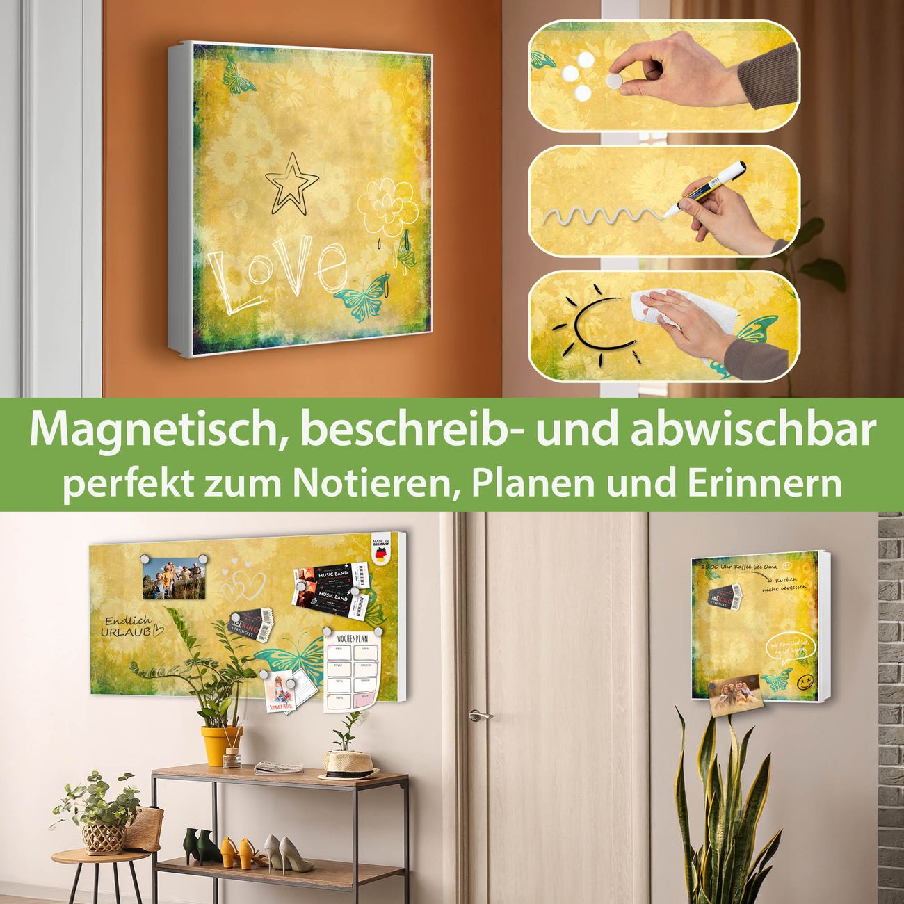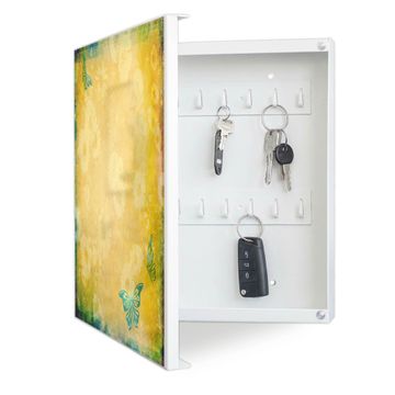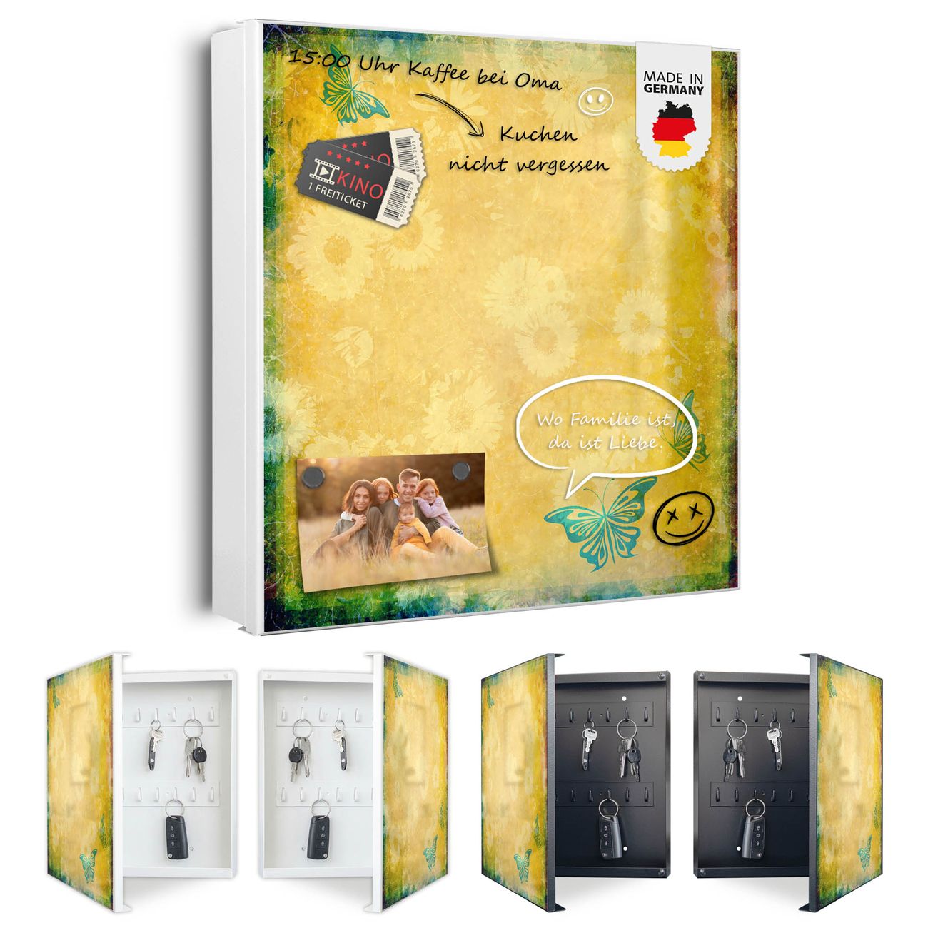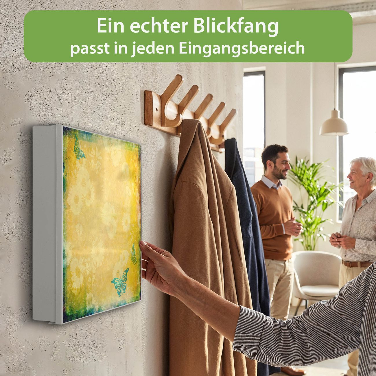 Bringe Ordnung und Eleganz in deinen Eingangsbereich mit dem banjado Schlüsselkasten Motiv Motiv Muster Sommer. Die moderne Schlüsselbox kombiniert funktionales Design mit hochwertiger Verarbeitung und wird so zu einem echten Hingucker in Flur, Büro oder Ferienwohnung. ✅ Stilvolle Schlüsselaufbewahrung mit Motiv Motiv Muster Sommer Der Design-Schlüsselkasten Motiv Motiv Muster Sommer bietet Platz für bis zu 32 Schlüssel, die auf 4 stabilen Reihen mit je 8 Haken übersichtlich verstaut werden. Mit seinen kompakten Maßen von 30 x 30 x 5 cm passt die Schlüsselbox perfekt auch in kleinere Räume. Der weiß lackierte Stahlkorpus mit links angeschlagenem Türscharnier harmoniert mit gedruckten Folie auf der Front und fügt sich nahtlos in jedes Wohnambiente ein. Ob als Schlüsselorganizer für Zuhause oder als praktische Lösung für Büros, Praxen und Gewerbe, der banjado Schlüsselkasten sorgt für Ordnung und Übersicht. Dank der magnetischen, mit Kreidestiften beschreibbaren Folie auf der Front kannst du Notizen anheften oder Termine direkt auf der Oberfläche festhalten. Die Schlüsselbox Motiv Motiv Muster Sommer zur Wandmontage wird inklusive Befestigungsmaterial geliefert und ist schnell angebracht. So hast du deine Schlüssel jederzeit griffbereit und zugleich stilvoll verstaut. Mit diesem banjado Schlüsselkasten Motiv Motiv Muster Sommer kombinierst du praktische Aufbewahrung mit stilvollem Wohndesign. Ob privat oder geschäftlich, die Schlüsselbox sorgt für mehr Ordnung, Übersicht und ein wohnliches Ambiente.Vorteile im Überblick