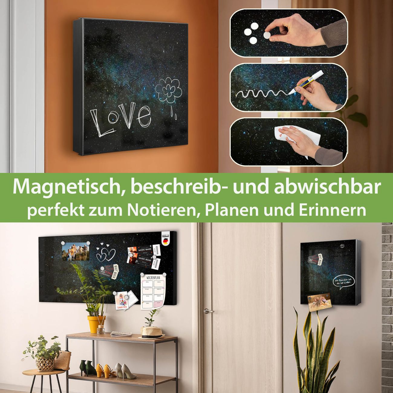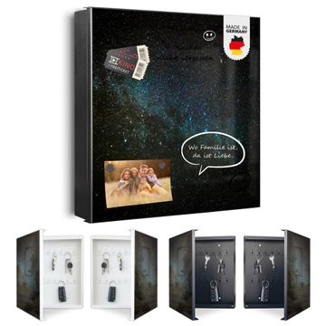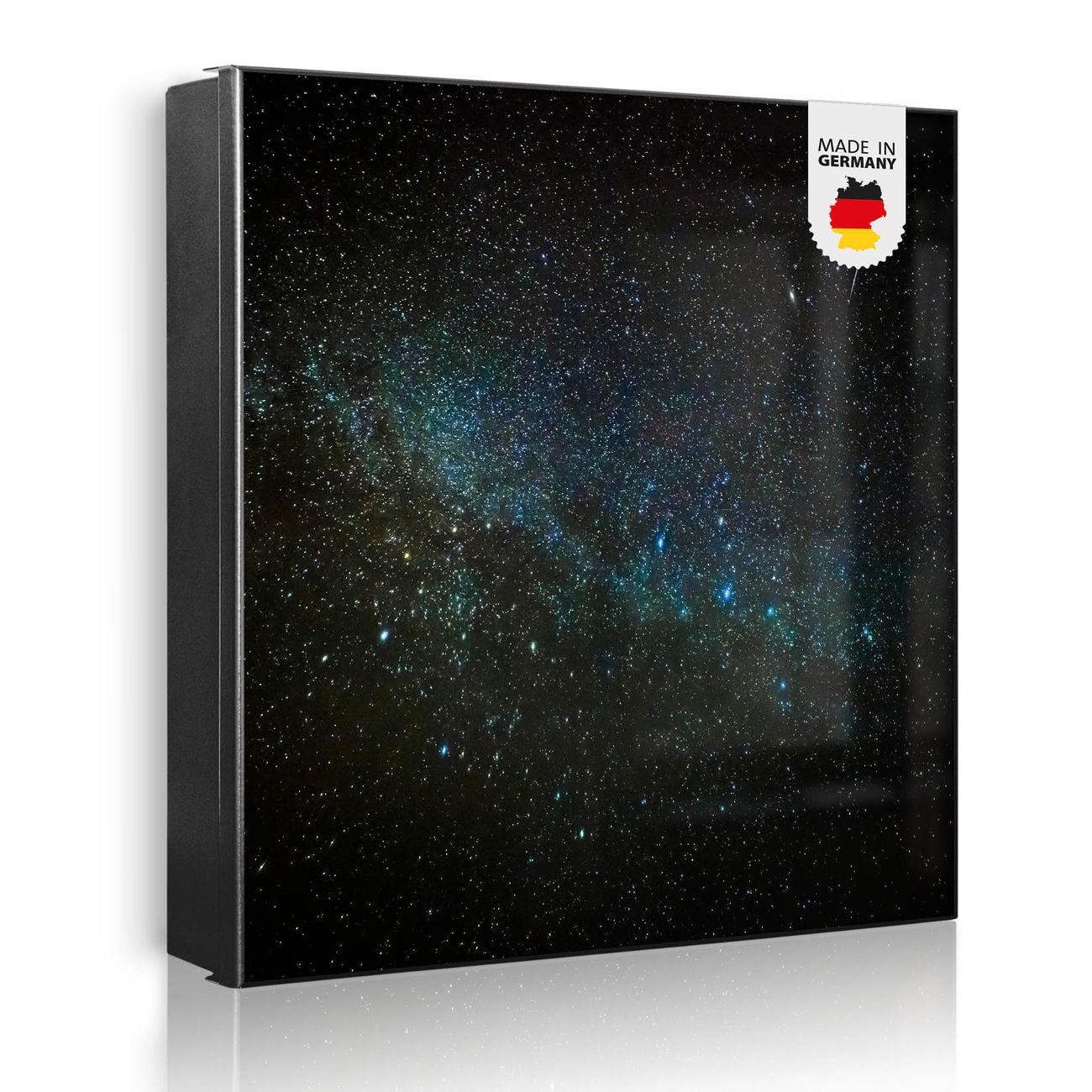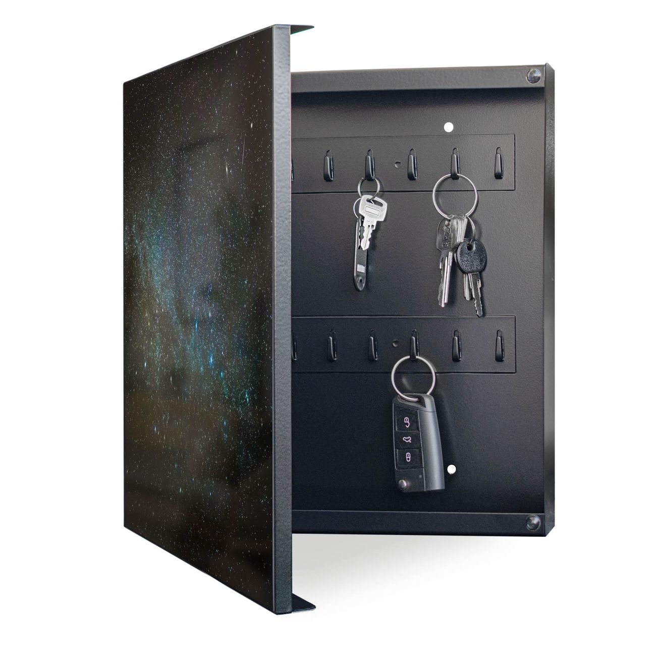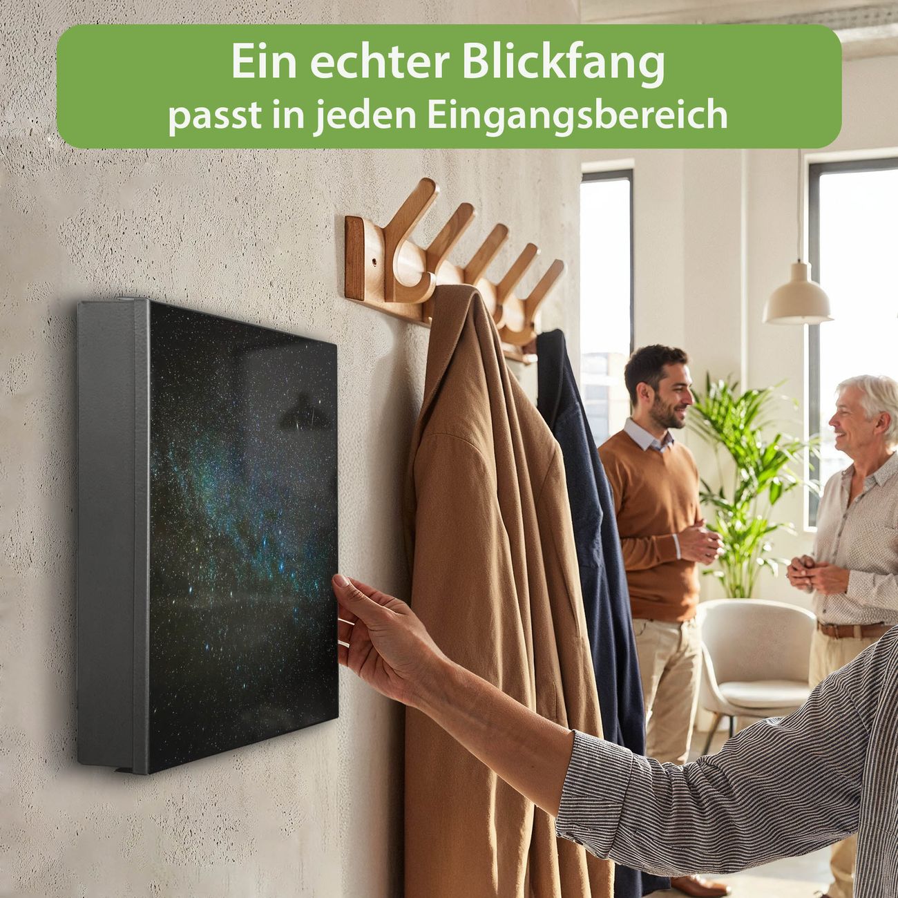 Bringe Ordnung und Eleganz in deinen Eingangsbereich mit dem banjado Schlüsselkasten Motiv Motiv Nachthimmel. Die moderne Schlüsselbox kombiniert funktionales Design mit hochwertiger Verarbeitung und wird so zu einem echten Hingucker in Flur, Büro oder Ferienwohnung. ✅ Stilvolle Schlüsselaufbewahrung mit Motiv Motiv Nachthimmel Der Design-Schlüsselkasten Motiv Motiv Nachthimmel bietet Platz für bis zu 32 Schlüssel, die auf 4 stabilen Reihen mit je 8 Haken übersichtlich verstaut werden. Mit seinen kompakten Maßen von 30 x 30 x 5 cm passt die Schlüsselbox perfekt auch in kleinere Räume. Der schwarz lackierte Stahlkorpus mit links angeschlagenem Türscharnier harmoniert mit gedruckten Folie auf der Front und fügt sich nahtlos in jedes Wohnambiente ein. Ob als Schlüsselorganizer für Zuhause oder als praktische Lösung für Büros, Praxen und Gewerbe, der banjado Schlüsselkasten sorgt für Ordnung und Übersicht. Dank der magnetischen, mit Kreidestiften beschreibbaren Folie auf der Front kannst du Notizen anheften oder Termine direkt auf der Oberfläche festhalten. Die Schlüsselbox Motiv Motiv Nachthimmel zur Wandmontage wird inklusive Befestigungsmaterial geliefert und ist schnell angebracht. So hast du deine Schlüssel jederzeit griffbereit und zugleich stilvoll verstaut. Mit diesem banjado Schlüsselkasten Motiv Motiv Nachthimmel kombinierst du praktische Aufbewahrung mit stilvollem Wohndesign. Ob privat oder geschäftlich, die Schlüsselbox sorgt für mehr Ordnung, Übersicht und ein wohnliches Ambiente.Vorteile im Überblick