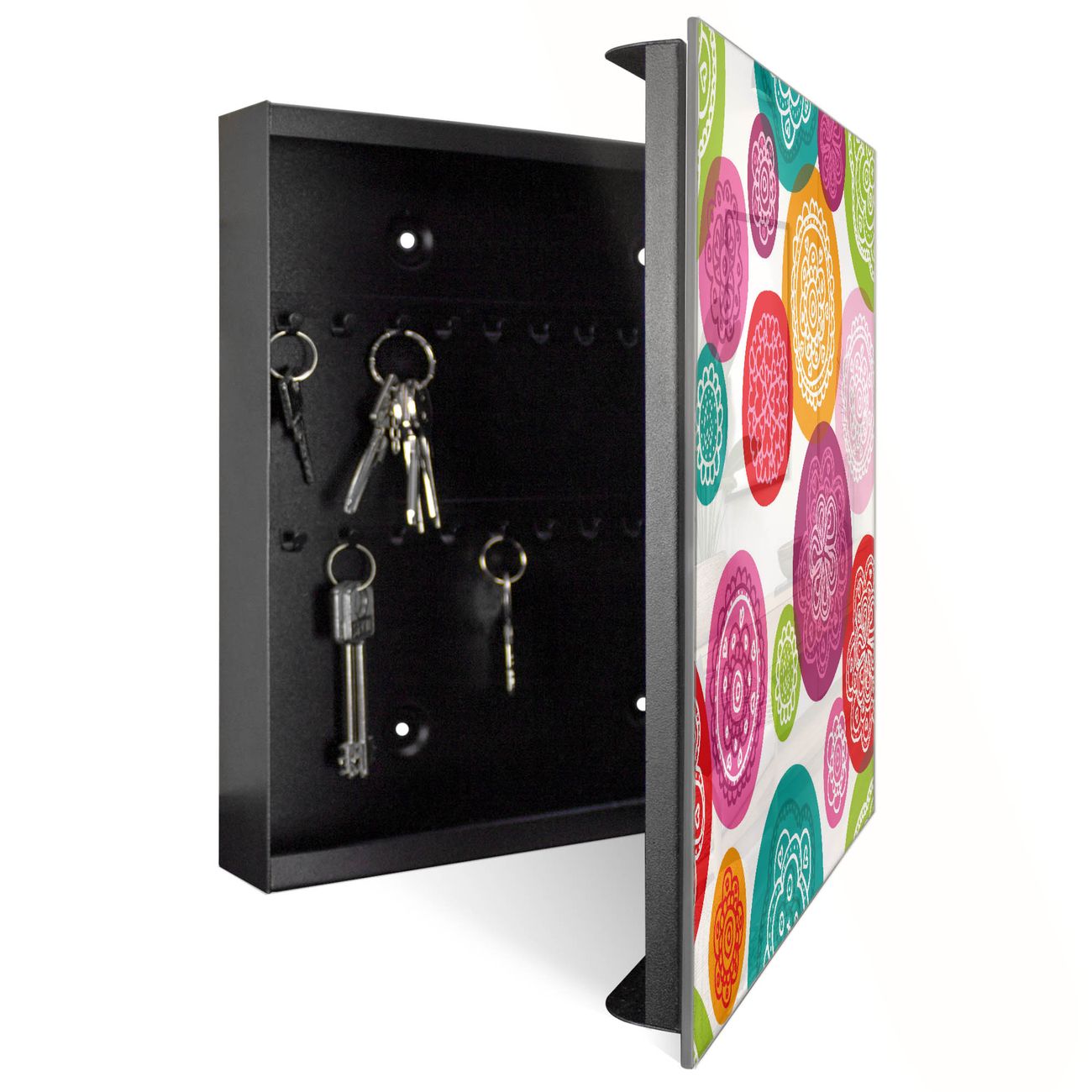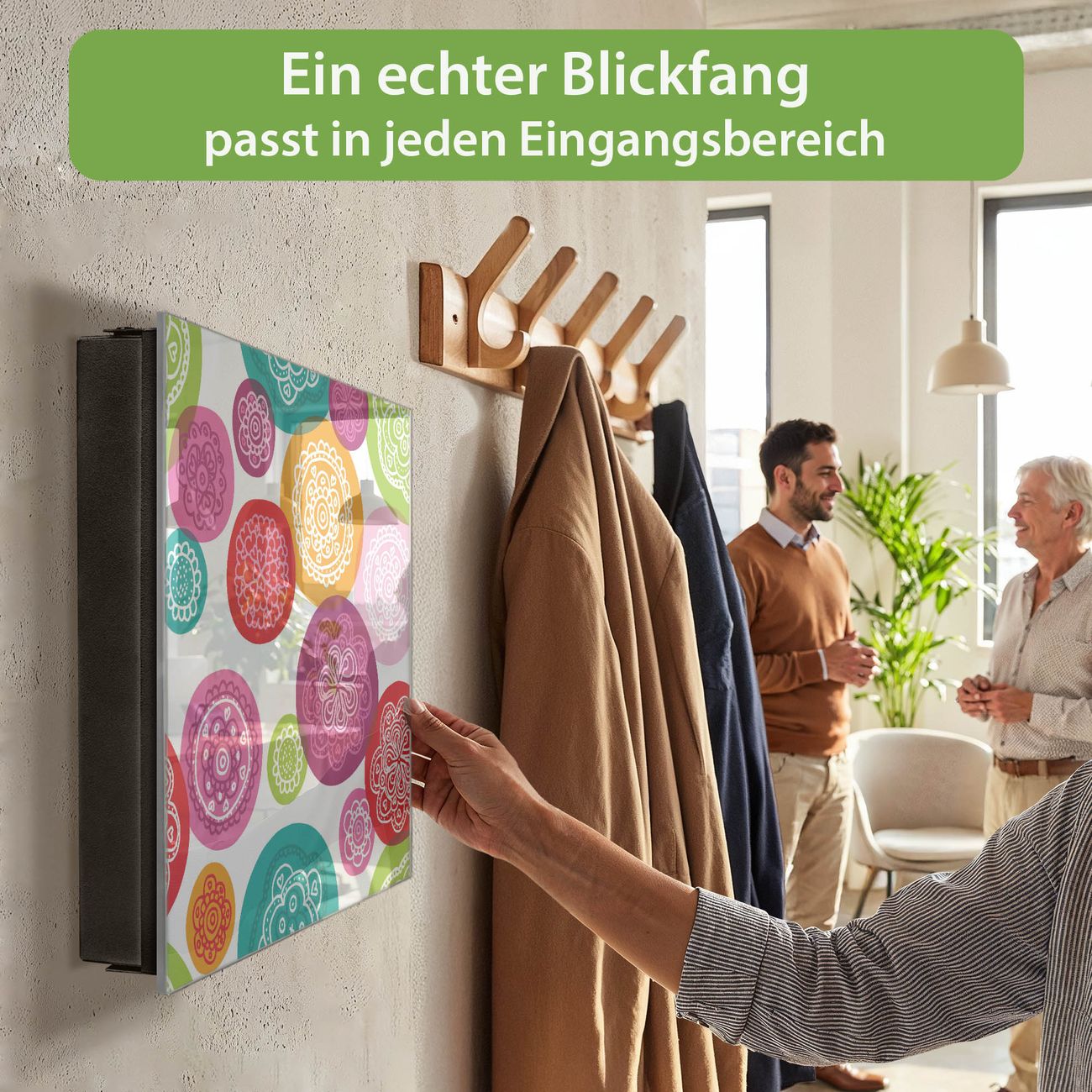 Bringe Ordnung und Eleganz in deinen Eingangsbereich mit dem banjado Schlüsselkasten Motiv Motiv Naive Blüten. Die moderne Schlüsselbox kombiniert funktionales Design mit hochwertiger Verarbeitung und wird so zu einem echten Hingucker in Flur, Büro oder Ferienwohnung. ✅ Stilvolle Schlüsselaufbewahrung mit Glasfront im Motiv Motiv Naive Blüten Der Design-Schlüsselkasten Motiv Motiv Naive Blüten bietet Platz für bis zu 50 Schlüssel, die auf 5 stabilen Reihen mit je 10 Haken übersichtlich verstaut werden. Mit seinen kompakten Maßen von 30 x 30 x 5 cm passt die Schlüsselbox perfekt auch in kleinere Räume. Der schwarz lackierte Stahlkorpus mit rechts angeschlagenem Türscharnier harmoniert mit der Glasfront und fügt sich nahtlos in jedes Wohnambiente ein. Ob als Schlüsselorganizer für Zuhause oder als praktische Lösung für Büros, Praxen und Gewerbe, der banjado Schlüsselkasten sorgt für Ordnung und Übersicht. Dank der magnetischen, mit Kreidestiften beschreibbaren Glasfront kannst du Notizen anheften oder Termine direkt auf der Oberfläche festhalten. Die Schlüsselbox Motiv Motiv Naive Blüten zur Wandmontage wird inklusive Befestigungsmaterial geliefert und ist schnell angebracht. So hast du deine Schlüssel jederzeit griffbereit und zugleich stilvoll verstaut. Mit diesem banjado Schlüsselkasten Motiv Motiv Naive Blüten kombinierst du praktische Aufbewahrung mit stilvollem Wohndesign. Ob privat oder geschäftlich, die Schlüsselbox sorgt für mehr Ordnung, Übersicht und ein wohnliches Ambiente.Vorteile im Überblick