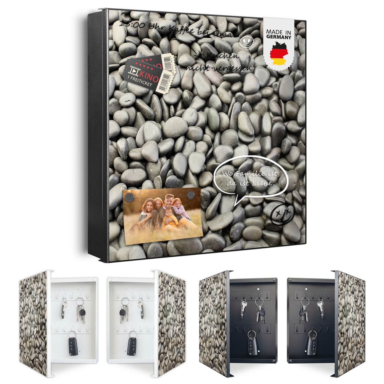 Bringe Ordnung und Eleganz in deinen Eingangsbereich mit dem banjado Schlüsselkasten Motiv Motiv Nasse Kiesel. Die moderne Schlüsselbox kombiniert funktionales Design mit hochwertiger Verarbeitung und wird so zu einem echten Hingucker in Flur, Büro oder Ferienwohnung. ✅ Stilvolle Schlüsselaufbewahrung mit Motiv Motiv Nasse Kiesel Der Design-Schlüsselkasten Motiv Motiv Nasse Kiesel bietet Platz für bis zu 32 Schlüssel, die auf 4 stabilen Reihen mit je 8 Haken übersichtlich verstaut werden. Mit seinen kompakten Maßen von 30 x 30 x 5 cm passt die Schlüsselbox perfekt auch in kleinere Räume. Der schwarz lackierte Stahlkorpus mit rechts angeschlagenem Türscharnier harmoniert mit gedruckten Folie auf der Front und fügt sich nahtlos in jedes Wohnambiente ein. Ob als Schlüsselorganizer für Zuhause oder als praktische Lösung für Büros, Praxen und Gewerbe, der banjado Schlüsselkasten sorgt für Ordnung und Übersicht. Dank der magnetischen, mit Kreidestiften beschreibbaren Folie auf der Front kannst du Notizen anheften oder Termine direkt auf der Oberfläche festhalten. Die Schlüsselbox Motiv Motiv Nasse Kiesel zur Wandmontage wird inklusive Befestigungsmaterial geliefert und ist schnell angebracht. So hast du deine Schlüssel jederzeit griffbereit und zugleich stilvoll verstaut. Mit diesem banjado Schlüsselkasten Motiv Motiv Nasse Kiesel kombinierst du praktische Aufbewahrung mit stilvollem Wohndesign. Ob privat oder geschäftlich, die Schlüsselbox sorgt für mehr Ordnung, Übersicht und ein wohnliches Ambiente.Vorteile im Überblick