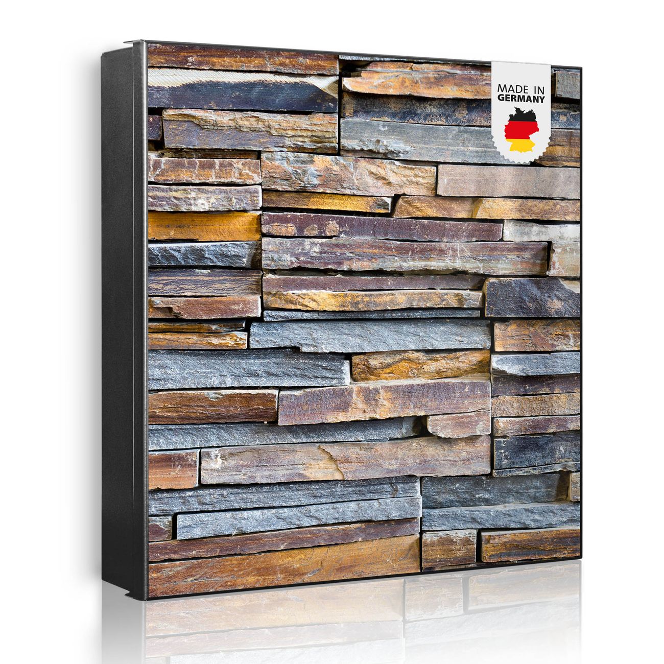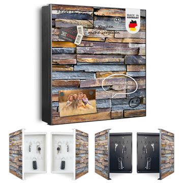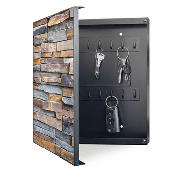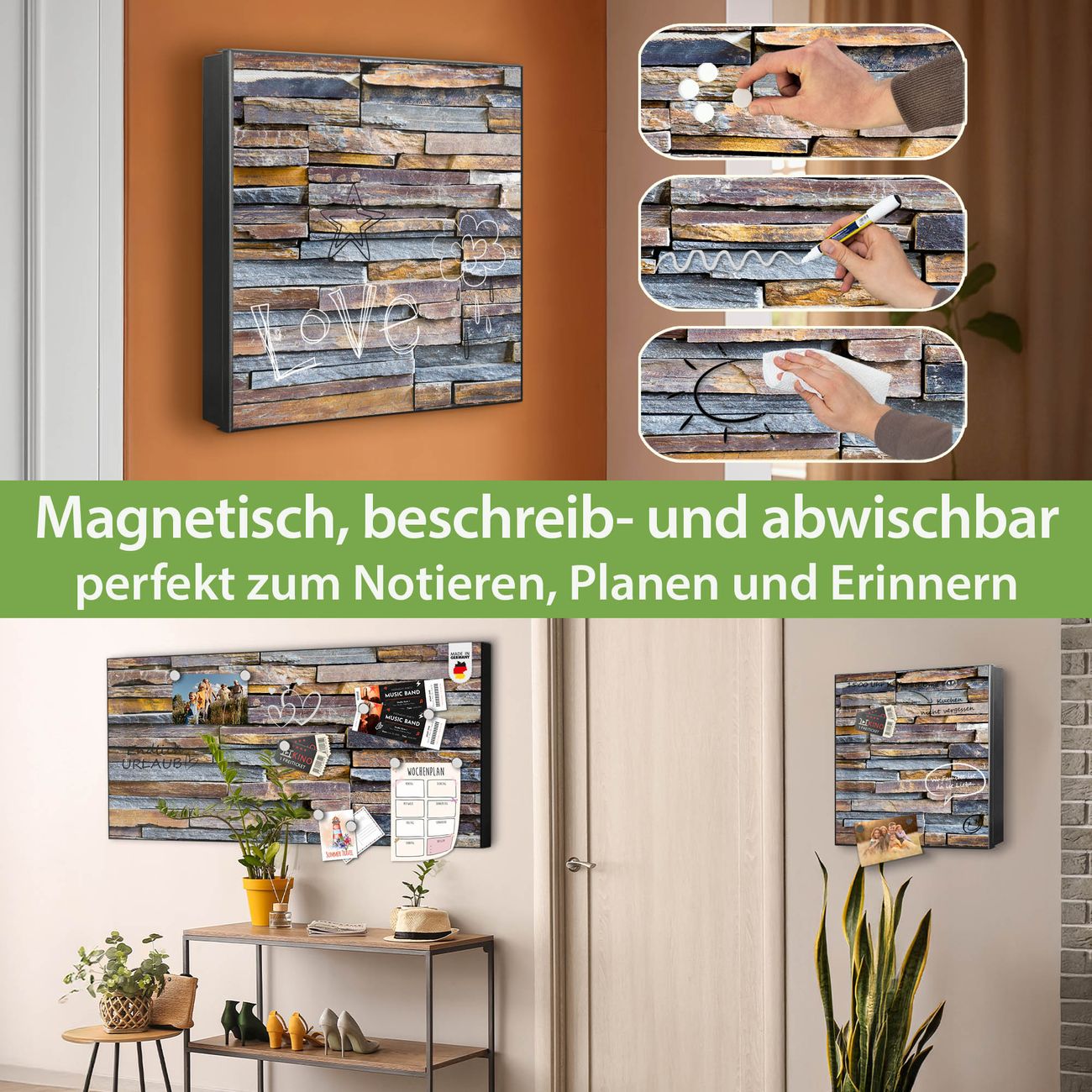 Bringe Ordnung und Eleganz in deinen Eingangsbereich mit dem banjado Schlüsselkasten Motiv Motiv Naturstein. Die moderne Schlüsselbox kombiniert funktionales Design mit hochwertiger Verarbeitung und wird so zu einem echten Hingucker in Flur, Büro oder Ferienwohnung. ✅ Stilvolle Schlüsselaufbewahrung mit Motiv Motiv Naturstein Der Design-Schlüsselkasten Motiv Motiv Naturstein bietet Platz für bis zu 32 Schlüssel, die auf 4 stabilen Reihen mit je 8 Haken übersichtlich verstaut werden. Mit seinen kompakten Maßen von 30 x 30 x 5 cm passt die Schlüsselbox perfekt auch in kleinere Räume. Der schwarz lackierte Stahlkorpus mit links angeschlagenem Türscharnier harmoniert mit gedruckten Folie auf der Front und fügt sich nahtlos in jedes Wohnambiente ein. Ob als Schlüsselorganizer für Zuhause oder als praktische Lösung für Büros, Praxen und Gewerbe, der banjado Schlüsselkasten sorgt für Ordnung und Übersicht. Dank der magnetischen, mit Kreidestiften beschreibbaren Folie auf der Front kannst du Notizen anheften oder Termine direkt auf der Oberfläche festhalten. Die Schlüsselbox Motiv Motiv Naturstein zur Wandmontage wird inklusive Befestigungsmaterial geliefert und ist schnell angebracht. So hast du deine Schlüssel jederzeit griffbereit und zugleich stilvoll verstaut. Mit diesem banjado Schlüsselkasten Motiv Motiv Naturstein kombinierst du praktische Aufbewahrung mit stilvollem Wohndesign. Ob privat oder geschäftlich, die Schlüsselbox sorgt für mehr Ordnung, Übersicht und ein wohnliches Ambiente.Vorteile im Überblick