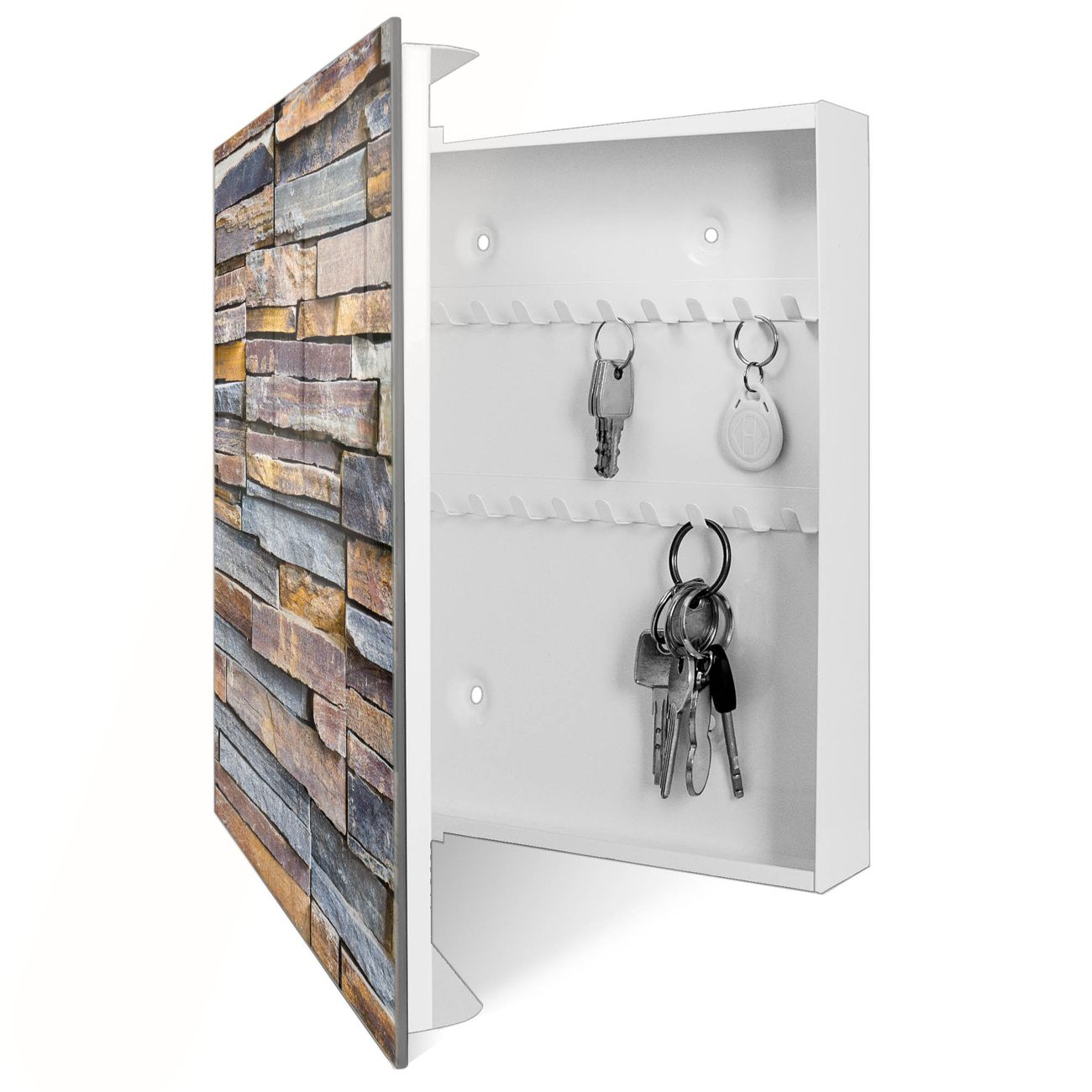 Bringe Ordnung und Eleganz in deinen Eingangsbereich mit dem banjado Schlüsselkasten Motiv Motiv Naturstein. Die moderne Schlüsselbox kombiniert funktionales Design mit hochwertiger Verarbeitung und wird so zu einem echten Hingucker in Flur, Büro oder Ferienwohnung. ✅ Stilvolle Schlüsselaufbewahrung mit Glasfront im Motiv Motiv Naturstein Der Design-Schlüsselkasten Motiv Motiv Naturstein bietet Platz für bis zu 50 Schlüssel, die auf 5 stabilen Reihen mit je 10 Haken übersichtlich verstaut werden. Mit seinen kompakten Maßen von 30 x 30 x 5 cm passt die Schlüsselbox perfekt auch in kleinere Räume. Der weiß lackierte Stahlkorpus mit rechts angeschlagenem Türscharnier harmoniert mit der Glasfront und fügt sich nahtlos in jedes Wohnambiente ein. Ob als Schlüsselorganizer für Zuhause oder als praktische Lösung für Büros, Praxen und Gewerbe, der banjado Schlüsselkasten sorgt für Ordnung und Übersicht. Dank der magnetischen, mit Kreidestiften beschreibbaren Glasfront kannst du Notizen anheften oder Termine direkt auf der Oberfläche festhalten. Die Schlüsselbox Motiv Motiv Naturstein zur Wandmontage wird inklusive Befestigungsmaterial geliefert und ist schnell angebracht. So hast du deine Schlüssel jederzeit griffbereit und zugleich stilvoll verstaut. Mit diesem banjado Schlüsselkasten Motiv Motiv Naturstein kombinierst du praktische Aufbewahrung mit stilvollem Wohndesign. Ob privat oder geschäftlich, die Schlüsselbox sorgt für mehr Ordnung, Übersicht und ein wohnliches Ambiente.Vorteile im Überblick