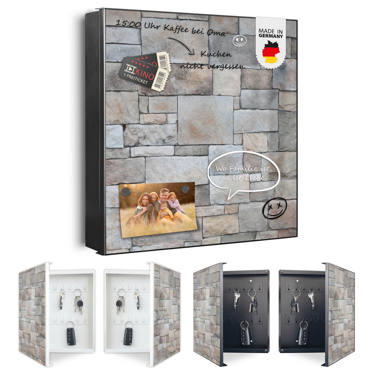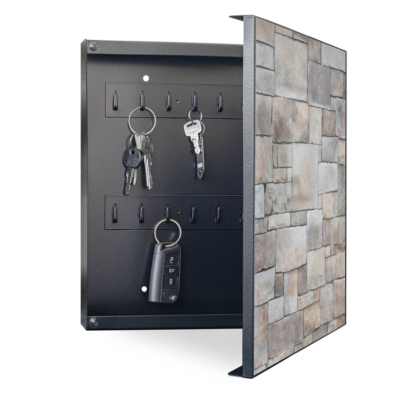 Bringe Ordnung und Eleganz in deinen Eingangsbereich mit dem banjado Schlüsselkasten Motiv Motiv Natursteinmauer. Die moderne Schlüsselbox kombiniert funktionales Design mit hochwertiger Verarbeitung und wird so zu einem echten Hingucker in Flur, Büro oder Ferienwohnung. ✅ Stilvolle Schlüsselaufbewahrung mit Motiv Motiv Natursteinmauer Der Design-Schlüsselkasten Motiv Motiv Natursteinmauer bietet Platz für bis zu 32 Schlüssel, die auf 4 stabilen Reihen mit je 8 Haken übersichtlich verstaut werden. Mit seinen kompakten Maßen von 30 x 30 x 5 cm passt die Schlüsselbox perfekt auch in kleinere Räume. Der schwarz lackierte Stahlkorpus mit rechts angeschlagenem Türscharnier harmoniert mit gedruckten Folie auf der Front und fügt sich nahtlos in jedes Wohnambiente ein. Ob als Schlüsselorganizer für Zuhause oder als praktische Lösung für Büros, Praxen und Gewerbe, der banjado Schlüsselkasten sorgt für Ordnung und Übersicht. Dank der magnetischen, mit Kreidestiften beschreibbaren Folie auf der Front kannst du Notizen anheften oder Termine direkt auf der Oberfläche festhalten. Die Schlüsselbox Motiv Motiv Natursteinmauer zur Wandmontage wird inklusive Befestigungsmaterial geliefert und ist schnell angebracht. So hast du deine Schlüssel jederzeit griffbereit und zugleich stilvoll verstaut. Mit diesem banjado Schlüsselkasten Motiv Motiv Natursteinmauer kombinierst du praktische Aufbewahrung mit stilvollem Wohndesign. Ob privat oder geschäftlich, die Schlüsselbox sorgt für mehr Ordnung, Übersicht und ein wohnliches Ambiente.Vorteile im Überblick