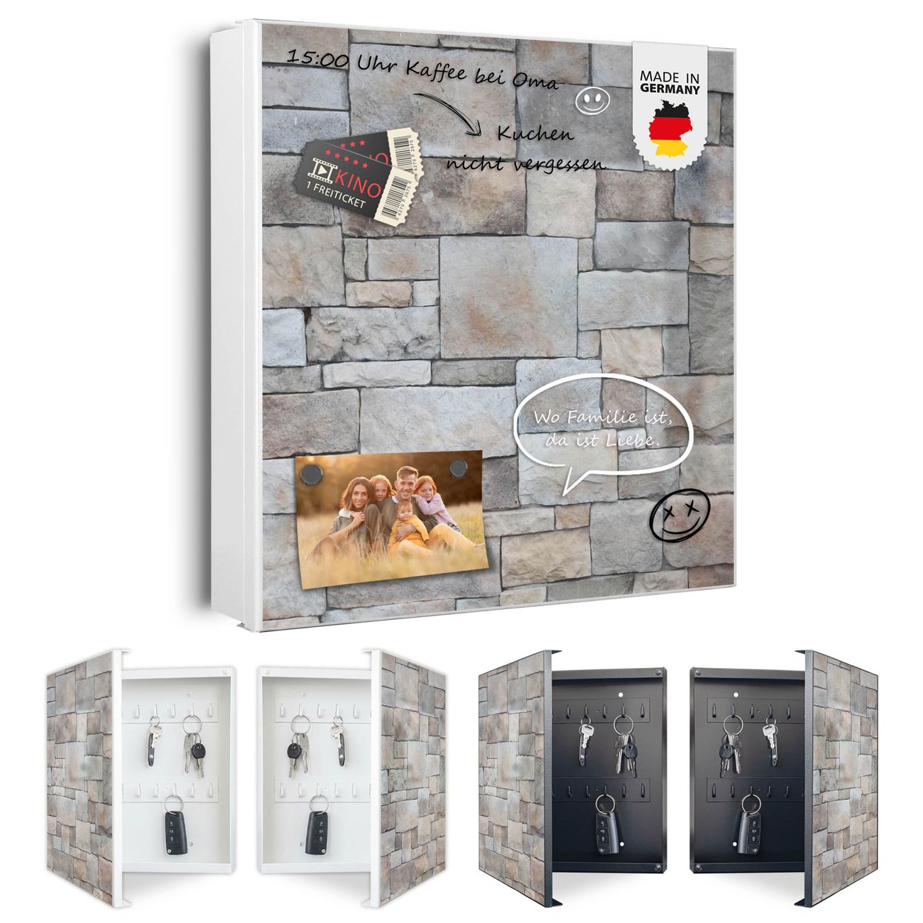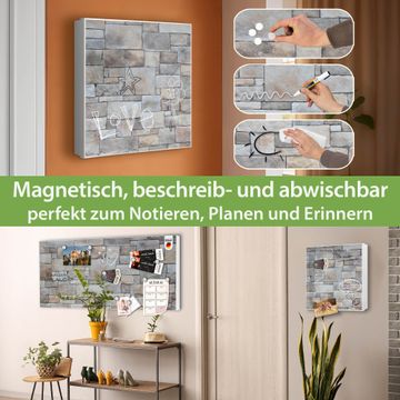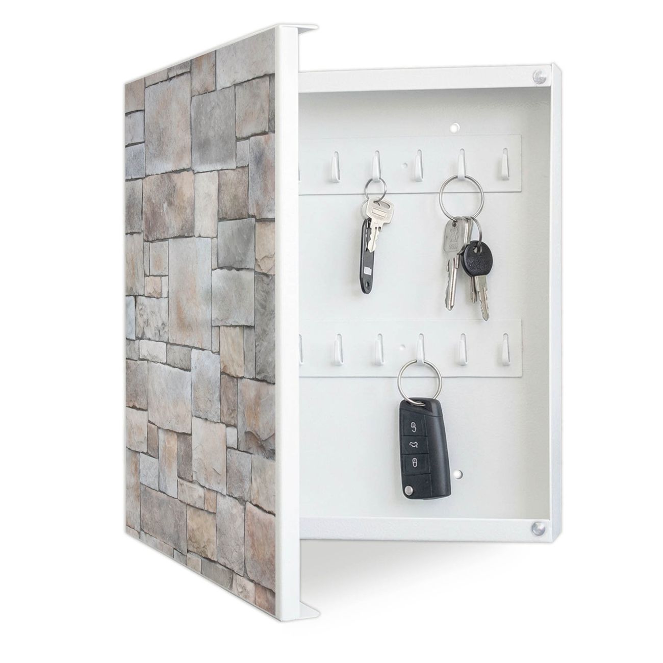 Bringe Ordnung und Eleganz in deinen Eingangsbereich mit dem banjado Schlüsselkasten Motiv Motiv Natursteinmauer. Die moderne Schlüsselbox kombiniert funktionales Design mit hochwertiger Verarbeitung und wird so zu einem echten Hingucker in Flur, Büro oder Ferienwohnung. ✅ Stilvolle Schlüsselaufbewahrung mit Motiv Motiv Natursteinmauer Der Design-Schlüsselkasten Motiv Motiv Natursteinmauer bietet Platz für bis zu 32 Schlüssel, die auf 4 stabilen Reihen mit je 8 Haken übersichtlich verstaut werden. Mit seinen kompakten Maßen von 30 x 30 x 5 cm passt die Schlüsselbox perfekt auch in kleinere Räume. Der weiß lackierte Stahlkorpus mit links angeschlagenem Türscharnier harmoniert mit gedruckten Folie auf der Front und fügt sich nahtlos in jedes Wohnambiente ein. Ob als Schlüsselorganizer für Zuhause oder als praktische Lösung für Büros, Praxen und Gewerbe, der banjado Schlüsselkasten sorgt für Ordnung und Übersicht. Dank der magnetischen, mit Kreidestiften beschreibbaren Folie auf der Front kannst du Notizen anheften oder Termine direkt auf der Oberfläche festhalten. Die Schlüsselbox Motiv Motiv Natursteinmauer zur Wandmontage wird inklusive Befestigungsmaterial geliefert und ist schnell angebracht. So hast du deine Schlüssel jederzeit griffbereit und zugleich stilvoll verstaut. Mit diesem banjado Schlüsselkasten Motiv Motiv Natursteinmauer kombinierst du praktische Aufbewahrung mit stilvollem Wohndesign. Ob privat oder geschäftlich, die Schlüsselbox sorgt für mehr Ordnung, Übersicht und ein wohnliches Ambiente.Vorteile im Überblick
