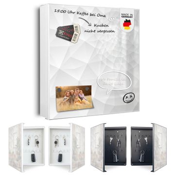 Bringe Ordnung und Eleganz in deinen Eingangsbereich mit dem banjado Schlüsselkasten Motiv Motiv Nautilus. Die moderne Schlüsselbox kombiniert funktionales Design mit hochwertiger Verarbeitung und wird so zu einem echten Hingucker in Flur, Büro oder Ferienwohnung. ✅ Stilvolle Schlüsselaufbewahrung mit Motiv Motiv Nautilus Der Design-Schlüsselkasten Motiv Motiv Nautilus bietet Platz für bis zu 32 Schlüssel, die auf 4 stabilen Reihen mit je 8 Haken übersichtlich verstaut werden. Mit seinen kompakten Maßen von 30 x 30 x 5 cm passt die Schlüsselbox perfekt auch in kleinere Räume. Der weiß lackierte Stahlkorpus mit rechts angeschlagenem Türscharnier harmoniert mit gedruckten Folie auf der Front und fügt sich nahtlos in jedes Wohnambiente ein. Ob als Schlüsselorganizer für Zuhause oder als praktische Lösung für Büros, Praxen und Gewerbe, der banjado Schlüsselkasten sorgt für Ordnung und Übersicht. Dank der magnetischen, mit Kreidestiften beschreibbaren Folie auf der Front kannst du Notizen anheften oder Termine direkt auf der Oberfläche festhalten. Die Schlüsselbox Motiv Motiv Nautilus zur Wandmontage wird inklusive Befestigungsmaterial geliefert und ist schnell angebracht. So hast du deine Schlüssel jederzeit griffbereit und zugleich stilvoll verstaut. Mit diesem banjado Schlüsselkasten Motiv Motiv Nautilus kombinierst du praktische Aufbewahrung mit stilvollem Wohndesign. Ob privat oder geschäftlich, die Schlüsselbox sorgt für mehr Ordnung, Übersicht und ein wohnliches Ambiente.Vorteile im Überblick