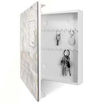 Bringe Ordnung und Eleganz in deinen Eingangsbereich mit dem banjado Schlüsselkasten Motiv Motiv Nautilus. Die moderne Schlüsselbox kombiniert funktionales Design mit hochwertiger Verarbeitung und wird so zu einem echten Hingucker in Flur, Büro oder Ferienwohnung. ✅ Stilvolle Schlüsselaufbewahrung mit Glasfront im Motiv Motiv Nautilus Der Design-Schlüsselkasten Motiv Motiv Nautilus bietet Platz für bis zu 50 Schlüssel, die auf 5 stabilen Reihen mit je 10 Haken übersichtlich verstaut werden. Mit seinen kompakten Maßen von 30 x 30 x 5 cm passt die Schlüsselbox perfekt auch in kleinere Räume. Der weiß lackierte Stahlkorpus mit rechts angeschlagenem Türscharnier harmoniert mit der Glasfront und fügt sich nahtlos in jedes Wohnambiente ein. Ob als Schlüsselorganizer für Zuhause oder als praktische Lösung für Büros, Praxen und Gewerbe, der banjado Schlüsselkasten sorgt für Ordnung und Übersicht. Dank der magnetischen, mit Kreidestiften beschreibbaren Glasfront kannst du Notizen anheften oder Termine direkt auf der Oberfläche festhalten. Die Schlüsselbox Motiv Motiv Nautilus zur Wandmontage wird inklusive Befestigungsmaterial geliefert und ist schnell angebracht. So hast du deine Schlüssel jederzeit griffbereit und zugleich stilvoll verstaut. Mit diesem banjado Schlüsselkasten Motiv Motiv Nautilus kombinierst du praktische Aufbewahrung mit stilvollem Wohndesign. Ob privat oder geschäftlich, die Schlüsselbox sorgt für mehr Ordnung, Übersicht und ein wohnliches Ambiente.Vorteile im Überblick