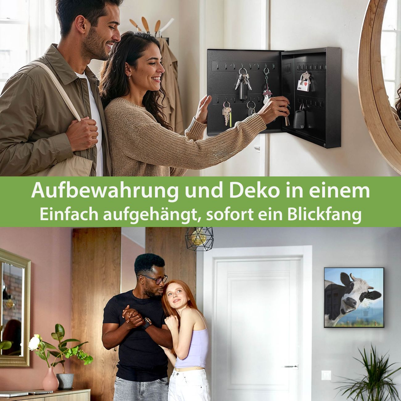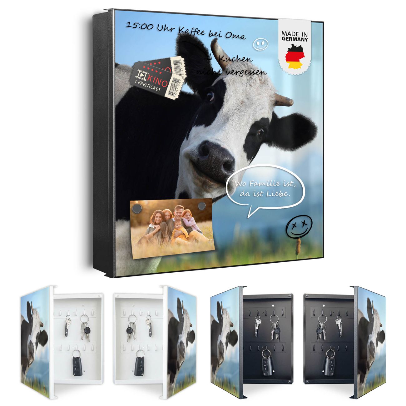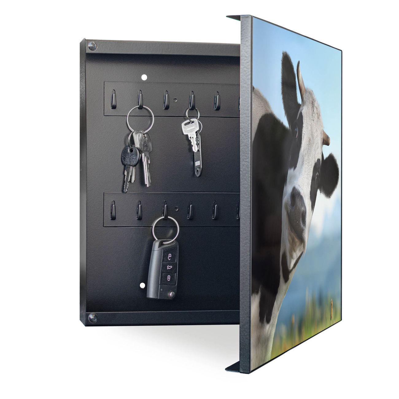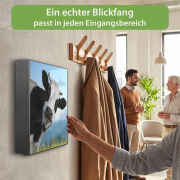 Bringe Ordnung und Eleganz in deinen Eingangsbereich mit dem banjado Schlüsselkasten Motiv Motiv Neugierig. Die moderne Schlüsselbox kombiniert funktionales Design mit hochwertiger Verarbeitung und wird so zu einem echten Hingucker in Flur, Büro oder Ferienwohnung. ✅ Stilvolle Schlüsselaufbewahrung mit Motiv Motiv Neugierig Der Design-Schlüsselkasten Motiv Motiv Neugierig bietet Platz für bis zu 32 Schlüssel, die auf 4 stabilen Reihen mit je 8 Haken übersichtlich verstaut werden. Mit seinen kompakten Maßen von 30 x 30 x 5 cm passt die Schlüsselbox perfekt auch in kleinere Räume. Der schwarz lackierte Stahlkorpus mit rechts angeschlagenem Türscharnier harmoniert mit gedruckten Folie auf der Front und fügt sich nahtlos in jedes Wohnambiente ein. Ob als Schlüsselorganizer für Zuhause oder als praktische Lösung für Büros, Praxen und Gewerbe, der banjado Schlüsselkasten sorgt für Ordnung und Übersicht. Dank der magnetischen, mit Kreidestiften beschreibbaren Folie auf der Front kannst du Notizen anheften oder Termine direkt auf der Oberfläche festhalten. Die Schlüsselbox Motiv Motiv Neugierig zur Wandmontage wird inklusive Befestigungsmaterial geliefert und ist schnell angebracht. So hast du deine Schlüssel jederzeit griffbereit und zugleich stilvoll verstaut. Mit diesem banjado Schlüsselkasten Motiv Motiv Neugierig kombinierst du praktische Aufbewahrung mit stilvollem Wohndesign. Ob privat oder geschäftlich, die Schlüsselbox sorgt für mehr Ordnung, Übersicht und ein wohnliches Ambiente.Vorteile im Überblick
