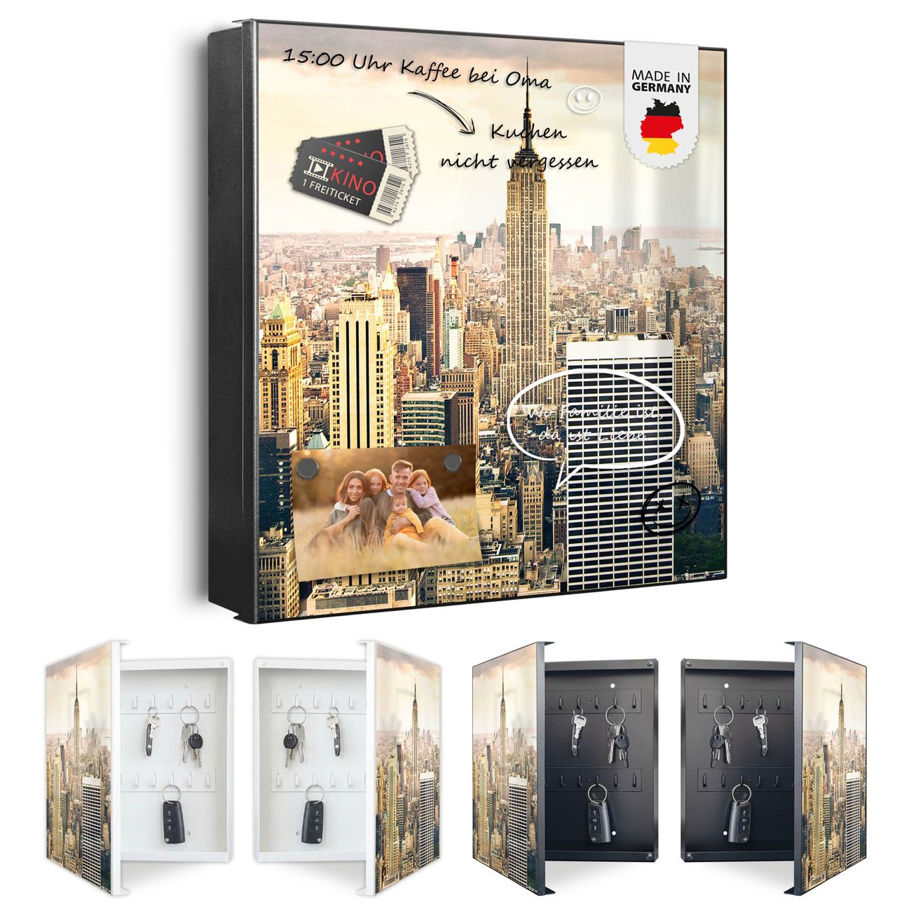 Bringe Ordnung und Eleganz in deinen Eingangsbereich mit dem banjado Schlüsselkasten Motiv Motiv New York City. Die moderne Schlüsselbox kombiniert funktionales Design mit hochwertiger Verarbeitung und wird so zu einem echten Hingucker in Flur, Büro oder Ferienwohnung. ✅ Stilvolle Schlüsselaufbewahrung mit Motiv Motiv New York City Der Design-Schlüsselkasten Motiv Motiv New York City bietet Platz für bis zu 32 Schlüssel, die auf 4 stabilen Reihen mit je 8 Haken übersichtlich verstaut werden. Mit seinen kompakten Maßen von 30 x 30 x 5 cm passt die Schlüsselbox perfekt auch in kleinere Räume. Der schwarz lackierte Stahlkorpus mit links angeschlagenem Türscharnier harmoniert mit gedruckten Folie auf der Front und fügt sich nahtlos in jedes Wohnambiente ein. Ob als Schlüsselorganizer für Zuhause oder als praktische Lösung für Büros, Praxen und Gewerbe, der banjado Schlüsselkasten sorgt für Ordnung und Übersicht. Dank der magnetischen, mit Kreidestiften beschreibbaren Folie auf der Front kannst du Notizen anheften oder Termine direkt auf der Oberfläche festhalten. Die Schlüsselbox Motiv Motiv New York City zur Wandmontage wird inklusive Befestigungsmaterial geliefert und ist schnell angebracht. So hast du deine Schlüssel jederzeit griffbereit und zugleich stilvoll verstaut. Mit diesem banjado Schlüsselkasten Motiv Motiv New York City kombinierst du praktische Aufbewahrung mit stilvollem Wohndesign. Ob privat oder geschäftlich, die Schlüsselbox sorgt für mehr Ordnung, Übersicht und ein wohnliches Ambiente.Vorteile im Überblick