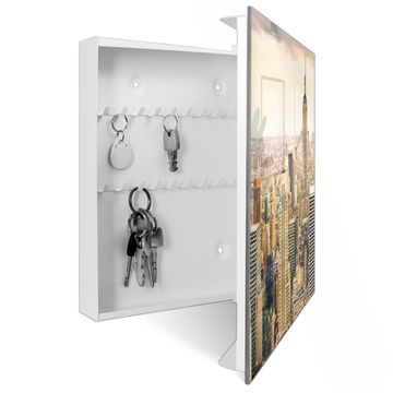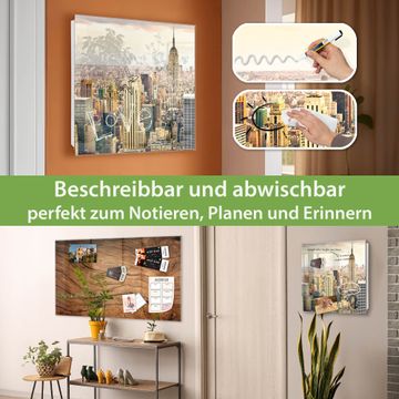 Bringe Ordnung und Eleganz in deinen Eingangsbereich mit dem banjado Schlüsselkasten Motiv Motiv New York City. Die moderne Schlüsselbox kombiniert funktionales Design mit hochwertiger Verarbeitung und wird so zu einem echten Hingucker in Flur, Büro oder Ferienwohnung. ✅ Stilvolle Schlüsselaufbewahrung mit Glasfront im Motiv Motiv New York City Der Design-Schlüsselkasten Motiv Motiv New York City bietet Platz für bis zu 50 Schlüssel, die auf 5 stabilen Reihen mit je 10 Haken übersichtlich verstaut werden. Mit seinen kompakten Maßen von 30 x 30 x 5 cm passt die Schlüsselbox perfekt auch in kleinere Räume. Der weiß lackierte Stahlkorpus mit rechts angeschlagenem Türscharnier harmoniert mit der Glasfront und fügt sich nahtlos in jedes Wohnambiente ein. Ob als Schlüsselorganizer für Zuhause oder als praktische Lösung für Büros, Praxen und Gewerbe, der banjado Schlüsselkasten sorgt für Ordnung und Übersicht. Dank der magnetischen, mit Kreidestiften beschreibbaren Glasfront kannst du Notizen anheften oder Termine direkt auf der Oberfläche festhalten. Die Schlüsselbox Motiv Motiv New York City zur Wandmontage wird inklusive Befestigungsmaterial geliefert und ist schnell angebracht. So hast du deine Schlüssel jederzeit griffbereit und zugleich stilvoll verstaut. Mit diesem banjado Schlüsselkasten Motiv Motiv New York City kombinierst du praktische Aufbewahrung mit stilvollem Wohndesign. Ob privat oder geschäftlich, die Schlüsselbox sorgt für mehr Ordnung, Übersicht und ein wohnliches Ambiente.Vorteile im Überblick