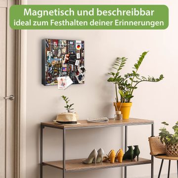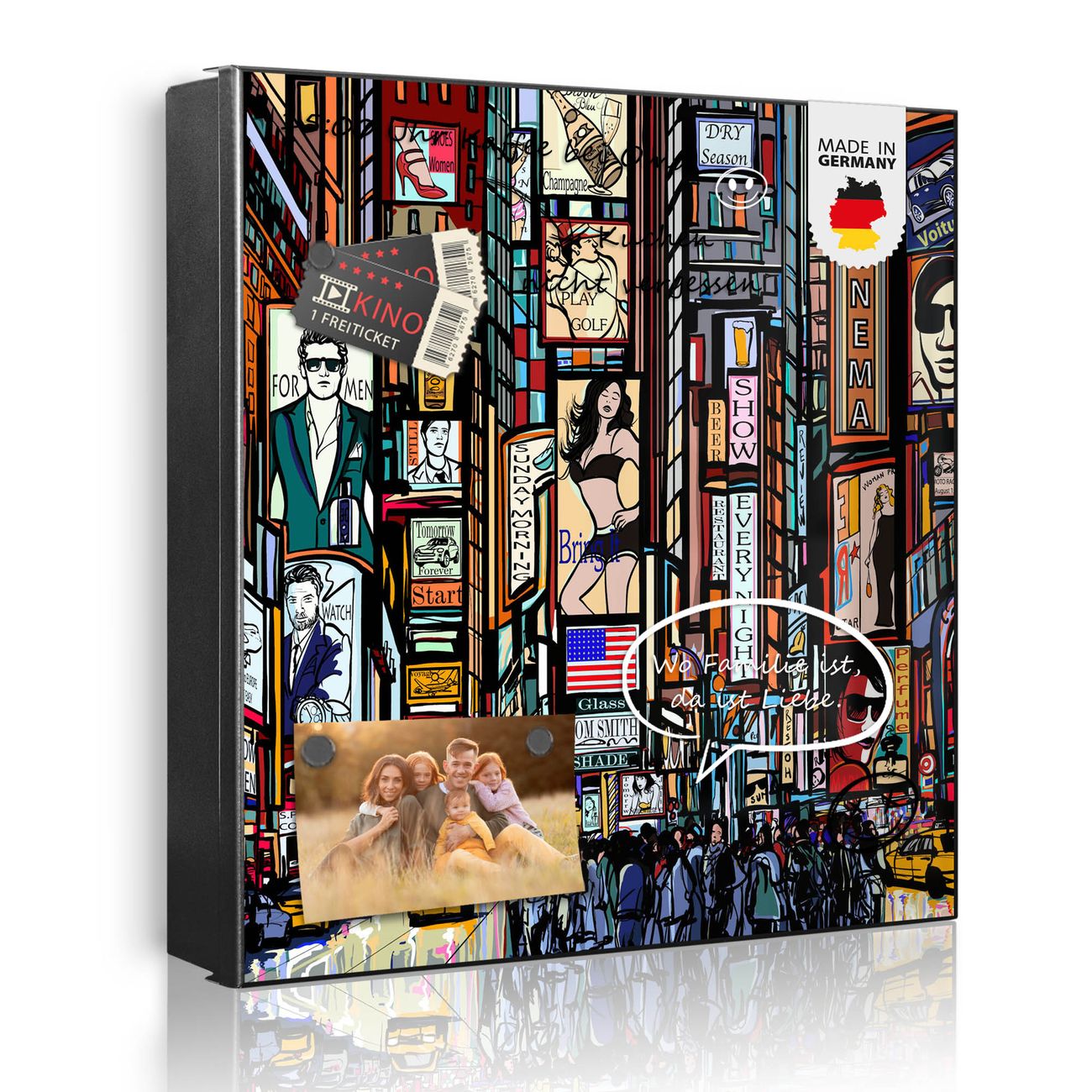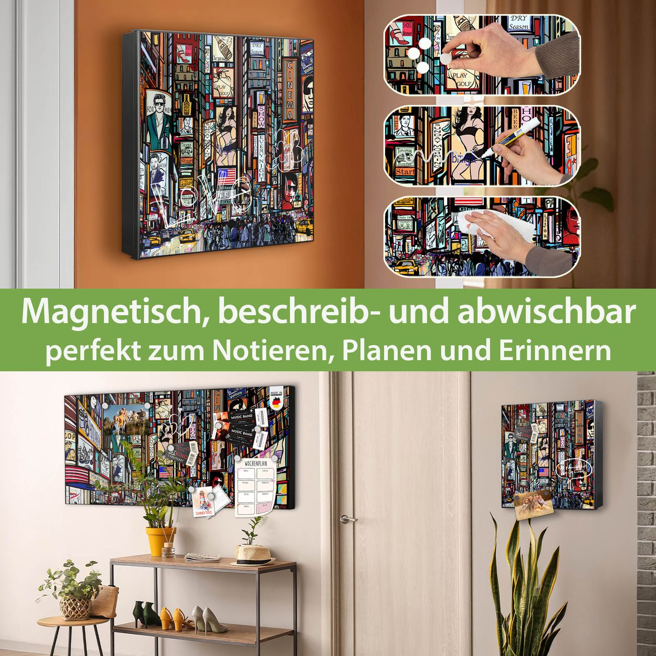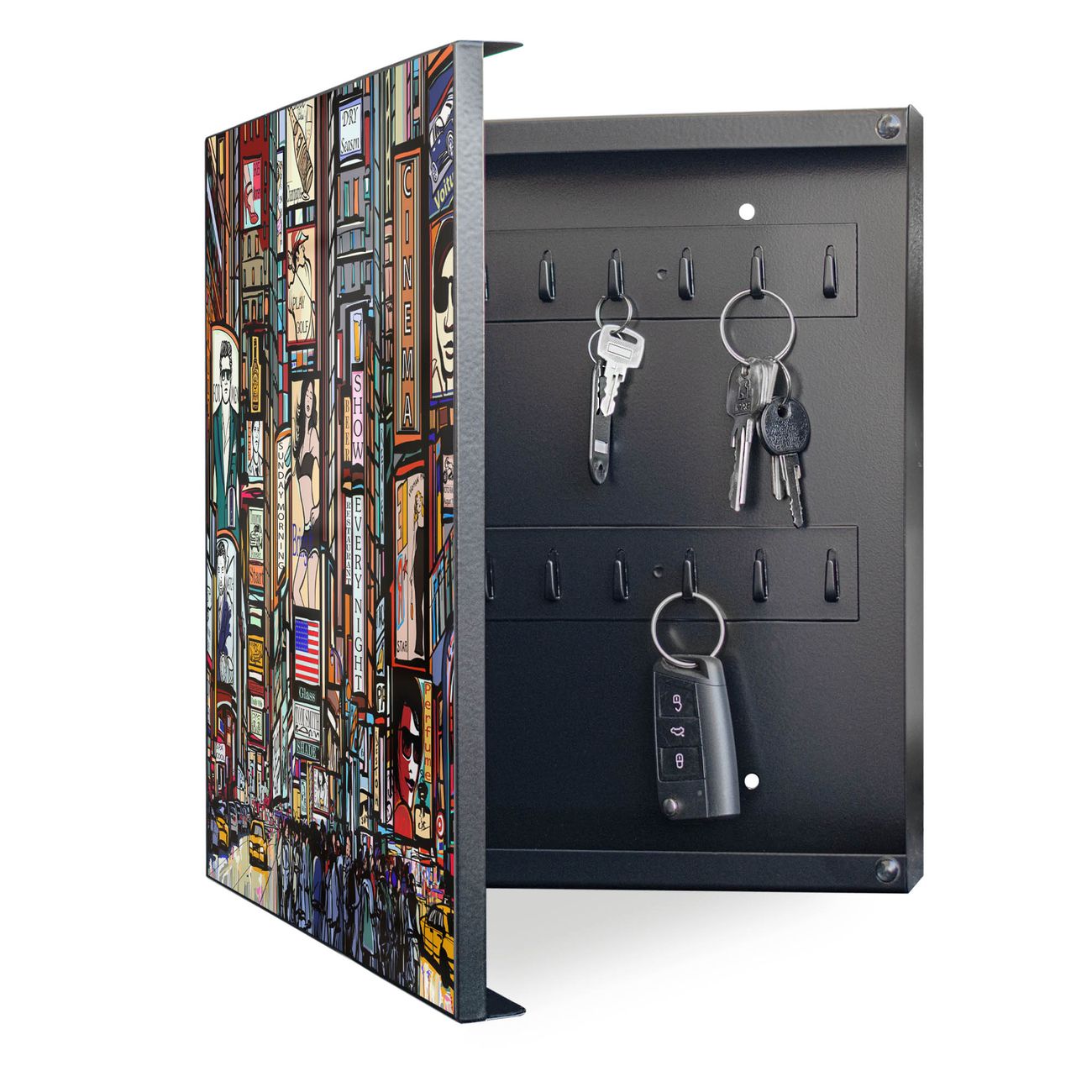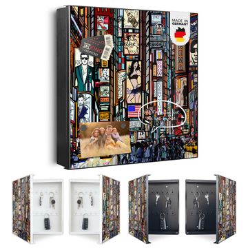 Bringe Ordnung und Eleganz in deinen Eingangsbereich mit dem banjado Schlüsselkasten Motiv Motiv New York Show. Die moderne Schlüsselbox kombiniert funktionales Design mit hochwertiger Verarbeitung und wird so zu einem echten Hingucker in Flur, Büro oder Ferienwohnung. ✅ Stilvolle Schlüsselaufbewahrung mit Motiv Motiv New York Show Der Design-Schlüsselkasten Motiv Motiv New York Show bietet Platz für bis zu 32 Schlüssel, die auf 4 stabilen Reihen mit je 8 Haken übersichtlich verstaut werden. Mit seinen kompakten Maßen von 30 x 30 x 5 cm passt die Schlüsselbox perfekt auch in kleinere Räume. Der schwarz lackierte Stahlkorpus mit links angeschlagenem Türscharnier harmoniert mit gedruckten Folie auf der Front und fügt sich nahtlos in jedes Wohnambiente ein. Ob als Schlüsselorganizer für Zuhause oder als praktische Lösung für Büros, Praxen und Gewerbe, der banjado Schlüsselkasten sorgt für Ordnung und Übersicht. Dank der magnetischen, mit Kreidestiften beschreibbaren Folie auf der Front kannst du Notizen anheften oder Termine direkt auf der Oberfläche festhalten. Die Schlüsselbox Motiv Motiv New York Show zur Wandmontage wird inklusive Befestigungsmaterial geliefert und ist schnell angebracht. So hast du deine Schlüssel jederzeit griffbereit und zugleich stilvoll verstaut. Mit diesem banjado Schlüsselkasten Motiv Motiv New York Show kombinierst du praktische Aufbewahrung mit stilvollem Wohndesign. Ob privat oder geschäftlich, die Schlüsselbox sorgt für mehr Ordnung, Übersicht und ein wohnliches Ambiente.Vorteile im Überblick