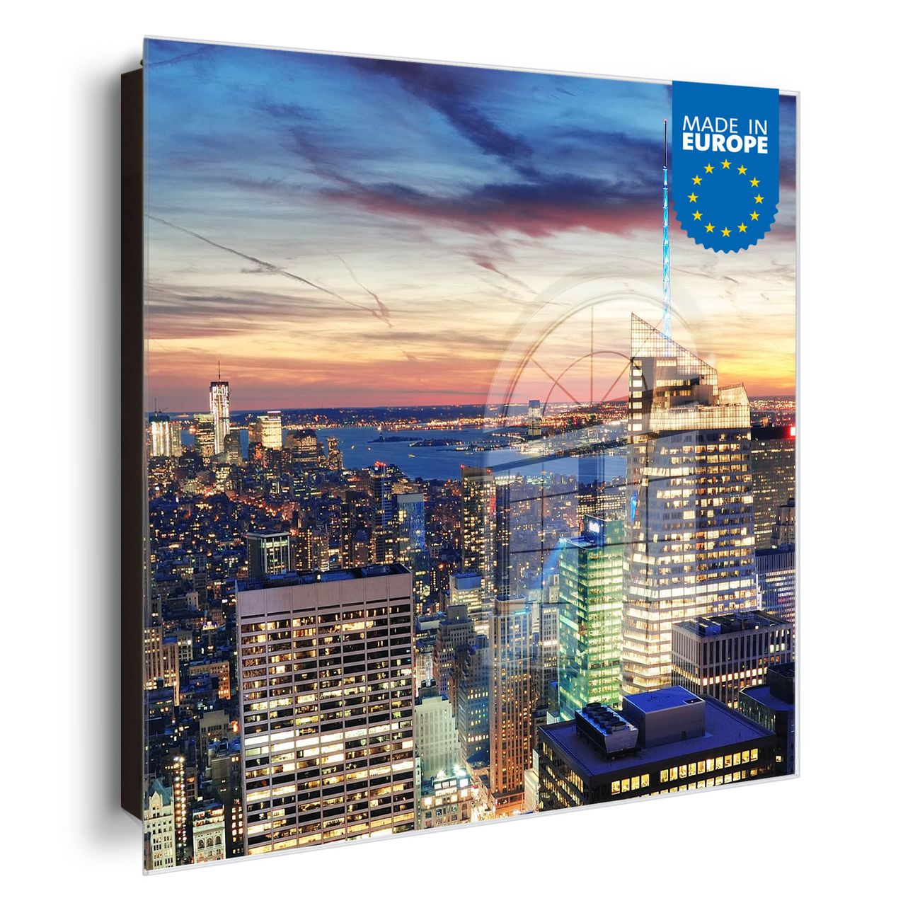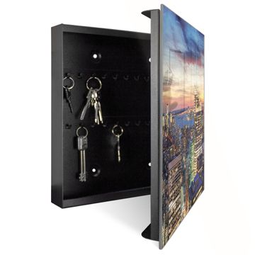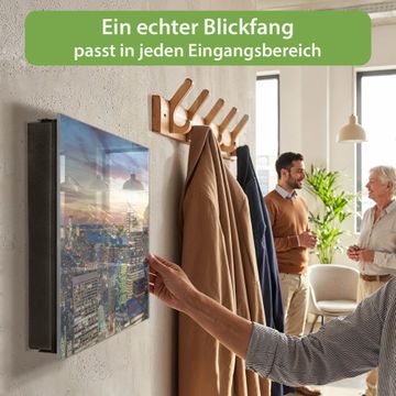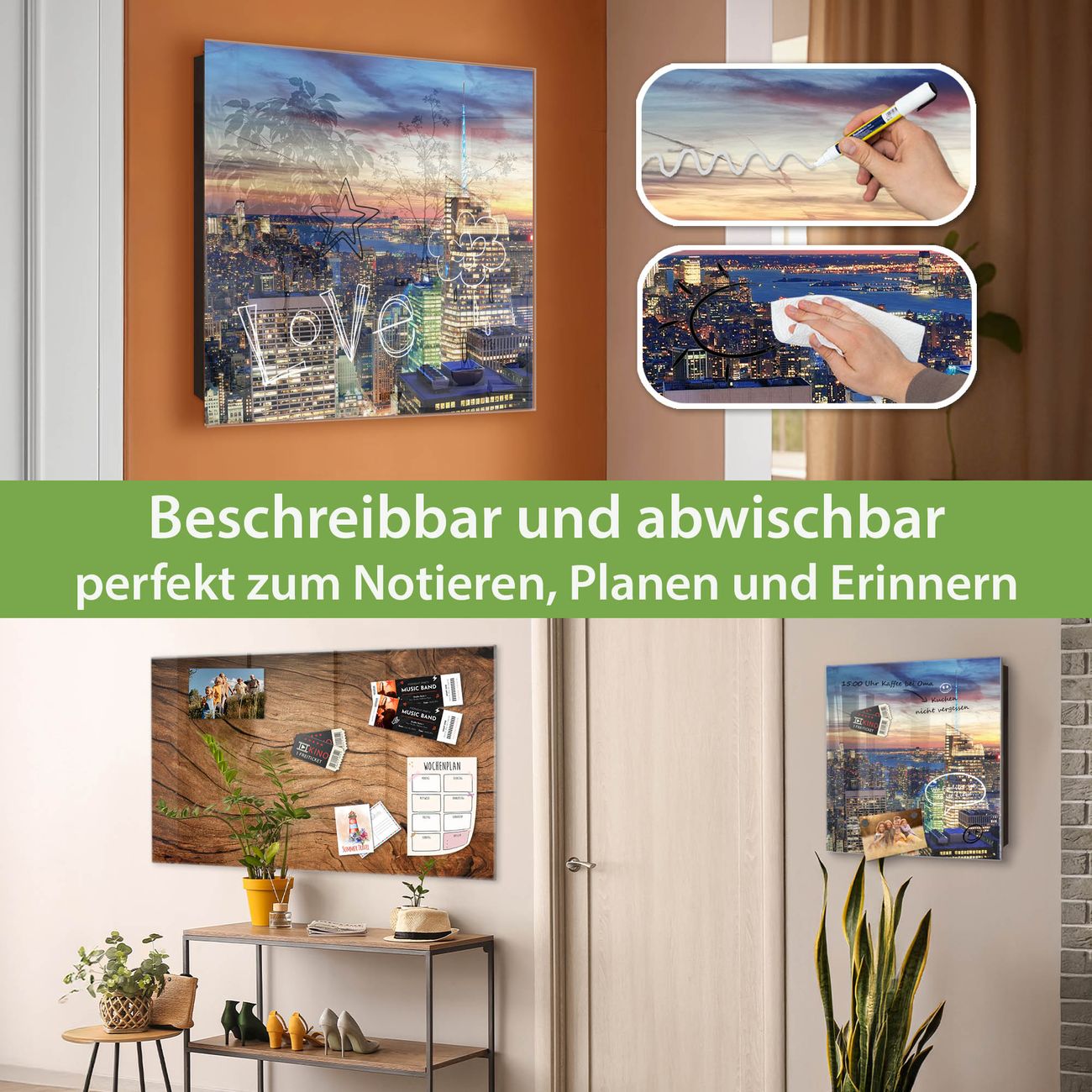 Bringe Ordnung und Eleganz in deinen Eingangsbereich mit dem banjado Schlüsselkasten Motiv Motiv New York Sunset. Die moderne Schlüsselbox kombiniert funktionales Design mit hochwertiger Verarbeitung und wird so zu einem echten Hingucker in Flur, Büro oder Ferienwohnung. ✅ Stilvolle Schlüsselaufbewahrung mit Glasfront im Motiv Motiv New York Sunset Der Design-Schlüsselkasten Motiv Motiv New York Sunset bietet Platz für bis zu 50 Schlüssel, die auf 5 stabilen Reihen mit je 10 Haken übersichtlich verstaut werden. Mit seinen kompakten Maßen von 30 x 30 x 5 cm passt die Schlüsselbox perfekt auch in kleinere Räume. Der schwarz lackierte Stahlkorpus mit rechts angeschlagenem Türscharnier harmoniert mit der Glasfront und fügt sich nahtlos in jedes Wohnambiente ein. Ob als Schlüsselorganizer für Zuhause oder als praktische Lösung für Büros, Praxen und Gewerbe, der banjado Schlüsselkasten sorgt für Ordnung und Übersicht. Dank der magnetischen, mit Kreidestiften beschreibbaren Glasfront kannst du Notizen anheften oder Termine direkt auf der Oberfläche festhalten. Die Schlüsselbox Motiv Motiv New York Sunset zur Wandmontage wird inklusive Befestigungsmaterial geliefert und ist schnell angebracht. So hast du deine Schlüssel jederzeit griffbereit und zugleich stilvoll verstaut. Mit diesem banjado Schlüsselkasten Motiv Motiv New York Sunset kombinierst du praktische Aufbewahrung mit stilvollem Wohndesign. Ob privat oder geschäftlich, die Schlüsselbox sorgt für mehr Ordnung, Übersicht und ein wohnliches Ambiente.Vorteile im Überblick