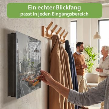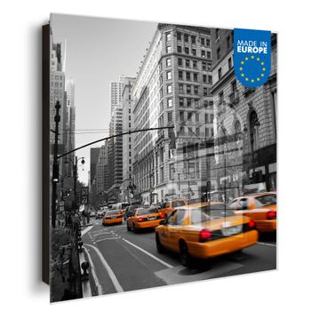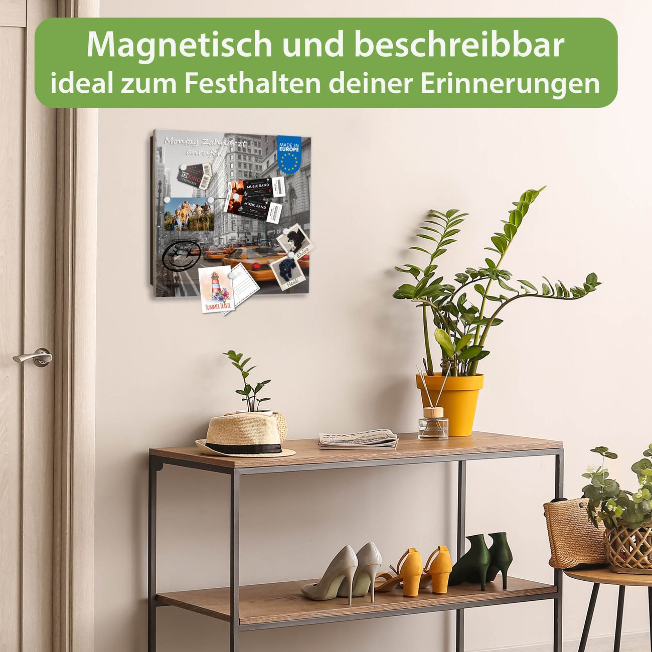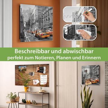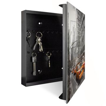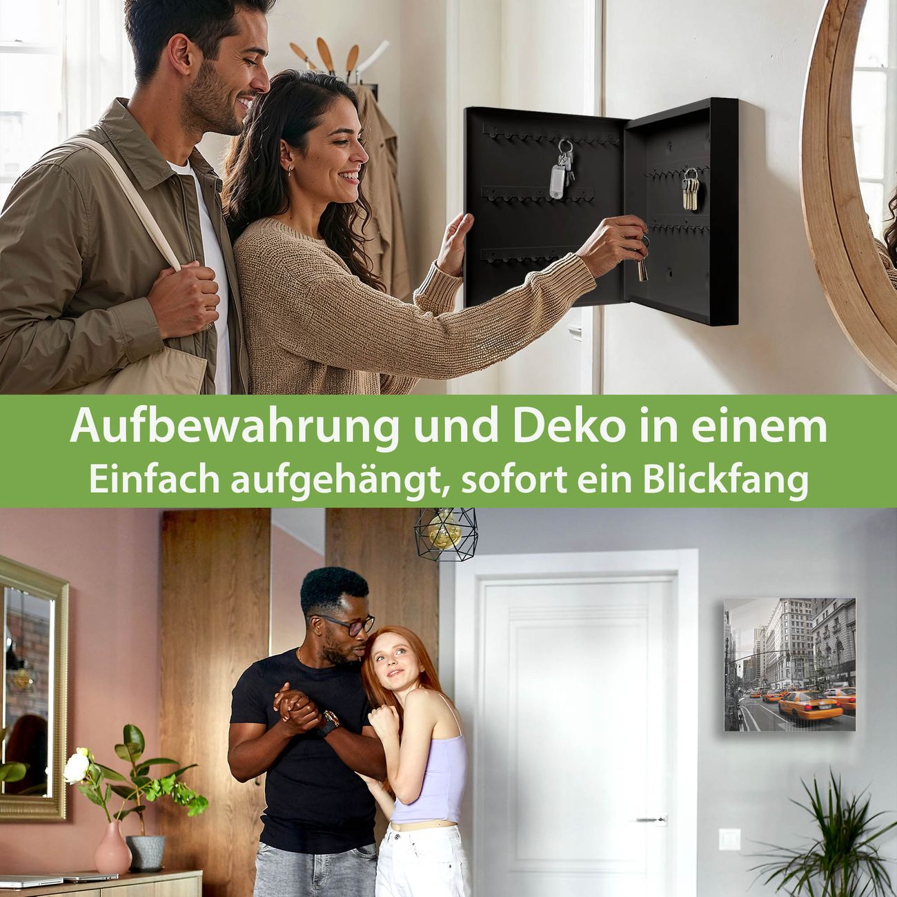 Bringe Ordnung und Eleganz in deinen Eingangsbereich mit dem banjado Schlüsselkasten Motiv Motiv New York Taxi. Die moderne Schlüsselbox kombiniert funktionales Design mit hochwertiger Verarbeitung und wird so zu einem echten Hingucker in Flur, Büro oder Ferienwohnung. ✅ Stilvolle Schlüsselaufbewahrung mit Glasfront im Motiv Motiv New York Taxi Der Design-Schlüsselkasten Motiv Motiv New York Taxi bietet Platz für bis zu 50 Schlüssel, die auf 5 stabilen Reihen mit je 10 Haken übersichtlich verstaut werden. Mit seinen kompakten Maßen von 30 x 30 x 5 cm passt die Schlüsselbox perfekt auch in kleinere Räume. Der schwarz lackierte Stahlkorpus mit rechts angeschlagenem Türscharnier harmoniert mit der Glasfront und fügt sich nahtlos in jedes Wohnambiente ein. Ob als Schlüsselorganizer für Zuhause oder als praktische Lösung für Büros, Praxen und Gewerbe, der banjado Schlüsselkasten sorgt für Ordnung und Übersicht. Dank der magnetischen, mit Kreidestiften beschreibbaren Glasfront kannst du Notizen anheften oder Termine direkt auf der Oberfläche festhalten. Die Schlüsselbox Motiv Motiv New York Taxi zur Wandmontage wird inklusive Befestigungsmaterial geliefert und ist schnell angebracht. So hast du deine Schlüssel jederzeit griffbereit und zugleich stilvoll verstaut. Mit diesem banjado Schlüsselkasten Motiv Motiv New York Taxi kombinierst du praktische Aufbewahrung mit stilvollem Wohndesign. Ob privat oder geschäftlich, die Schlüsselbox sorgt für mehr Ordnung, Übersicht und ein wohnliches Ambiente.Vorteile im Überblick