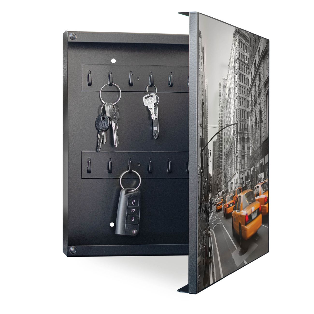 Bringe Ordnung und Eleganz in deinen Eingangsbereich mit dem banjado Schlüsselkasten Motiv Motiv New York Taxi. Die moderne Schlüsselbox kombiniert funktionales Design mit hochwertiger Verarbeitung und wird so zu einem echten Hingucker in Flur, Büro oder Ferienwohnung. ✅ Stilvolle Schlüsselaufbewahrung mit Motiv Motiv New York Taxi Der Design-Schlüsselkasten Motiv Motiv New York Taxi bietet Platz für bis zu 32 Schlüssel, die auf 4 stabilen Reihen mit je 8 Haken übersichtlich verstaut werden. Mit seinen kompakten Maßen von 30 x 30 x 5 cm passt die Schlüsselbox perfekt auch in kleinere Räume. Der schwarz lackierte Stahlkorpus mit rechts angeschlagenem Türscharnier harmoniert mit gedruckten Folie auf der Front und fügt sich nahtlos in jedes Wohnambiente ein. Ob als Schlüsselorganizer für Zuhause oder als praktische Lösung für Büros, Praxen und Gewerbe, der banjado Schlüsselkasten sorgt für Ordnung und Übersicht. Dank der magnetischen, mit Kreidestiften beschreibbaren Folie auf der Front kannst du Notizen anheften oder Termine direkt auf der Oberfläche festhalten. Die Schlüsselbox Motiv Motiv New York Taxi zur Wandmontage wird inklusive Befestigungsmaterial geliefert und ist schnell angebracht. So hast du deine Schlüssel jederzeit griffbereit und zugleich stilvoll verstaut. Mit diesem banjado Schlüsselkasten Motiv Motiv New York Taxi kombinierst du praktische Aufbewahrung mit stilvollem Wohndesign. Ob privat oder geschäftlich, die Schlüsselbox sorgt für mehr Ordnung, Übersicht und ein wohnliches Ambiente.Vorteile im Überblick