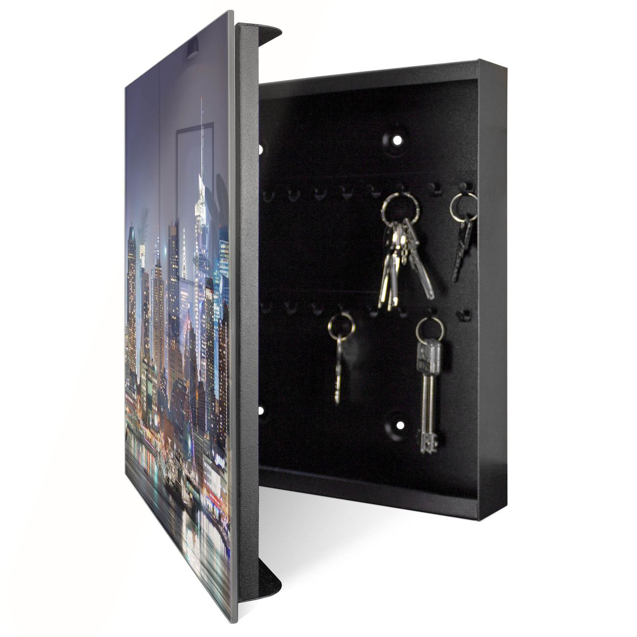Bringe Ordnung und Eleganz in deinen Eingangsbereich mit dem banjado Schlüsselkasten Motiv Motiv New York. Die moderne Schlüsselbox kombiniert funktionales Design mit hochwertiger Verarbeitung und wird so zu einem echten Hingucker in Flur, Büro oder Ferienwohnung. ✅ Stilvolle Schlüsselaufbewahrung mit Glasfront im Motiv Motiv New York Der Design-Schlüsselkasten Motiv Motiv New York bietet Platz für bis zu 50 Schlüssel, die auf 5 stabilen Reihen mit je 10 Haken übersichtlich verstaut werden. Mit seinen kompakten Maßen von 30 x 30 x 5 cm passt die Schlüsselbox perfekt auch in kleinere Räume. Der schwarz lackierte Stahlkorpus mit rechts angeschlagenem Türscharnier harmoniert mit der Glasfront und fügt sich nahtlos in jedes Wohnambiente ein. Ob als Schlüsselorganizer für Zuhause oder als praktische Lösung für Büros, Praxen und Gewerbe, der banjado Schlüsselkasten sorgt für Ordnung und Übersicht. Dank der magnetischen, mit Kreidestiften beschreibbaren Glasfront kannst du Notizen anheften oder Termine direkt auf der Oberfläche festhalten. Die Schlüsselbox Motiv Motiv New York zur Wandmontage wird inklusive Befestigungsmaterial geliefert und ist schnell angebracht. So hast du deine Schlüssel jederzeit griffbereit und zugleich stilvoll verstaut. Mit diesem banjado Schlüsselkasten Motiv Motiv New York kombinierst du praktische Aufbewahrung mit stilvollem Wohndesign. Ob privat oder geschäftlich, die Schlüsselbox sorgt für mehr Ordnung, Übersicht und ein wohnliches Ambiente.Vorteile im Überblick