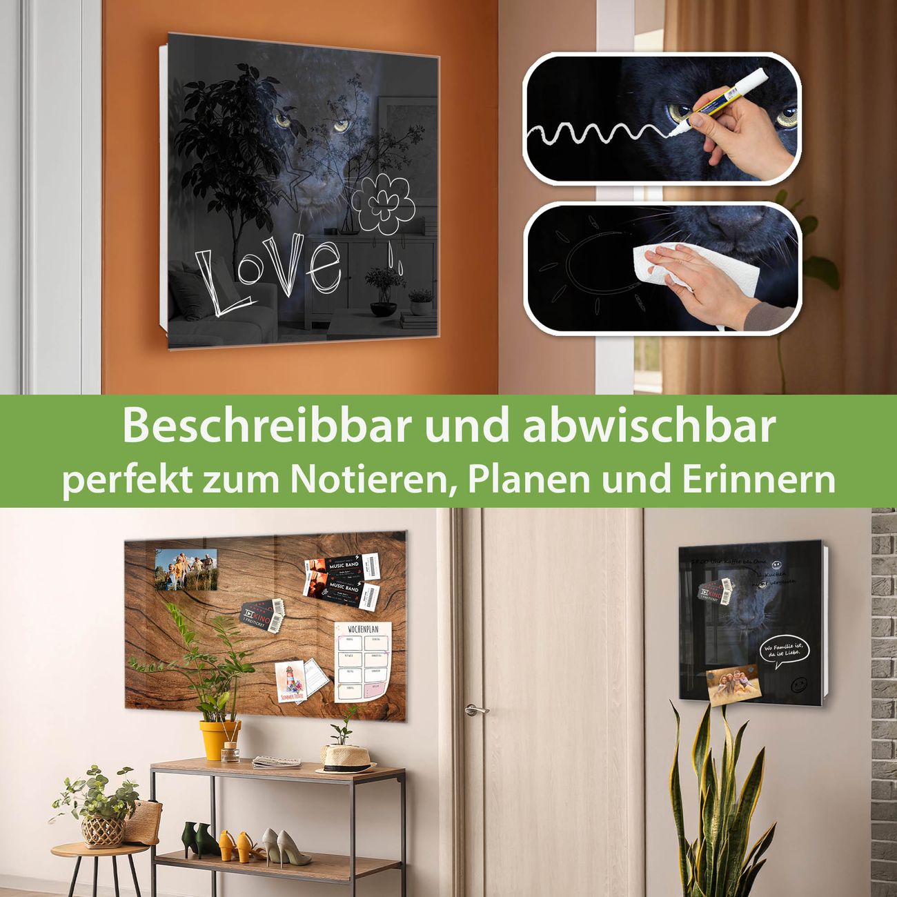 ✅ Magnetisch und mit Kreidestift beschreibbar, gehärtetes Glas, links angeschlagene TürOrdnung und Design in einem