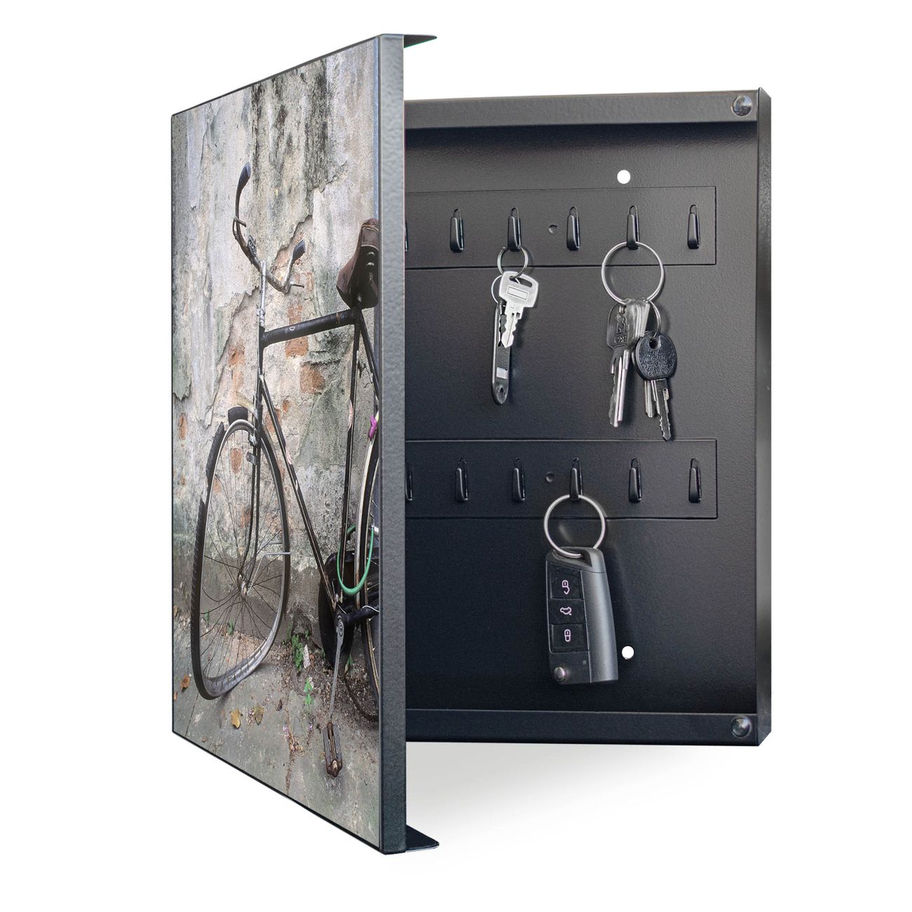 Bringe Ordnung und Eleganz in deinen Eingangsbereich mit dem banjado Schlüsselkasten Motiv Motiv Nostalgie Rad. Die moderne Schlüsselbox kombiniert funktionales Design mit hochwertiger Verarbeitung und wird so zu einem echten Hingucker in Flur, Büro oder Ferienwohnung. ✅ Stilvolle Schlüsselaufbewahrung mit Motiv Motiv Nostalgie Rad Der Design-Schlüsselkasten Motiv Motiv Nostalgie Rad bietet Platz für bis zu 32 Schlüssel, die auf 4 stabilen Reihen mit je 8 Haken übersichtlich verstaut werden. Mit seinen kompakten Maßen von 30 x 30 x 5 cm passt die Schlüsselbox perfekt auch in kleinere Räume. Der schwarz lackierte Stahlkorpus mit links angeschlagenem Türscharnier harmoniert mit gedruckten Folie auf der Front und fügt sich nahtlos in jedes Wohnambiente ein. Ob als Schlüsselorganizer für Zuhause oder als praktische Lösung für Büros, Praxen und Gewerbe, der banjado Schlüsselkasten sorgt für Ordnung und Übersicht. Dank der magnetischen, mit Kreidestiften beschreibbaren Folie auf der Front kannst du Notizen anheften oder Termine direkt auf der Oberfläche festhalten. Die Schlüsselbox Motiv Motiv Nostalgie Rad zur Wandmontage wird inklusive Befestigungsmaterial geliefert und ist schnell angebracht. So hast du deine Schlüssel jederzeit griffbereit und zugleich stilvoll verstaut. Mit diesem banjado Schlüsselkasten Motiv Motiv Nostalgie Rad kombinierst du praktische Aufbewahrung mit stilvollem Wohndesign. Ob privat oder geschäftlich, die Schlüsselbox sorgt für mehr Ordnung, Übersicht und ein wohnliches Ambiente.Vorteile im Überblick