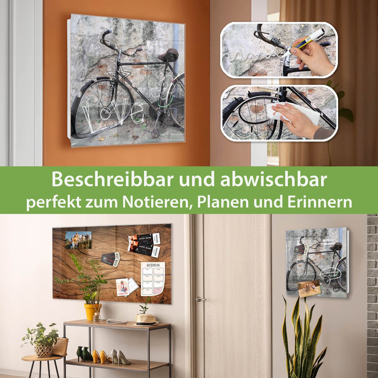 Bringe Ordnung und Eleganz in deinen Eingangsbereich mit dem banjado Schlüsselkasten Motiv Motiv Nostalgie Rad. Die moderne Schlüsselbox kombiniert funktionales Design mit hochwertiger Verarbeitung und wird so zu einem echten Hingucker in Flur, Büro oder Ferienwohnung. ✅ Stilvolle Schlüsselaufbewahrung mit Glasfront im Motiv Motiv Nostalgie Rad Der Design-Schlüsselkasten Motiv Motiv Nostalgie Rad bietet Platz für bis zu 50 Schlüssel, die auf 5 stabilen Reihen mit je 10 Haken übersichtlich verstaut werden. Mit seinen kompakten Maßen von 30 x 30 x 5 cm passt die Schlüsselbox perfekt auch in kleinere Räume. Der weiß lackierte Stahlkorpus mit rechts angeschlagenem Türscharnier harmoniert mit der Glasfront und fügt sich nahtlos in jedes Wohnambiente ein. Ob als Schlüsselorganizer für Zuhause oder als praktische Lösung für Büros, Praxen und Gewerbe, der banjado Schlüsselkasten sorgt für Ordnung und Übersicht. Dank der magnetischen, mit Kreidestiften beschreibbaren Glasfront kannst du Notizen anheften oder Termine direkt auf der Oberfläche festhalten. Die Schlüsselbox Motiv Motiv Nostalgie Rad zur Wandmontage wird inklusive Befestigungsmaterial geliefert und ist schnell angebracht. So hast du deine Schlüssel jederzeit griffbereit und zugleich stilvoll verstaut. Mit diesem banjado Schlüsselkasten Motiv Motiv Nostalgie Rad kombinierst du praktische Aufbewahrung mit stilvollem Wohndesign. Ob privat oder geschäftlich, die Schlüsselbox sorgt für mehr Ordnung, Übersicht und ein wohnliches Ambiente.Vorteile im Überblick