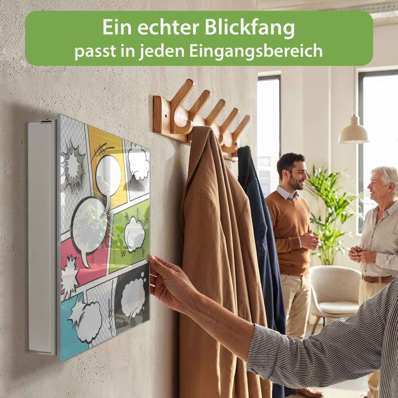 Bringe Ordnung und Eleganz in deinen Eingangsbereich mit dem banjado Schlüsselkasten Motiv Motiv Ohne Worte. Die moderne Schlüsselbox kombiniert funktionales Design mit hochwertiger Verarbeitung und wird so zu einem echten Hingucker in Flur, Büro oder Ferienwohnung. ✅ Stilvolle Schlüsselaufbewahrung mit Glasfront im Motiv Motiv Ohne Worte Der Design-Schlüsselkasten Motiv Motiv Ohne Worte bietet Platz für bis zu 50 Schlüssel, die auf 5 stabilen Reihen mit je 10 Haken übersichtlich verstaut werden. Mit seinen kompakten Maßen von 30 x 30 x 5 cm passt die Schlüsselbox perfekt auch in kleinere Räume. Der weiß lackierte Stahlkorpus mit rechts angeschlagenem Türscharnier harmoniert mit der Glasfront und fügt sich nahtlos in jedes Wohnambiente ein. Ob als Schlüsselorganizer für Zuhause oder als praktische Lösung für Büros, Praxen und Gewerbe, der banjado Schlüsselkasten sorgt für Ordnung und Übersicht. Dank der magnetischen, mit Kreidestiften beschreibbaren Glasfront kannst du Notizen anheften oder Termine direkt auf der Oberfläche festhalten. Die Schlüsselbox Motiv Motiv Ohne Worte zur Wandmontage wird inklusive Befestigungsmaterial geliefert und ist schnell angebracht. So hast du deine Schlüssel jederzeit griffbereit und zugleich stilvoll verstaut. Mit diesem banjado Schlüsselkasten Motiv Motiv Ohne Worte kombinierst du praktische Aufbewahrung mit stilvollem Wohndesign. Ob privat oder geschäftlich, die Schlüsselbox sorgt für mehr Ordnung, Übersicht und ein wohnliches Ambiente.Vorteile im Überblick