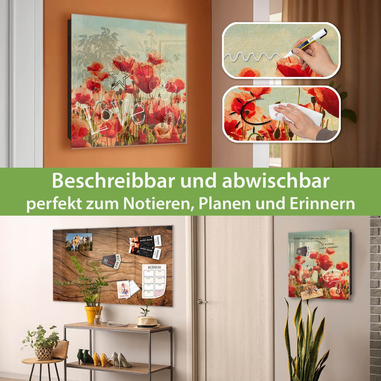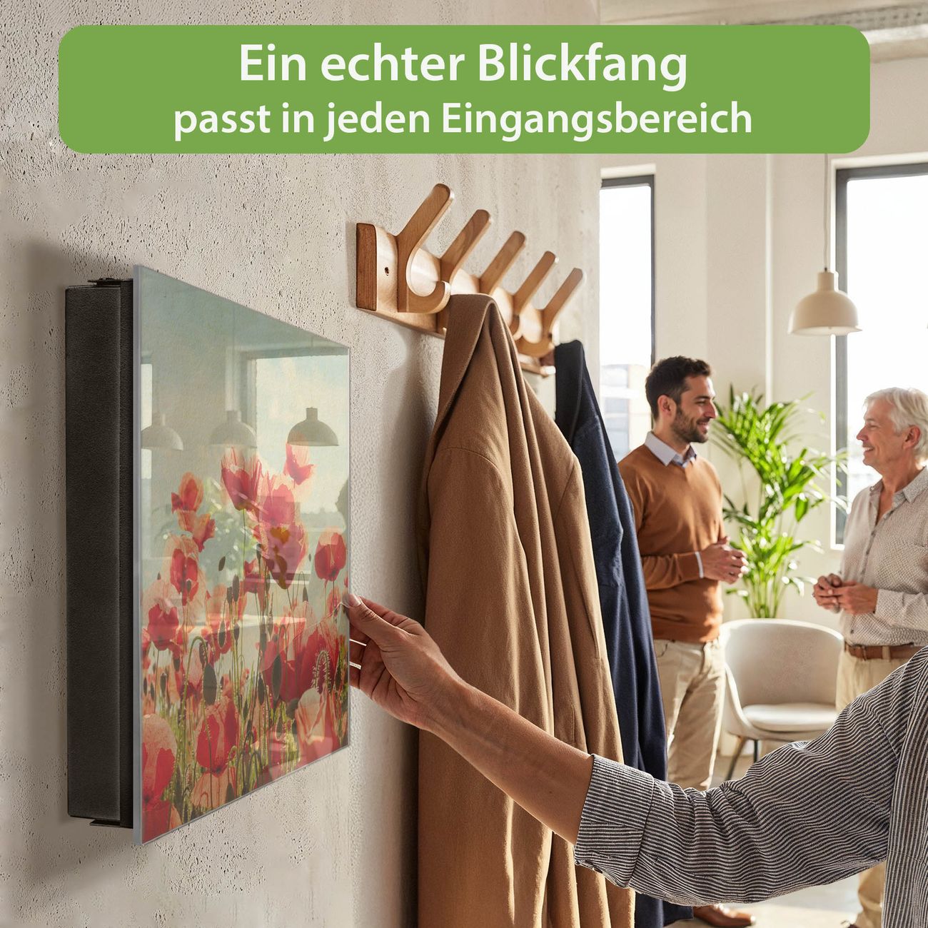 Bringe Ordnung und Eleganz in deinen Eingangsbereich mit dem banjado Schlüsselkasten Motiv Motiv Oktobermohn. Die moderne Schlüsselbox kombiniert funktionales Design mit hochwertiger Verarbeitung und wird so zu einem echten Hingucker in Flur, Büro oder Ferienwohnung. ✅ Stilvolle Schlüsselaufbewahrung mit Glasfront im Motiv Motiv Oktobermohn Der Design-Schlüsselkasten Motiv Motiv Oktobermohn bietet Platz für bis zu 50 Schlüssel, die auf 5 stabilen Reihen mit je 10 Haken übersichtlich verstaut werden. Mit seinen kompakten Maßen von 30 x 30 x 5 cm passt die Schlüsselbox perfekt auch in kleinere Räume. Der schwarz lackierte Stahlkorpus mit rechts angeschlagenem Türscharnier harmoniert mit der Glasfront und fügt sich nahtlos in jedes Wohnambiente ein. Ob als Schlüsselorganizer für Zuhause oder als praktische Lösung für Büros, Praxen und Gewerbe, der banjado Schlüsselkasten sorgt für Ordnung und Übersicht. Dank der magnetischen, mit Kreidestiften beschreibbaren Glasfront kannst du Notizen anheften oder Termine direkt auf der Oberfläche festhalten. Die Schlüsselbox Motiv Motiv Oktobermohn zur Wandmontage wird inklusive Befestigungsmaterial geliefert und ist schnell angebracht. So hast du deine Schlüssel jederzeit griffbereit und zugleich stilvoll verstaut. Mit diesem banjado Schlüsselkasten Motiv Motiv Oktobermohn kombinierst du praktische Aufbewahrung mit stilvollem Wohndesign. Ob privat oder geschäftlich, die Schlüsselbox sorgt für mehr Ordnung, Übersicht und ein wohnliches Ambiente.Vorteile im Überblick