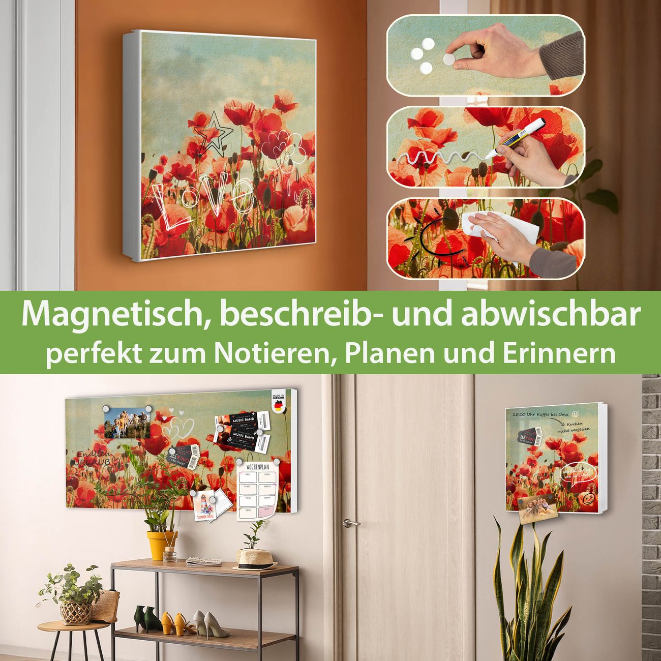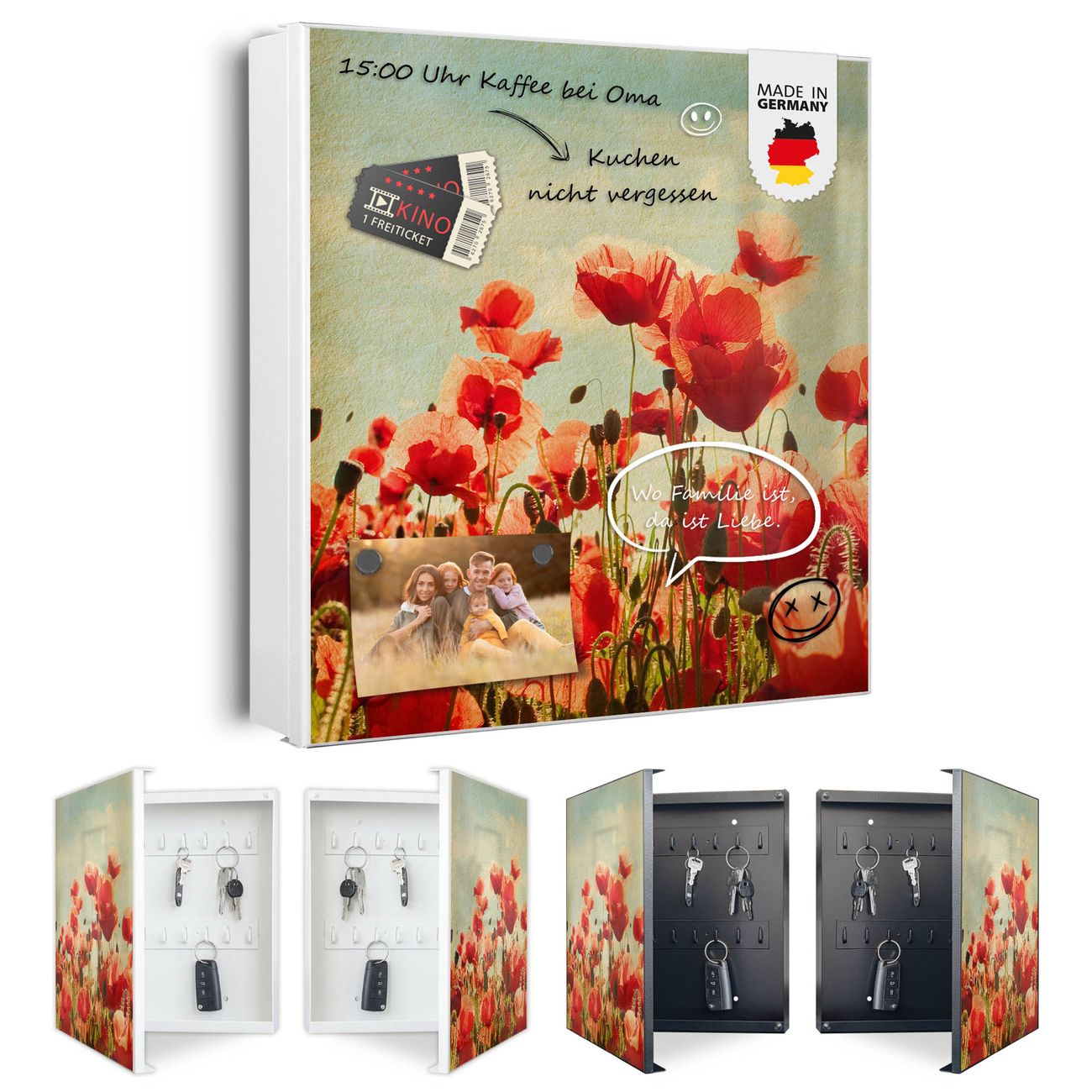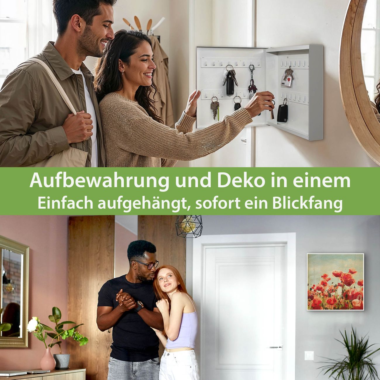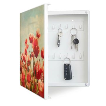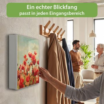 Bringe Ordnung und Eleganz in deinen Eingangsbereich mit dem banjado Schlüsselkasten Motiv Motiv Oktobermohn. Die moderne Schlüsselbox kombiniert funktionales Design mit hochwertiger Verarbeitung und wird so zu einem echten Hingucker in Flur, Büro oder Ferienwohnung. ✅ Stilvolle Schlüsselaufbewahrung mit Motiv Motiv Oktobermohn Der Design-Schlüsselkasten Motiv Motiv Oktobermohn bietet Platz für bis zu 32 Schlüssel, die auf 4 stabilen Reihen mit je 8 Haken übersichtlich verstaut werden. Mit seinen kompakten Maßen von 30 x 30 x 5 cm passt die Schlüsselbox perfekt auch in kleinere Räume. Der weiß lackierte Stahlkorpus mit links angeschlagenem Türscharnier harmoniert mit gedruckten Folie auf der Front und fügt sich nahtlos in jedes Wohnambiente ein. Ob als Schlüsselorganizer für Zuhause oder als praktische Lösung für Büros, Praxen und Gewerbe, der banjado Schlüsselkasten sorgt für Ordnung und Übersicht. Dank der magnetischen, mit Kreidestiften beschreibbaren Folie auf der Front kannst du Notizen anheften oder Termine direkt auf der Oberfläche festhalten. Die Schlüsselbox Motiv Motiv Oktobermohn zur Wandmontage wird inklusive Befestigungsmaterial geliefert und ist schnell angebracht. So hast du deine Schlüssel jederzeit griffbereit und zugleich stilvoll verstaut. Mit diesem banjado Schlüsselkasten Motiv Motiv Oktobermohn kombinierst du praktische Aufbewahrung mit stilvollem Wohndesign. Ob privat oder geschäftlich, die Schlüsselbox sorgt für mehr Ordnung, Übersicht und ein wohnliches Ambiente.Vorteile im Überblick