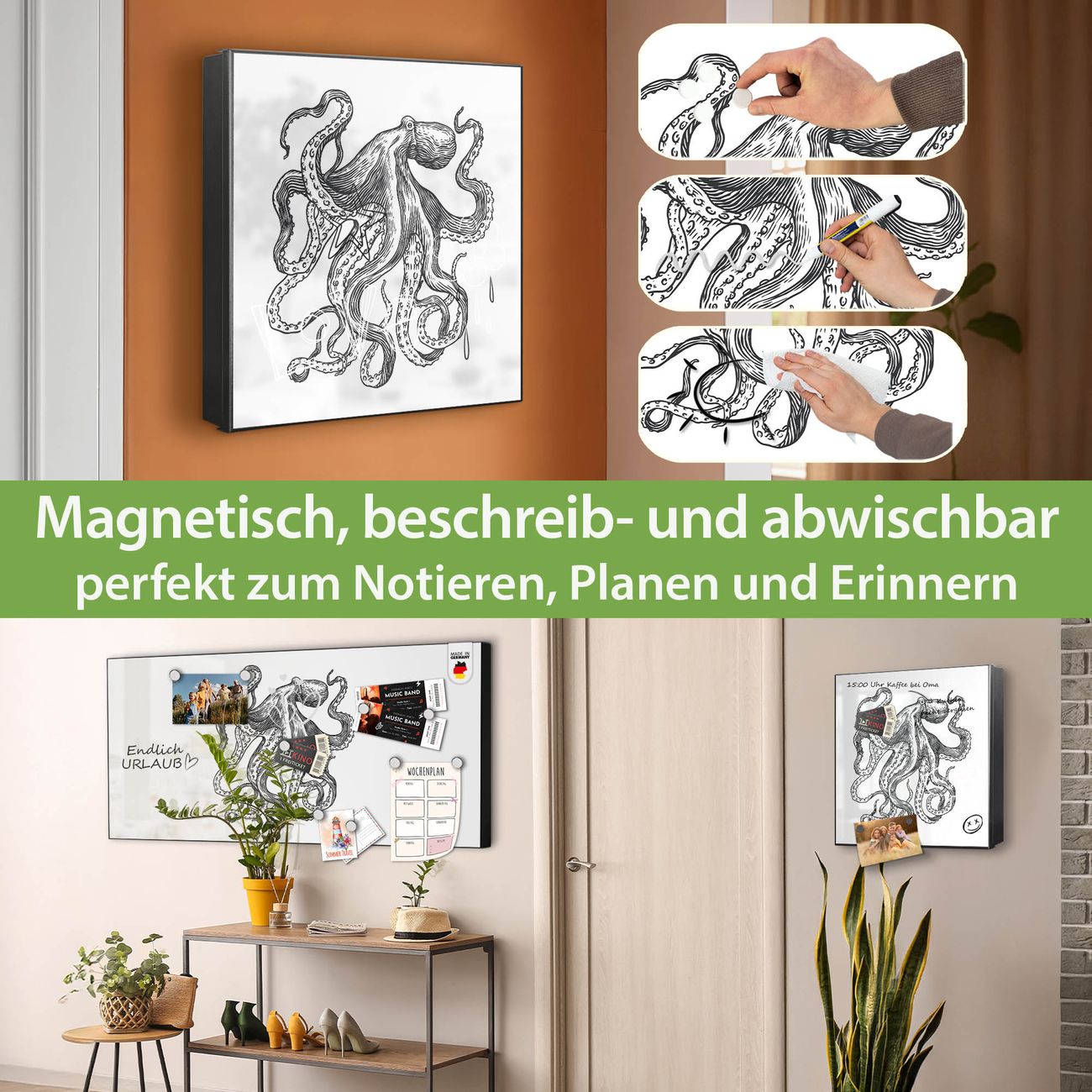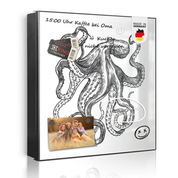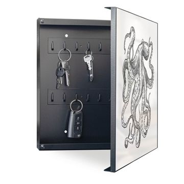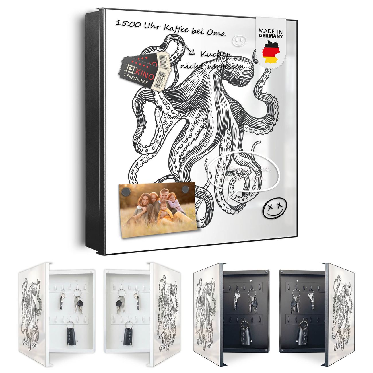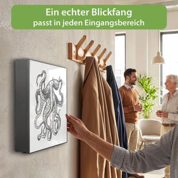 Bringe Ordnung und Eleganz in deinen Eingangsbereich mit dem banjado Schlüsselkasten Motiv Motiv Oktopus 10. Die moderne Schlüsselbox kombiniert funktionales Design mit hochwertiger Verarbeitung und wird so zu einem echten Hingucker in Flur, Büro oder Ferienwohnung. ✅ Stilvolle Schlüsselaufbewahrung mit Motiv Motiv Oktopus 10 Der Design-Schlüsselkasten Motiv Motiv Oktopus 10 bietet Platz für bis zu 32 Schlüssel, die auf 4 stabilen Reihen mit je 8 Haken übersichtlich verstaut werden. Mit seinen kompakten Maßen von 30 x 30 x 5 cm passt die Schlüsselbox perfekt auch in kleinere Räume. Der schwarz lackierte Stahlkorpus mit rechts angeschlagenem Türscharnier harmoniert mit gedruckten Folie auf der Front und fügt sich nahtlos in jedes Wohnambiente ein. Ob als Schlüsselorganizer für Zuhause oder als praktische Lösung für Büros, Praxen und Gewerbe, der banjado Schlüsselkasten sorgt für Ordnung und Übersicht. Dank der magnetischen, mit Kreidestiften beschreibbaren Folie auf der Front kannst du Notizen anheften oder Termine direkt auf der Oberfläche festhalten. Die Schlüsselbox Motiv Motiv Oktopus 10 zur Wandmontage wird inklusive Befestigungsmaterial geliefert und ist schnell angebracht. So hast du deine Schlüssel jederzeit griffbereit und zugleich stilvoll verstaut. Mit diesem banjado Schlüsselkasten Motiv Motiv Oktopus 10 kombinierst du praktische Aufbewahrung mit stilvollem Wohndesign. Ob privat oder geschäftlich, die Schlüsselbox sorgt für mehr Ordnung, Übersicht und ein wohnliches Ambiente.Vorteile im Überblick