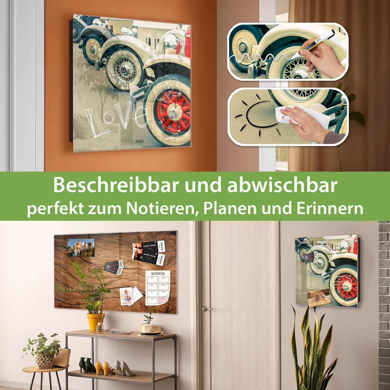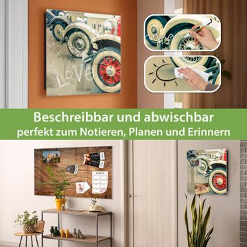 Bringe Ordnung und Eleganz in deinen Eingangsbereich mit dem banjado Schlüsselkasten Motiv Motiv Oldtimer Räder. Die moderne Schlüsselbox kombiniert funktionales Design mit hochwertiger Verarbeitung und wird so zu einem echten Hingucker in Flur, Büro oder Ferienwohnung. ✅ Stilvolle Schlüsselaufbewahrung mit Glasfront im Motiv Motiv Oldtimer Räder Der Design-Schlüsselkasten Motiv Motiv Oldtimer Räder bietet Platz für bis zu 50 Schlüssel, die auf 5 stabilen Reihen mit je 10 Haken übersichtlich verstaut werden. Mit seinen kompakten Maßen von 30 x 30 x 5 cm passt die Schlüsselbox perfekt auch in kleinere Räume. Der schwarz lackierte Stahlkorpus mit rechts angeschlagenem Türscharnier harmoniert mit der Glasfront und fügt sich nahtlos in jedes Wohnambiente ein. Ob als Schlüsselorganizer für Zuhause oder als praktische Lösung für Büros, Praxen und Gewerbe, der banjado Schlüsselkasten sorgt für Ordnung und Übersicht. Dank der magnetischen, mit Kreidestiften beschreibbaren Glasfront kannst du Notizen anheften oder Termine direkt auf der Oberfläche festhalten. Die Schlüsselbox Motiv Motiv Oldtimer Räder zur Wandmontage wird inklusive Befestigungsmaterial geliefert und ist schnell angebracht. So hast du deine Schlüssel jederzeit griffbereit und zugleich stilvoll verstaut. Mit diesem banjado Schlüsselkasten Motiv Motiv Oldtimer Räder kombinierst du praktische Aufbewahrung mit stilvollem Wohndesign. Ob privat oder geschäftlich, die Schlüsselbox sorgt für mehr Ordnung, Übersicht und ein wohnliches Ambiente.Vorteile im Überblick