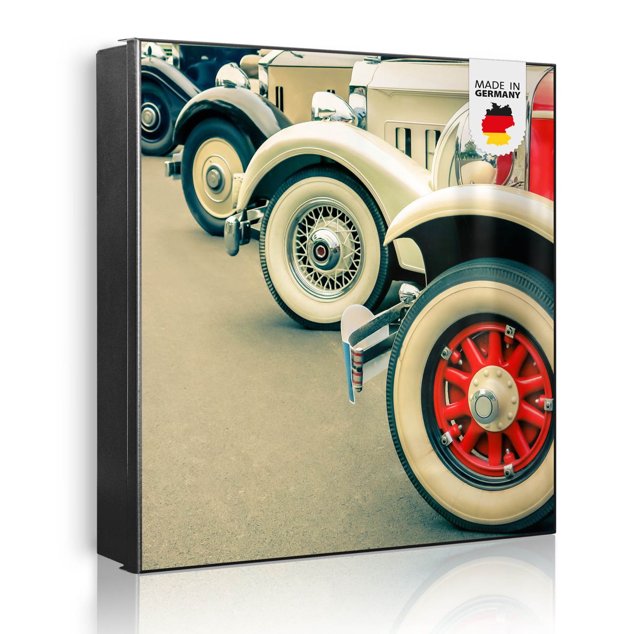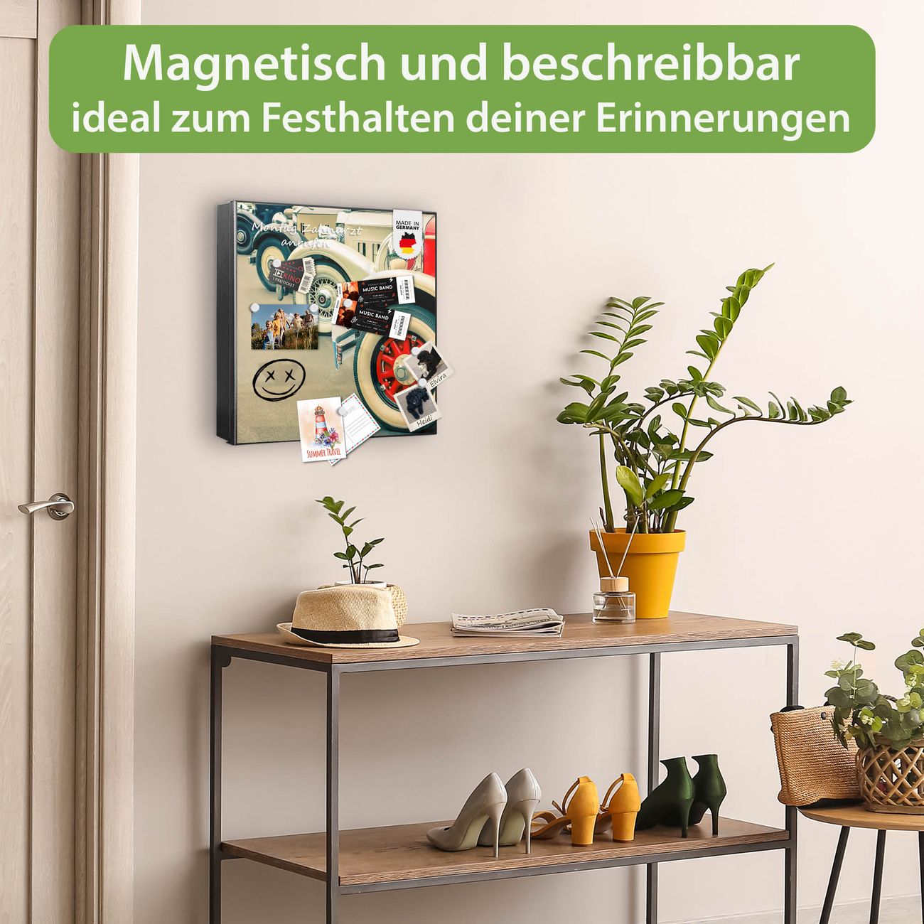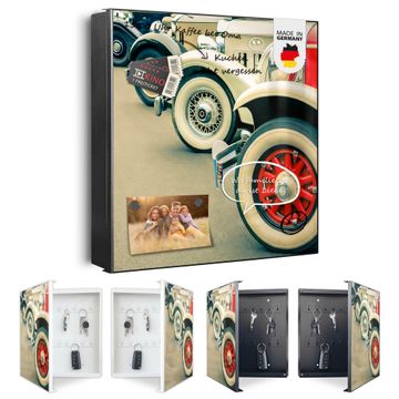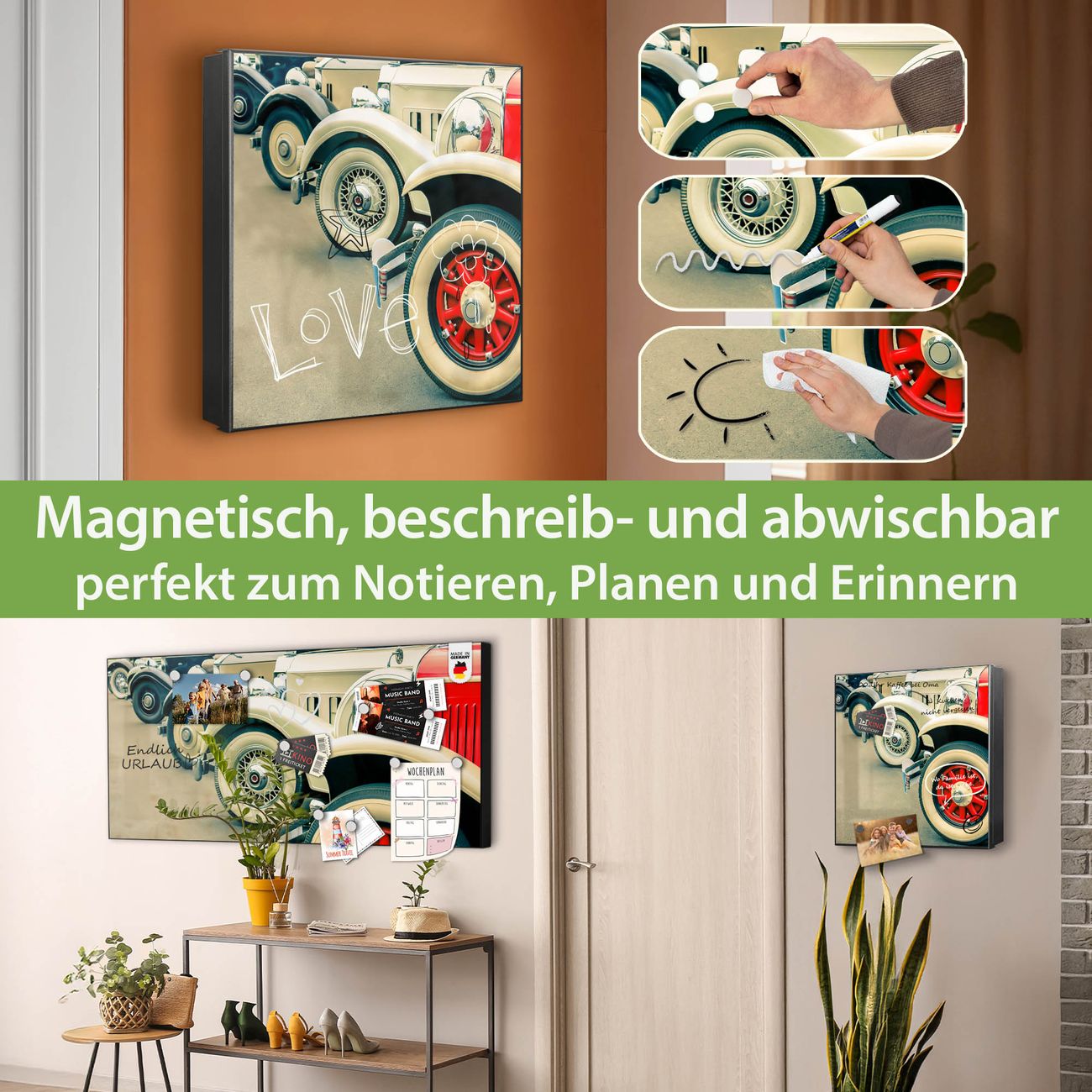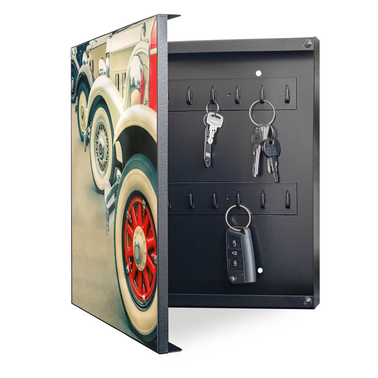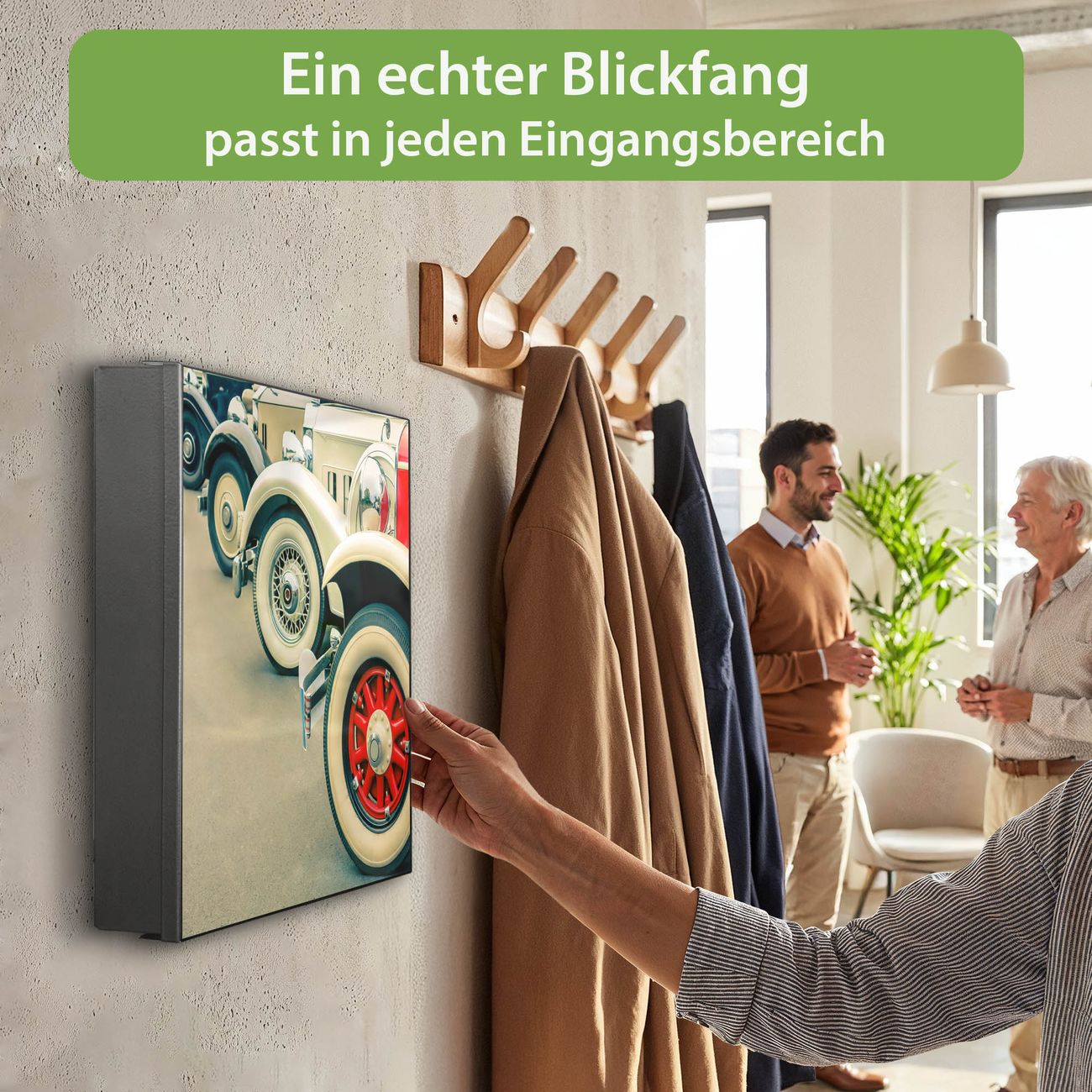 Bringe Ordnung und Eleganz in deinen Eingangsbereich mit dem banjado Schlüsselkasten Motiv Motiv Oldtimer Räder. Die moderne Schlüsselbox kombiniert funktionales Design mit hochwertiger Verarbeitung und wird so zu einem echten Hingucker in Flur, Büro oder Ferienwohnung. ✅ Stilvolle Schlüsselaufbewahrung mit Motiv Motiv Oldtimer Räder Der Design-Schlüsselkasten Motiv Motiv Oldtimer Räder bietet Platz für bis zu 32 Schlüssel, die auf 4 stabilen Reihen mit je 8 Haken übersichtlich verstaut werden. Mit seinen kompakten Maßen von 30 x 30 x 5 cm passt die Schlüsselbox perfekt auch in kleinere Räume. Der schwarz lackierte Stahlkorpus mit links angeschlagenem Türscharnier harmoniert mit gedruckten Folie auf der Front und fügt sich nahtlos in jedes Wohnambiente ein. Ob als Schlüsselorganizer für Zuhause oder als praktische Lösung für Büros, Praxen und Gewerbe, der banjado Schlüsselkasten sorgt für Ordnung und Übersicht. Dank der magnetischen, mit Kreidestiften beschreibbaren Folie auf der Front kannst du Notizen anheften oder Termine direkt auf der Oberfläche festhalten. Die Schlüsselbox Motiv Motiv Oldtimer Räder zur Wandmontage wird inklusive Befestigungsmaterial geliefert und ist schnell angebracht. So hast du deine Schlüssel jederzeit griffbereit und zugleich stilvoll verstaut. Mit diesem banjado Schlüsselkasten Motiv Motiv Oldtimer Räder kombinierst du praktische Aufbewahrung mit stilvollem Wohndesign. Ob privat oder geschäftlich, die Schlüsselbox sorgt für mehr Ordnung, Übersicht und ein wohnliches Ambiente.Vorteile im Überblick