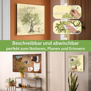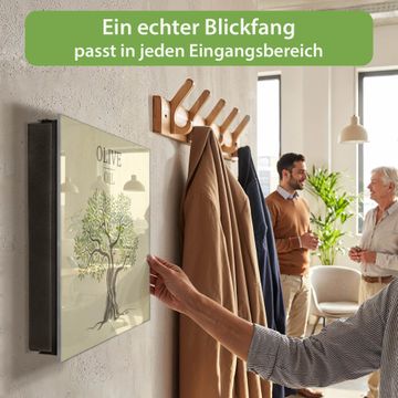 Bringe Ordnung und Eleganz in deinen Eingangsbereich mit dem banjado Schlüsselkasten Motiv Motiv Olivenbaum. Die moderne Schlüsselbox kombiniert funktionales Design mit hochwertiger Verarbeitung und wird so zu einem echten Hingucker in Flur, Büro oder Ferienwohnung. ✅ Stilvolle Schlüsselaufbewahrung mit Glasfront im Motiv Motiv Olivenbaum Der Design-Schlüsselkasten Motiv Motiv Olivenbaum bietet Platz für bis zu 50 Schlüssel, die auf 5 stabilen Reihen mit je 10 Haken übersichtlich verstaut werden. Mit seinen kompakten Maßen von 30 x 30 x 5 cm passt die Schlüsselbox perfekt auch in kleinere Räume. Der schwarz lackierte Stahlkorpus mit rechts angeschlagenem Türscharnier harmoniert mit der Glasfront und fügt sich nahtlos in jedes Wohnambiente ein. Ob als Schlüsselorganizer für Zuhause oder als praktische Lösung für Büros, Praxen und Gewerbe, der banjado Schlüsselkasten sorgt für Ordnung und Übersicht. Dank der magnetischen, mit Kreidestiften beschreibbaren Glasfront kannst du Notizen anheften oder Termine direkt auf der Oberfläche festhalten. Die Schlüsselbox Motiv Motiv Olivenbaum zur Wandmontage wird inklusive Befestigungsmaterial geliefert und ist schnell angebracht. So hast du deine Schlüssel jederzeit griffbereit und zugleich stilvoll verstaut. Mit diesem banjado Schlüsselkasten Motiv Motiv Olivenbaum kombinierst du praktische Aufbewahrung mit stilvollem Wohndesign. Ob privat oder geschäftlich, die Schlüsselbox sorgt für mehr Ordnung, Übersicht und ein wohnliches Ambiente.Vorteile im Überblick