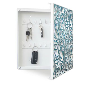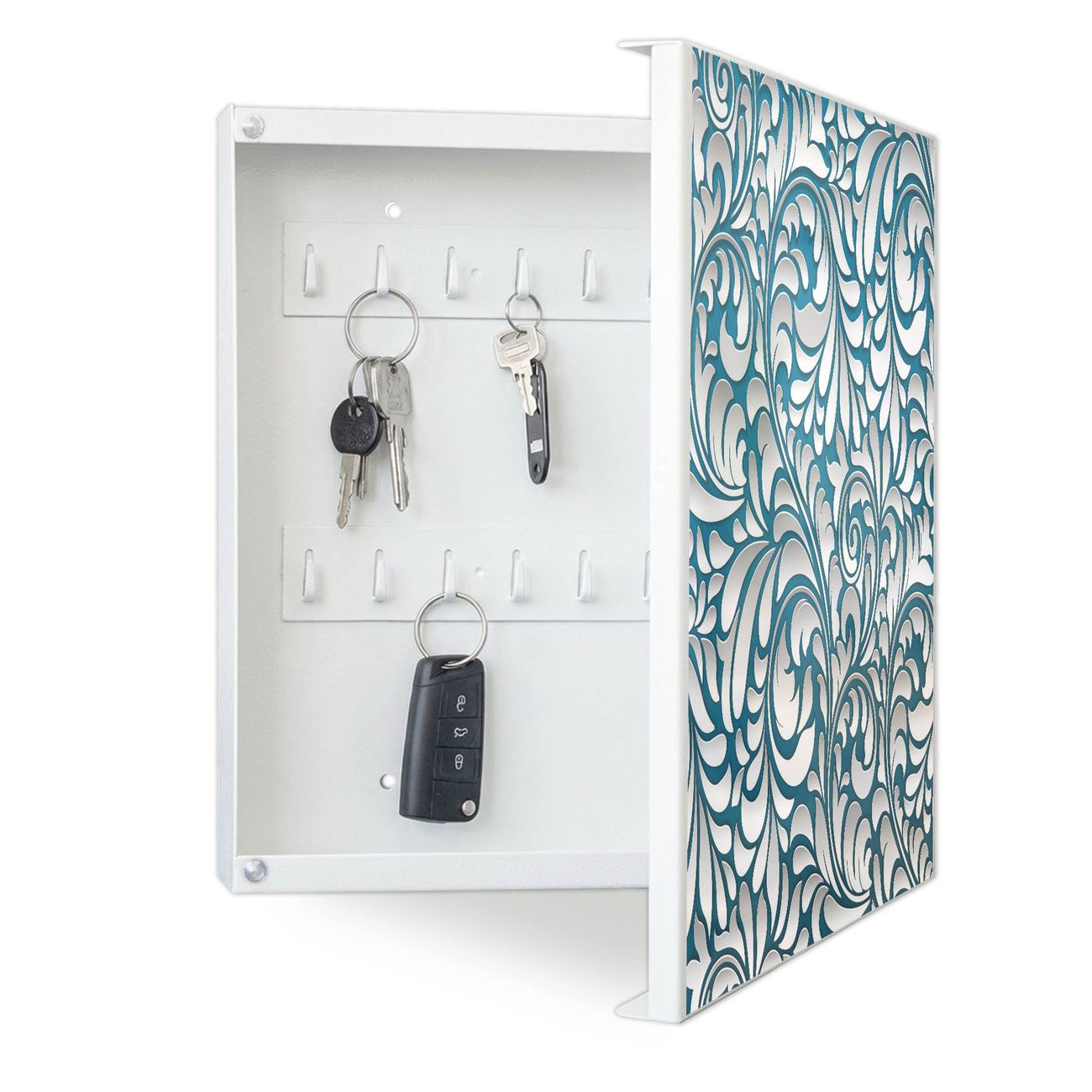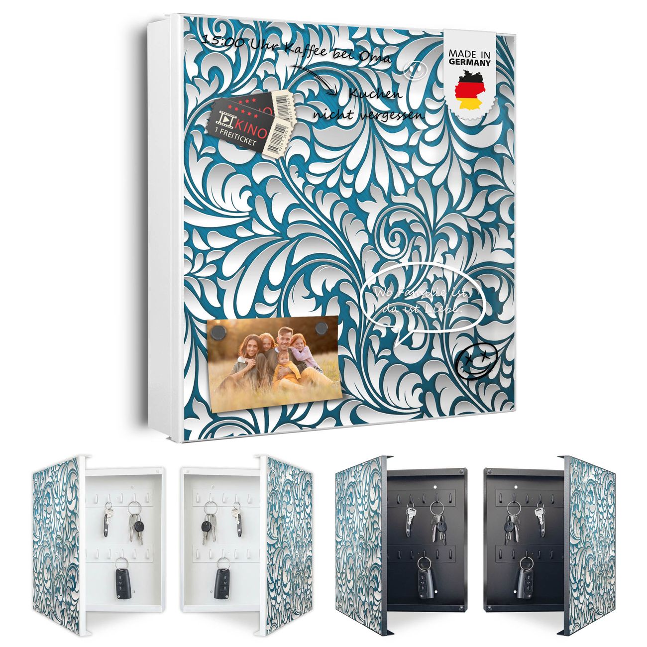 Bringe Ordnung und Eleganz in deinen Eingangsbereich mit dem banjado Schlüsselkasten Motiv Motiv Opulente Ranke. Die moderne Schlüsselbox kombiniert funktionales Design mit hochwertiger Verarbeitung und wird so zu einem echten Hingucker in Flur, Büro oder Ferienwohnung. ✅ Stilvolle Schlüsselaufbewahrung mit Motiv Motiv Opulente Ranke Der Design-Schlüsselkasten Motiv Motiv Opulente Ranke bietet Platz für bis zu 32 Schlüssel, die auf 4 stabilen Reihen mit je 8 Haken übersichtlich verstaut werden. Mit seinen kompakten Maßen von 30 x 30 x 5 cm passt die Schlüsselbox perfekt auch in kleinere Räume. Der weiß lackierte Stahlkorpus mit rechts angeschlagenem Türscharnier harmoniert mit gedruckten Folie auf der Front und fügt sich nahtlos in jedes Wohnambiente ein. Ob als Schlüsselorganizer für Zuhause oder als praktische Lösung für Büros, Praxen und Gewerbe, der banjado Schlüsselkasten sorgt für Ordnung und Übersicht. Dank der magnetischen, mit Kreidestiften beschreibbaren Folie auf der Front kannst du Notizen anheften oder Termine direkt auf der Oberfläche festhalten. Die Schlüsselbox Motiv Motiv Opulente Ranke zur Wandmontage wird inklusive Befestigungsmaterial geliefert und ist schnell angebracht. So hast du deine Schlüssel jederzeit griffbereit und zugleich stilvoll verstaut. Mit diesem banjado Schlüsselkasten Motiv Motiv Opulente Ranke kombinierst du praktische Aufbewahrung mit stilvollem Wohndesign. Ob privat oder geschäftlich, die Schlüsselbox sorgt für mehr Ordnung, Übersicht und ein wohnliches Ambiente.Vorteile im Überblick