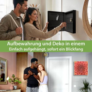 Bringe Ordnung und Eleganz in deinen Eingangsbereich mit dem banjado Schlüsselkasten Motiv Motiv Orange Chrysantheme. Die moderne Schlüsselbox kombiniert funktionales Design mit hochwertiger Verarbeitung und wird so zu einem echten Hingucker in Flur, Büro oder Ferienwohnung. ✅ Stilvolle Schlüsselaufbewahrung mit Glasfront im Motiv Motiv Orange Chrysantheme Der Design-Schlüsselkasten Motiv Motiv Orange Chrysantheme bietet Platz für bis zu 50 Schlüssel, die auf 5 stabilen Reihen mit je 10 Haken übersichtlich verstaut werden. Mit seinen kompakten Maßen von 30 x 30 x 5 cm passt die Schlüsselbox perfekt auch in kleinere Räume. Der schwarz lackierte Stahlkorpus mit rechts angeschlagenem Türscharnier harmoniert mit der Glasfront und fügt sich nahtlos in jedes Wohnambiente ein. Ob als Schlüsselorganizer für Zuhause oder als praktische Lösung für Büros, Praxen und Gewerbe, der banjado Schlüsselkasten sorgt für Ordnung und Übersicht. Dank der magnetischen, mit Kreidestiften beschreibbaren Glasfront kannst du Notizen anheften oder Termine direkt auf der Oberfläche festhalten. Die Schlüsselbox Motiv Motiv Orange Chrysantheme zur Wandmontage wird inklusive Befestigungsmaterial geliefert und ist schnell angebracht. So hast du deine Schlüssel jederzeit griffbereit und zugleich stilvoll verstaut. Mit diesem banjado Schlüsselkasten Motiv Motiv Orange Chrysantheme kombinierst du praktische Aufbewahrung mit stilvollem Wohndesign. Ob privat oder geschäftlich, die Schlüsselbox sorgt für mehr Ordnung, Übersicht und ein wohnliches Ambiente.Vorteile im Überblick