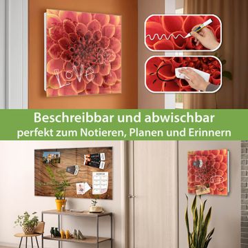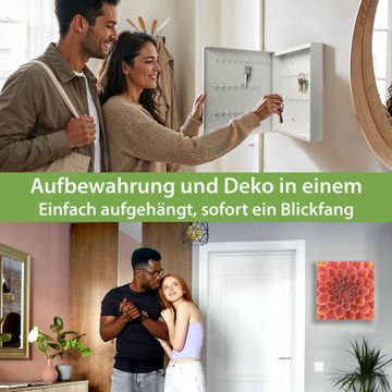 Bringe Ordnung und Eleganz in deinen Eingangsbereich mit dem banjado Schlüsselkasten Motiv Motiv Orange Chrysantheme. Die moderne Schlüsselbox kombiniert funktionales Design mit hochwertiger Verarbeitung und wird so zu einem echten Hingucker in Flur, Büro oder Ferienwohnung. ✅ Stilvolle Schlüsselaufbewahrung mit Glasfront im Motiv Motiv Orange Chrysantheme Der Design-Schlüsselkasten Motiv Motiv Orange Chrysantheme bietet Platz für bis zu 50 Schlüssel, die auf 5 stabilen Reihen mit je 10 Haken übersichtlich verstaut werden. Mit seinen kompakten Maßen von 30 x 30 x 5 cm passt die Schlüsselbox perfekt auch in kleinere Räume. Der weiß lackierte Stahlkorpus mit rechts angeschlagenem Türscharnier harmoniert mit der Glasfront und fügt sich nahtlos in jedes Wohnambiente ein. Ob als Schlüsselorganizer für Zuhause oder als praktische Lösung für Büros, Praxen und Gewerbe, der banjado Schlüsselkasten sorgt für Ordnung und Übersicht. Dank der magnetischen, mit Kreidestiften beschreibbaren Glasfront kannst du Notizen anheften oder Termine direkt auf der Oberfläche festhalten. Die Schlüsselbox Motiv Motiv Orange Chrysantheme zur Wandmontage wird inklusive Befestigungsmaterial geliefert und ist schnell angebracht. So hast du deine Schlüssel jederzeit griffbereit und zugleich stilvoll verstaut. Mit diesem banjado Schlüsselkasten Motiv Motiv Orange Chrysantheme kombinierst du praktische Aufbewahrung mit stilvollem Wohndesign. Ob privat oder geschäftlich, die Schlüsselbox sorgt für mehr Ordnung, Übersicht und ein wohnliches Ambiente.Vorteile im Überblick