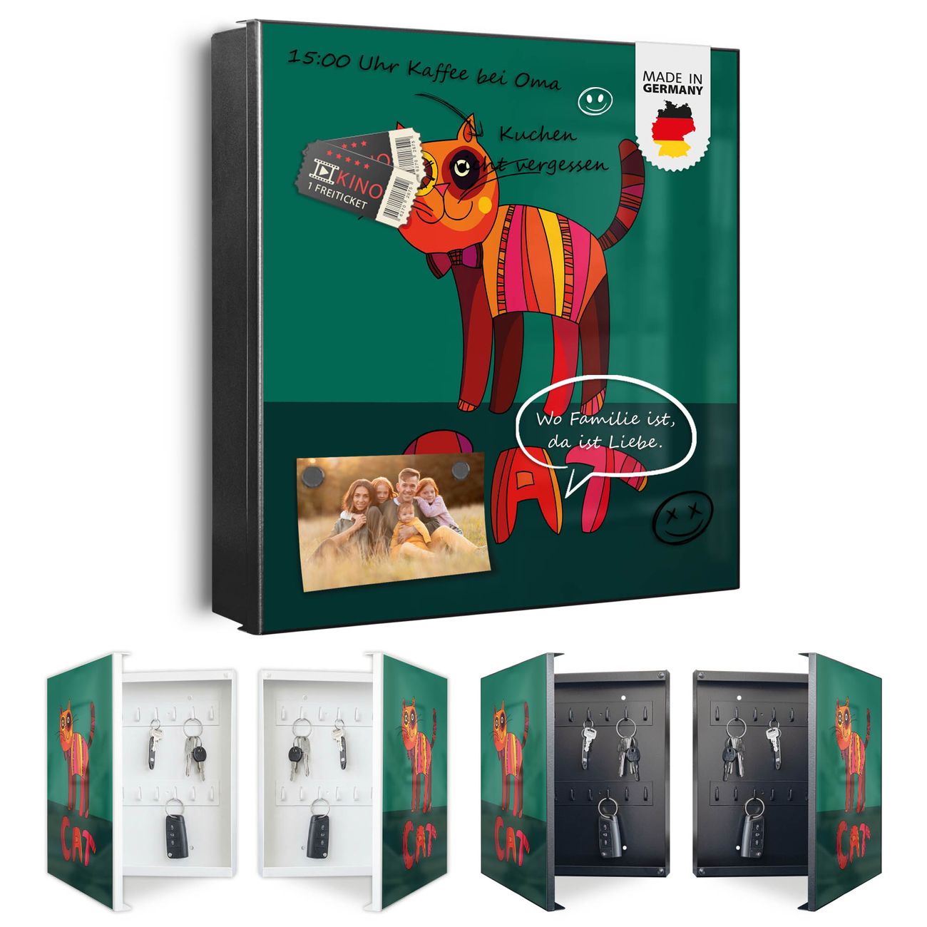 Bringe Ordnung und Eleganz in deinen Eingangsbereich mit dem banjado Schlüsselkasten Motiv Motiv Orange Katze. Die moderne Schlüsselbox kombiniert funktionales Design mit hochwertiger Verarbeitung und wird so zu einem echten Hingucker in Flur, Büro oder Ferienwohnung. ✅ Stilvolle Schlüsselaufbewahrung mit Motiv Motiv Orange Katze Der Design-Schlüsselkasten Motiv Motiv Orange Katze bietet Platz für bis zu 32 Schlüssel, die auf 4 stabilen Reihen mit je 8 Haken übersichtlich verstaut werden. Mit seinen kompakten Maßen von 30 x 30 x 5 cm passt die Schlüsselbox perfekt auch in kleinere Räume. Der schwarz lackierte Stahlkorpus mit links angeschlagenem Türscharnier harmoniert mit gedruckten Folie auf der Front und fügt sich nahtlos in jedes Wohnambiente ein. Ob als Schlüsselorganizer für Zuhause oder als praktische Lösung für Büros, Praxen und Gewerbe, der banjado Schlüsselkasten sorgt für Ordnung und Übersicht. Dank der magnetischen, mit Kreidestiften beschreibbaren Folie auf der Front kannst du Notizen anheften oder Termine direkt auf der Oberfläche festhalten. Die Schlüsselbox Motiv Motiv Orange Katze zur Wandmontage wird inklusive Befestigungsmaterial geliefert und ist schnell angebracht. So hast du deine Schlüssel jederzeit griffbereit und zugleich stilvoll verstaut. Mit diesem banjado Schlüsselkasten Motiv Motiv Orange Katze kombinierst du praktische Aufbewahrung mit stilvollem Wohndesign. Ob privat oder geschäftlich, die Schlüsselbox sorgt für mehr Ordnung, Übersicht und ein wohnliches Ambiente.Vorteile im Überblick