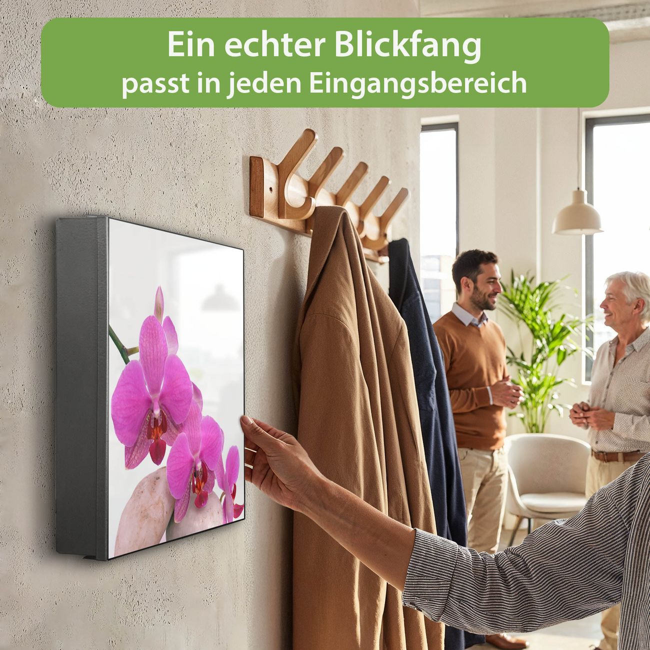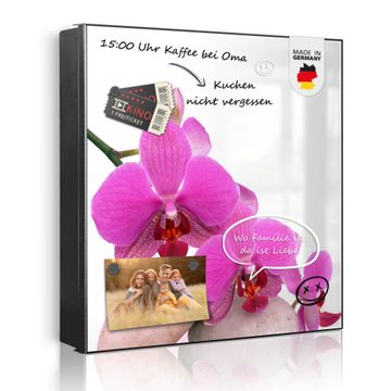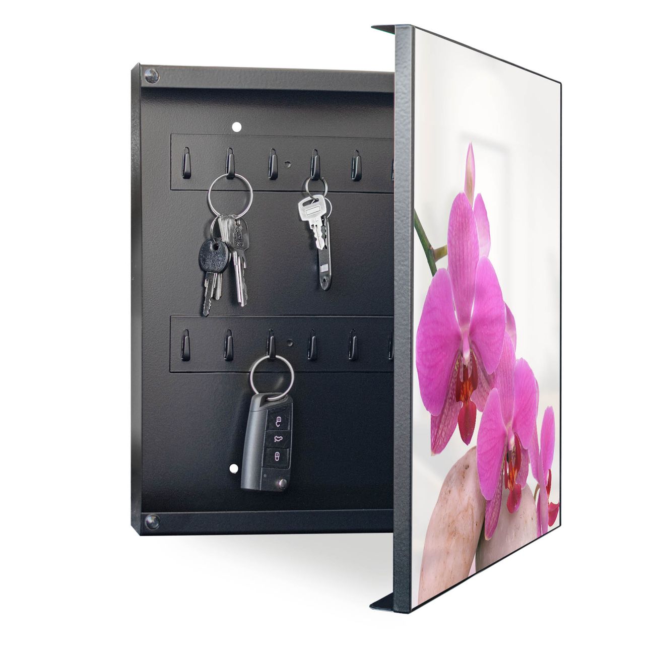 Bringe Ordnung und Eleganz in deinen Eingangsbereich mit dem banjado Schlüsselkasten Motiv Motiv Orchidee. Die moderne Schlüsselbox kombiniert funktionales Design mit hochwertiger Verarbeitung und wird so zu einem echten Hingucker in Flur, Büro oder Ferienwohnung. ✅ Stilvolle Schlüsselaufbewahrung mit Motiv Motiv Orchidee Der Design-Schlüsselkasten Motiv Motiv Orchidee bietet Platz für bis zu 32 Schlüssel, die auf 4 stabilen Reihen mit je 8 Haken übersichtlich verstaut werden. Mit seinen kompakten Maßen von 30 x 30 x 5 cm passt die Schlüsselbox perfekt auch in kleinere Räume. Der schwarz lackierte Stahlkorpus mit rechts angeschlagenem Türscharnier harmoniert mit gedruckten Folie auf der Front und fügt sich nahtlos in jedes Wohnambiente ein. Ob als Schlüsselorganizer für Zuhause oder als praktische Lösung für Büros, Praxen und Gewerbe, der banjado Schlüsselkasten sorgt für Ordnung und Übersicht. Dank der magnetischen, mit Kreidestiften beschreibbaren Folie auf der Front kannst du Notizen anheften oder Termine direkt auf der Oberfläche festhalten. Die Schlüsselbox Motiv Motiv Orchidee zur Wandmontage wird inklusive Befestigungsmaterial geliefert und ist schnell angebracht. So hast du deine Schlüssel jederzeit griffbereit und zugleich stilvoll verstaut. Mit diesem banjado Schlüsselkasten Motiv Motiv Orchidee kombinierst du praktische Aufbewahrung mit stilvollem Wohndesign. Ob privat oder geschäftlich, die Schlüsselbox sorgt für mehr Ordnung, Übersicht und ein wohnliches Ambiente.Vorteile im Überblick