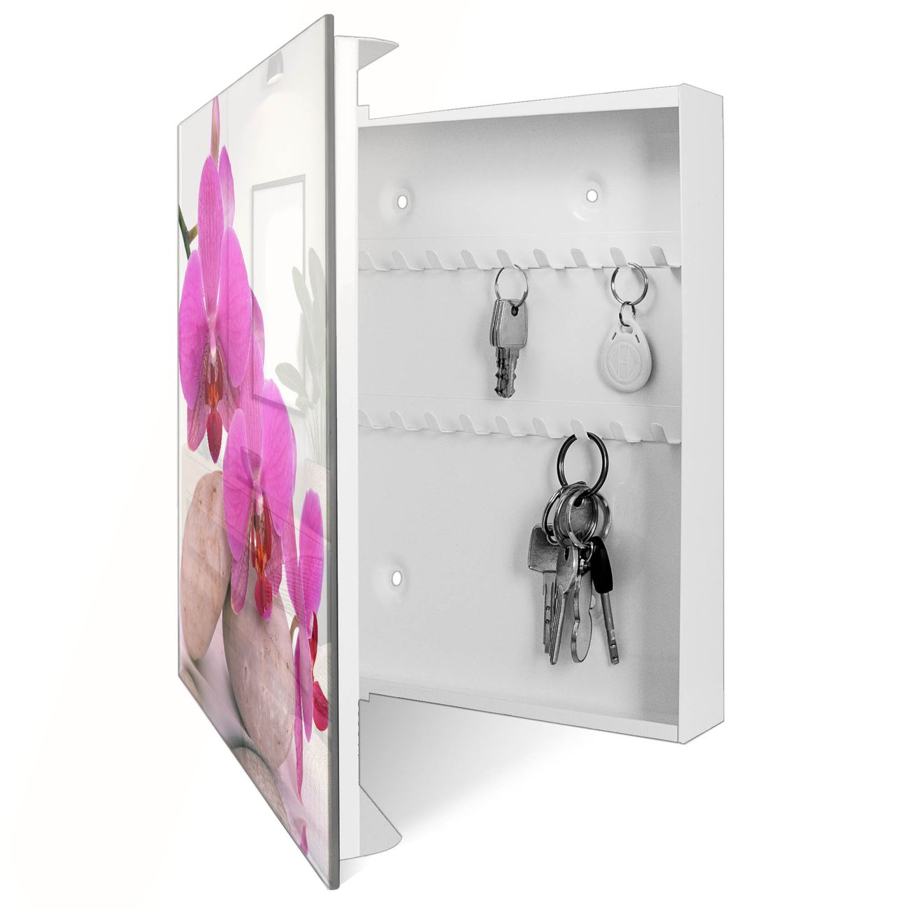 Bringe Ordnung und Eleganz in deinen Eingangsbereich mit dem banjado Schlüsselkasten Motiv Motiv Orchidee. Die moderne Schlüsselbox kombiniert funktionales Design mit hochwertiger Verarbeitung und wird so zu einem echten Hingucker in Flur, Büro oder Ferienwohnung. ✅ Stilvolle Schlüsselaufbewahrung mit Glasfront im Motiv Motiv Orchidee Der Design-Schlüsselkasten Motiv Motiv Orchidee bietet Platz für bis zu 50 Schlüssel, die auf 5 stabilen Reihen mit je 10 Haken übersichtlich verstaut werden. Mit seinen kompakten Maßen von 30 x 30 x 5 cm passt die Schlüsselbox perfekt auch in kleinere Räume. Der weiß lackierte Stahlkorpus mit rechts angeschlagenem Türscharnier harmoniert mit der Glasfront und fügt sich nahtlos in jedes Wohnambiente ein. Ob als Schlüsselorganizer für Zuhause oder als praktische Lösung für Büros, Praxen und Gewerbe, der banjado Schlüsselkasten sorgt für Ordnung und Übersicht. Dank der magnetischen, mit Kreidestiften beschreibbaren Glasfront kannst du Notizen anheften oder Termine direkt auf der Oberfläche festhalten. Die Schlüsselbox Motiv Motiv Orchidee zur Wandmontage wird inklusive Befestigungsmaterial geliefert und ist schnell angebracht. So hast du deine Schlüssel jederzeit griffbereit und zugleich stilvoll verstaut. Mit diesem banjado Schlüsselkasten Motiv Motiv Orchidee kombinierst du praktische Aufbewahrung mit stilvollem Wohndesign. Ob privat oder geschäftlich, die Schlüsselbox sorgt für mehr Ordnung, Übersicht und ein wohnliches Ambiente.Vorteile im Überblick