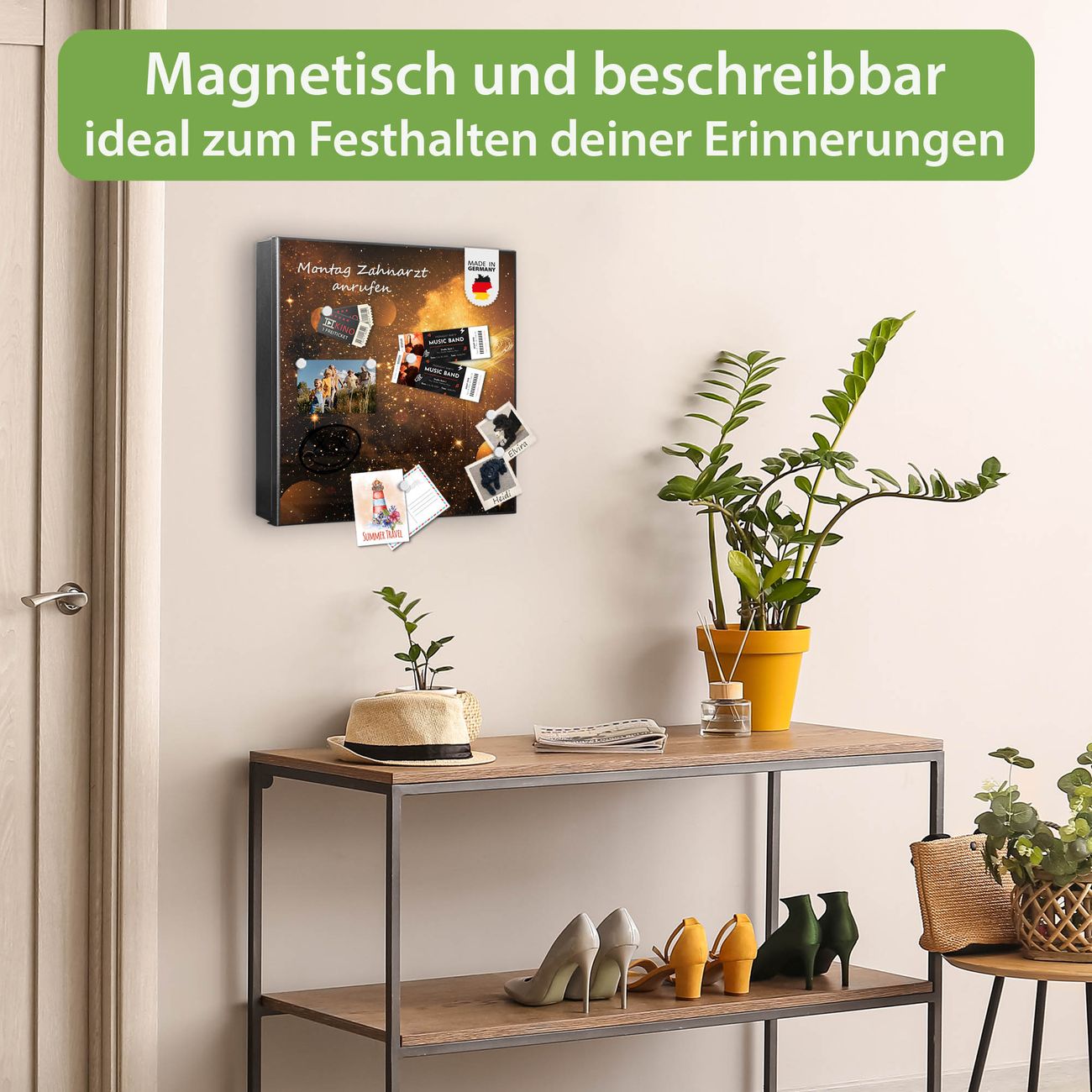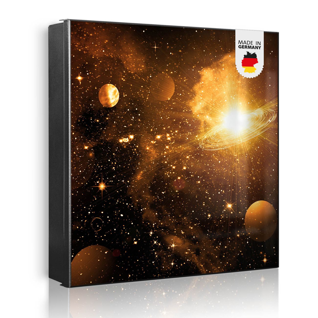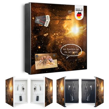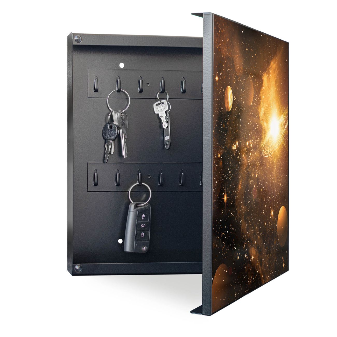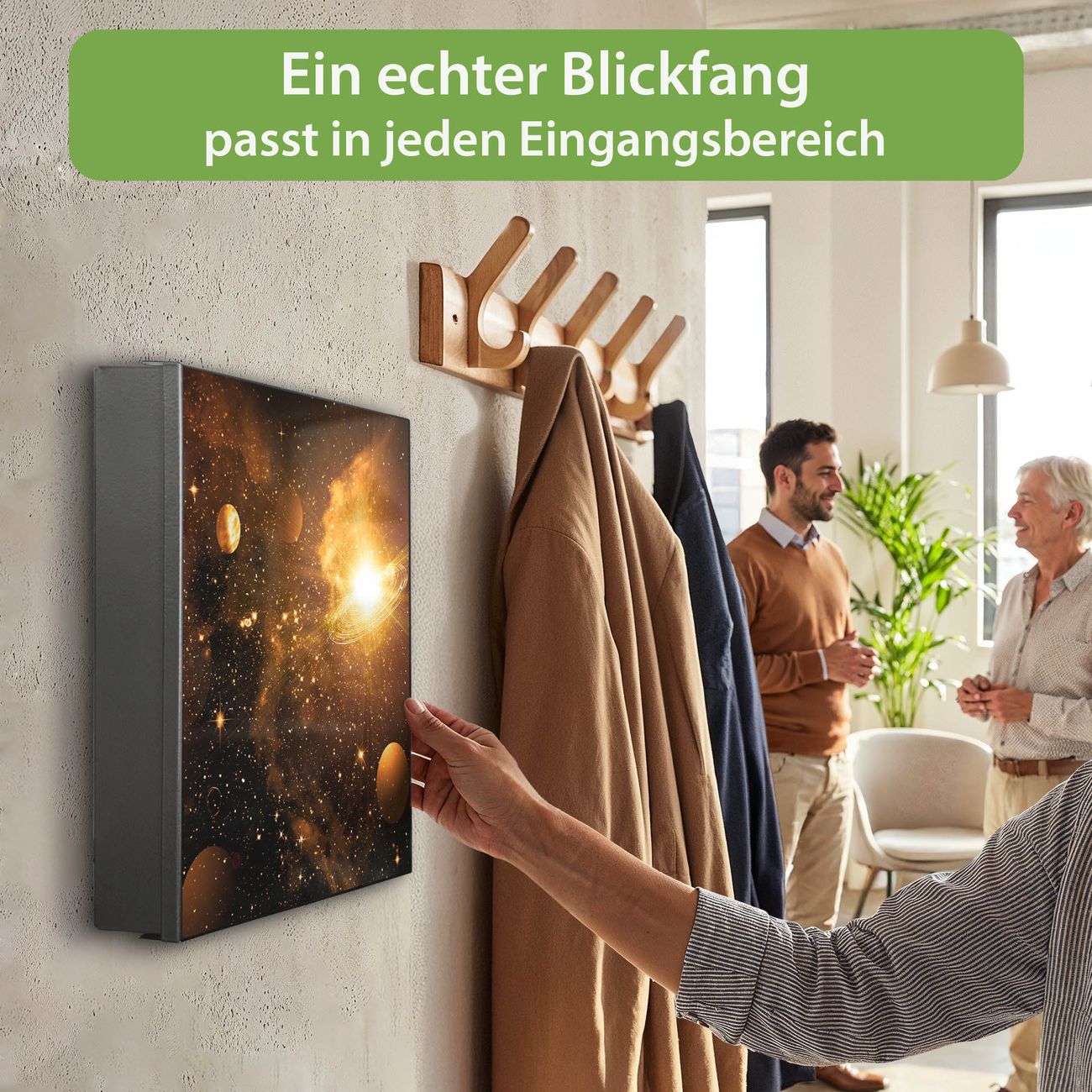 Bringe Ordnung und Eleganz in deinen Eingangsbereich mit dem banjado Schlüsselkasten Motiv Motiv Outer Space. Die moderne Schlüsselbox kombiniert funktionales Design mit hochwertiger Verarbeitung und wird so zu einem echten Hingucker in Flur, Büro oder Ferienwohnung. ✅ Stilvolle Schlüsselaufbewahrung mit Motiv Motiv Outer Space Der Design-Schlüsselkasten Motiv Motiv Outer Space bietet Platz für bis zu 32 Schlüssel, die auf 4 stabilen Reihen mit je 8 Haken übersichtlich verstaut werden. Mit seinen kompakten Maßen von 30 x 30 x 5 cm passt die Schlüsselbox perfekt auch in kleinere Räume. Der schwarz lackierte Stahlkorpus mit rechts angeschlagenem Türscharnier harmoniert mit gedruckten Folie auf der Front und fügt sich nahtlos in jedes Wohnambiente ein. Ob als Schlüsselorganizer für Zuhause oder als praktische Lösung für Büros, Praxen und Gewerbe, der banjado Schlüsselkasten sorgt für Ordnung und Übersicht. Dank der magnetischen, mit Kreidestiften beschreibbaren Folie auf der Front kannst du Notizen anheften oder Termine direkt auf der Oberfläche festhalten. Die Schlüsselbox Motiv Motiv Outer Space zur Wandmontage wird inklusive Befestigungsmaterial geliefert und ist schnell angebracht. So hast du deine Schlüssel jederzeit griffbereit und zugleich stilvoll verstaut. Mit diesem banjado Schlüsselkasten Motiv Motiv Outer Space kombinierst du praktische Aufbewahrung mit stilvollem Wohndesign. Ob privat oder geschäftlich, die Schlüsselbox sorgt für mehr Ordnung, Übersicht und ein wohnliches Ambiente.Vorteile im Überblick
